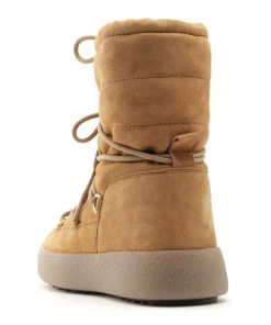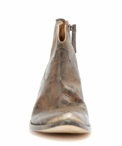 Bottines à talons en cuir lisse beige, style santiags. Jeux de découpes et de coutures. Bouts pointus.