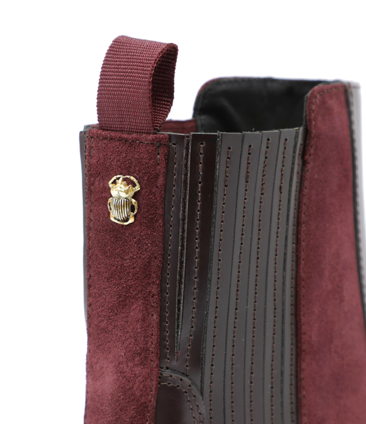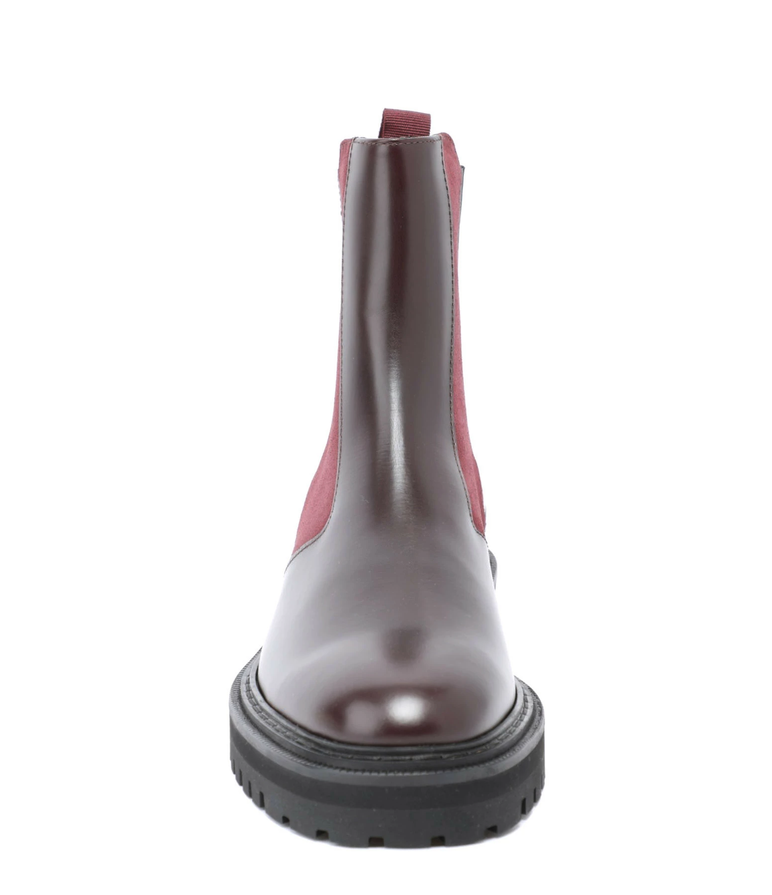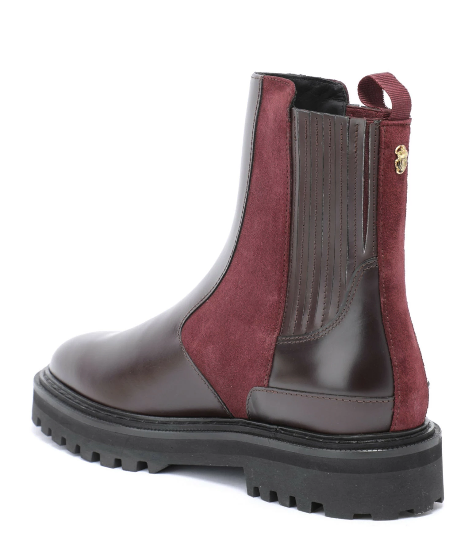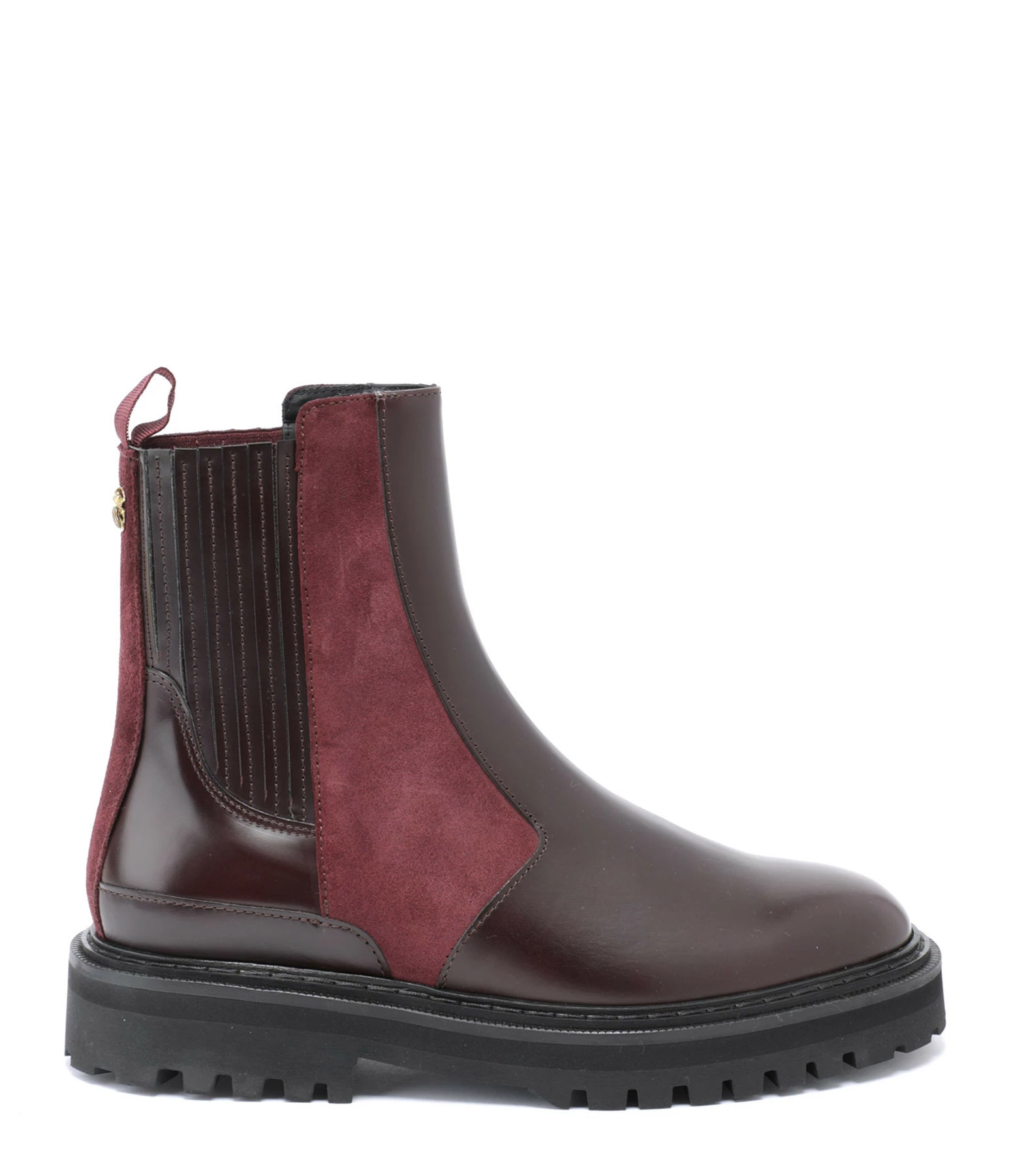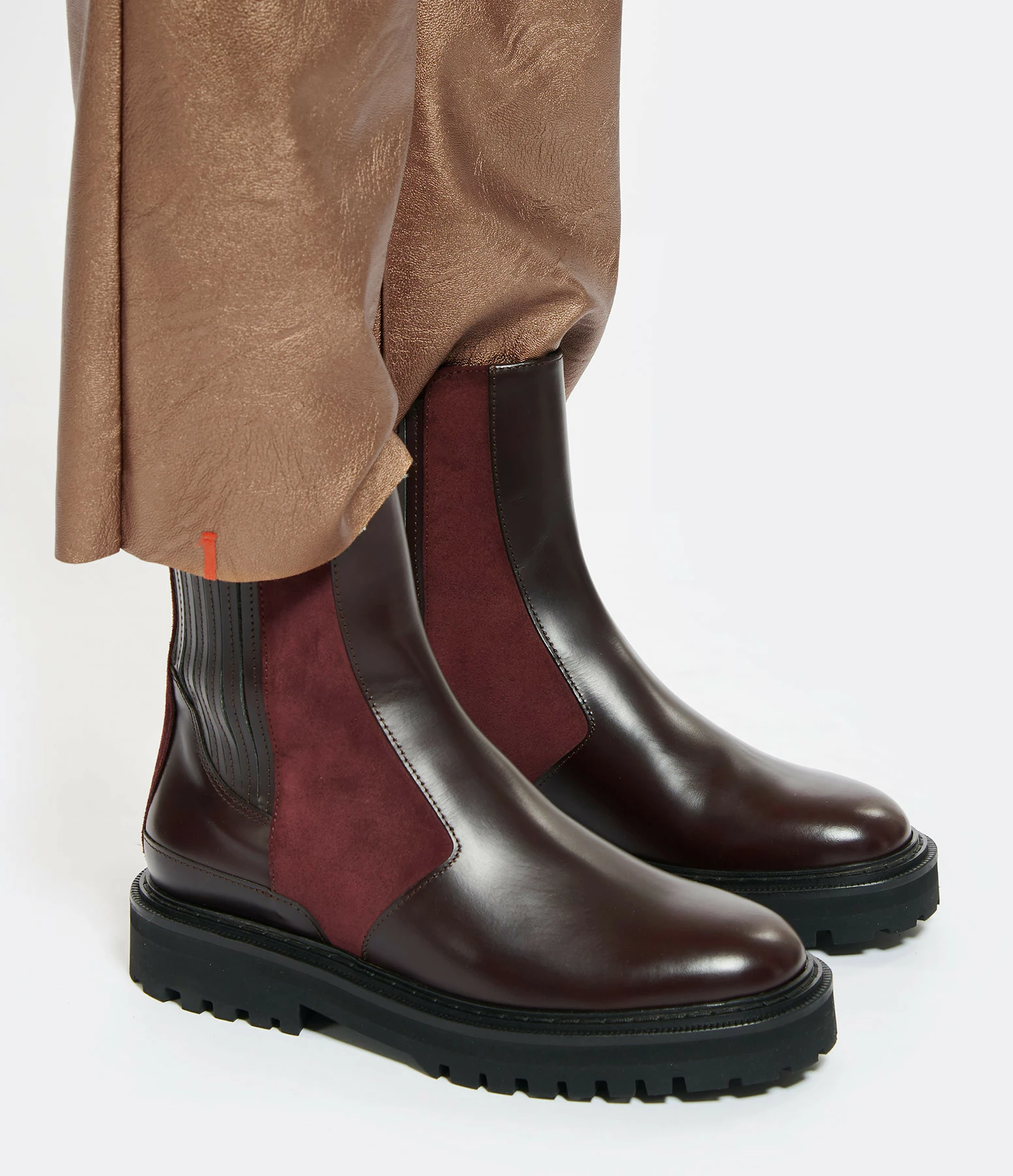 Bottines chelsea bi-matières bordeaux. Empiècement élastique sur les côtés. Semelle épaisse crantée en caoutchouc.