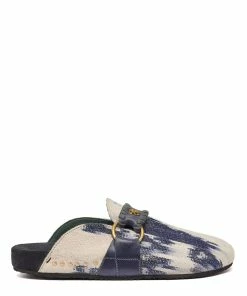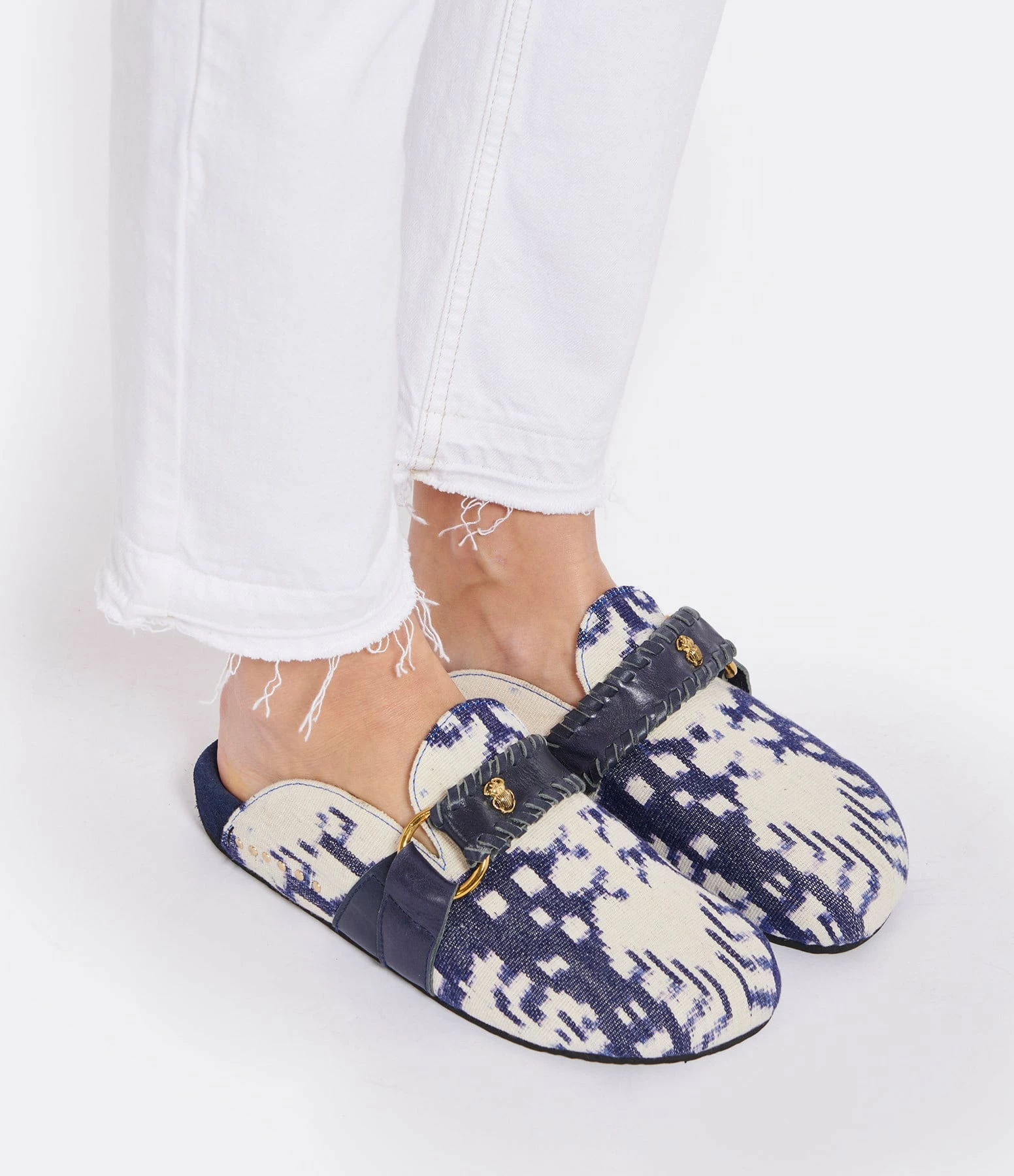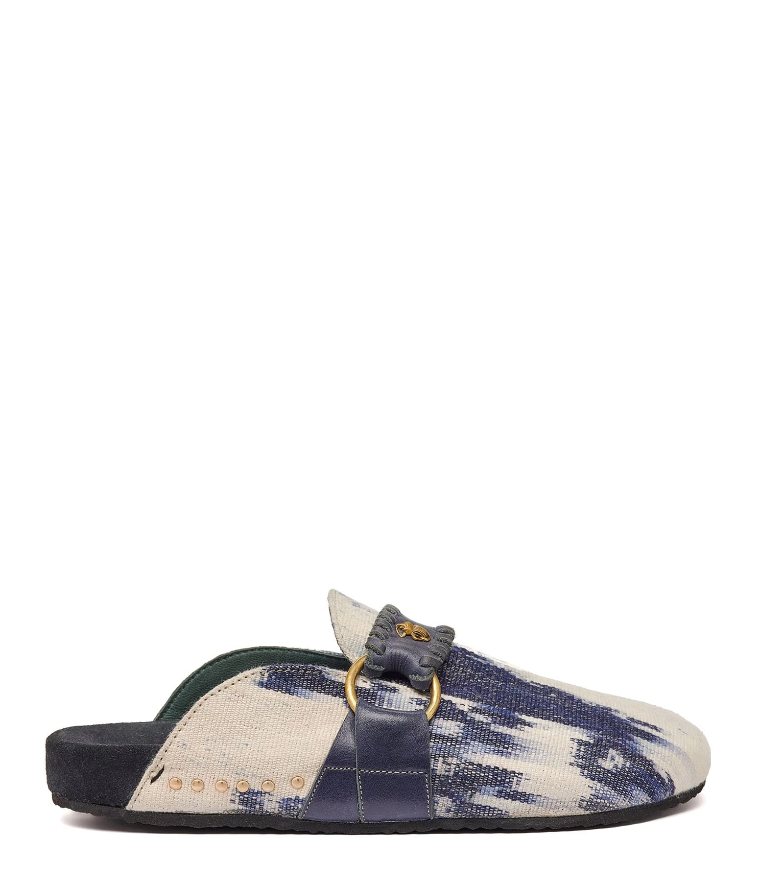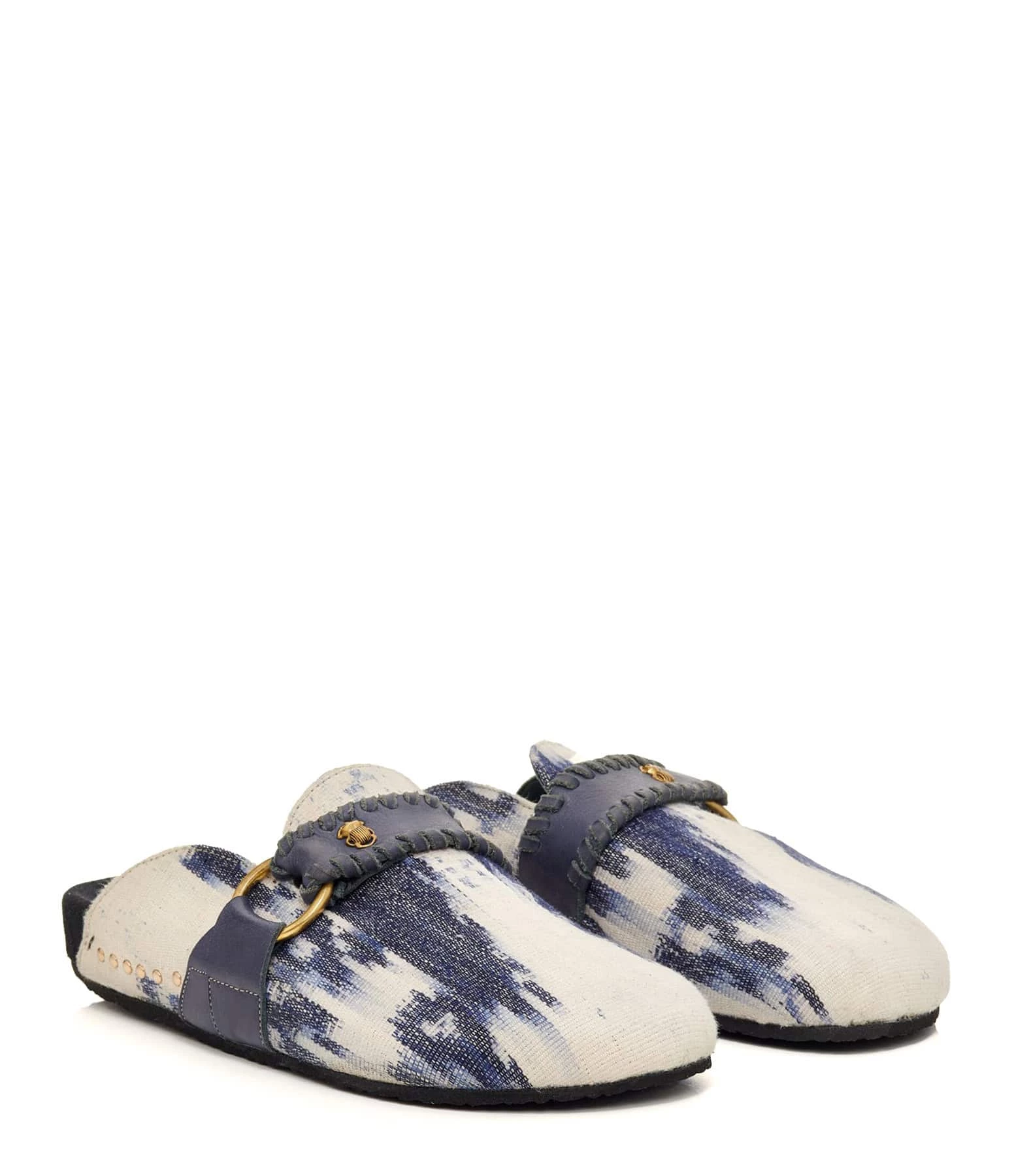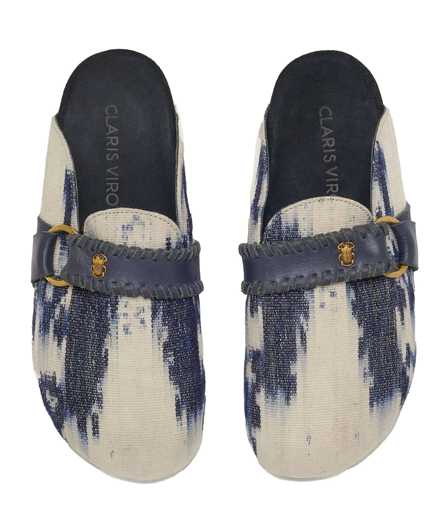 Sabots en cuir de python bleu, entièrement doublées de cuir. Une bride en cuir suédé noir avec scarabée dorée et boucle métallique doré. Bouts ronds.