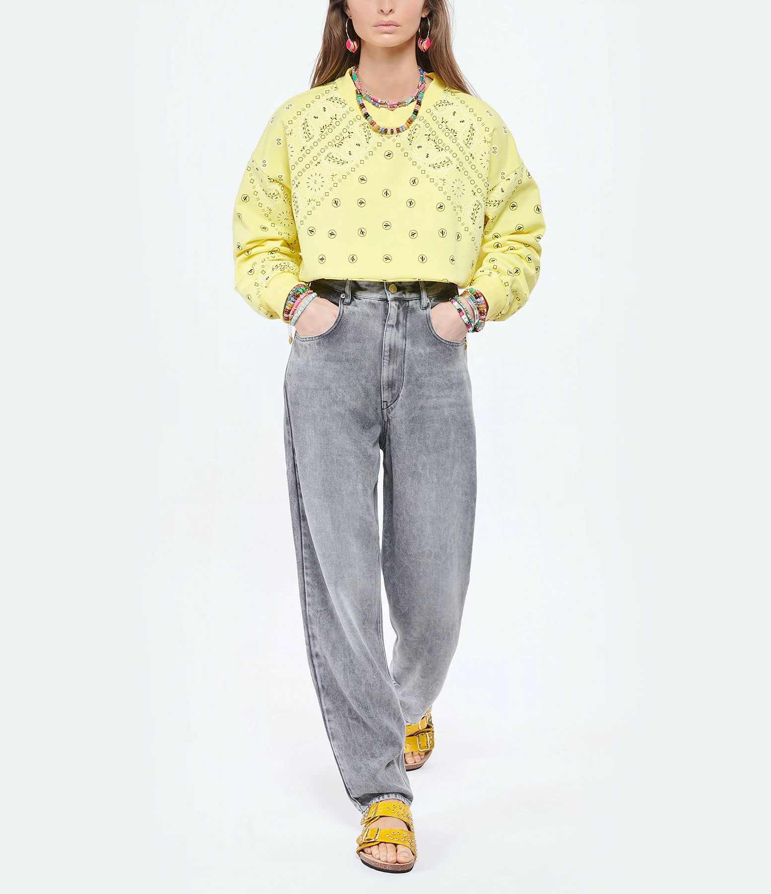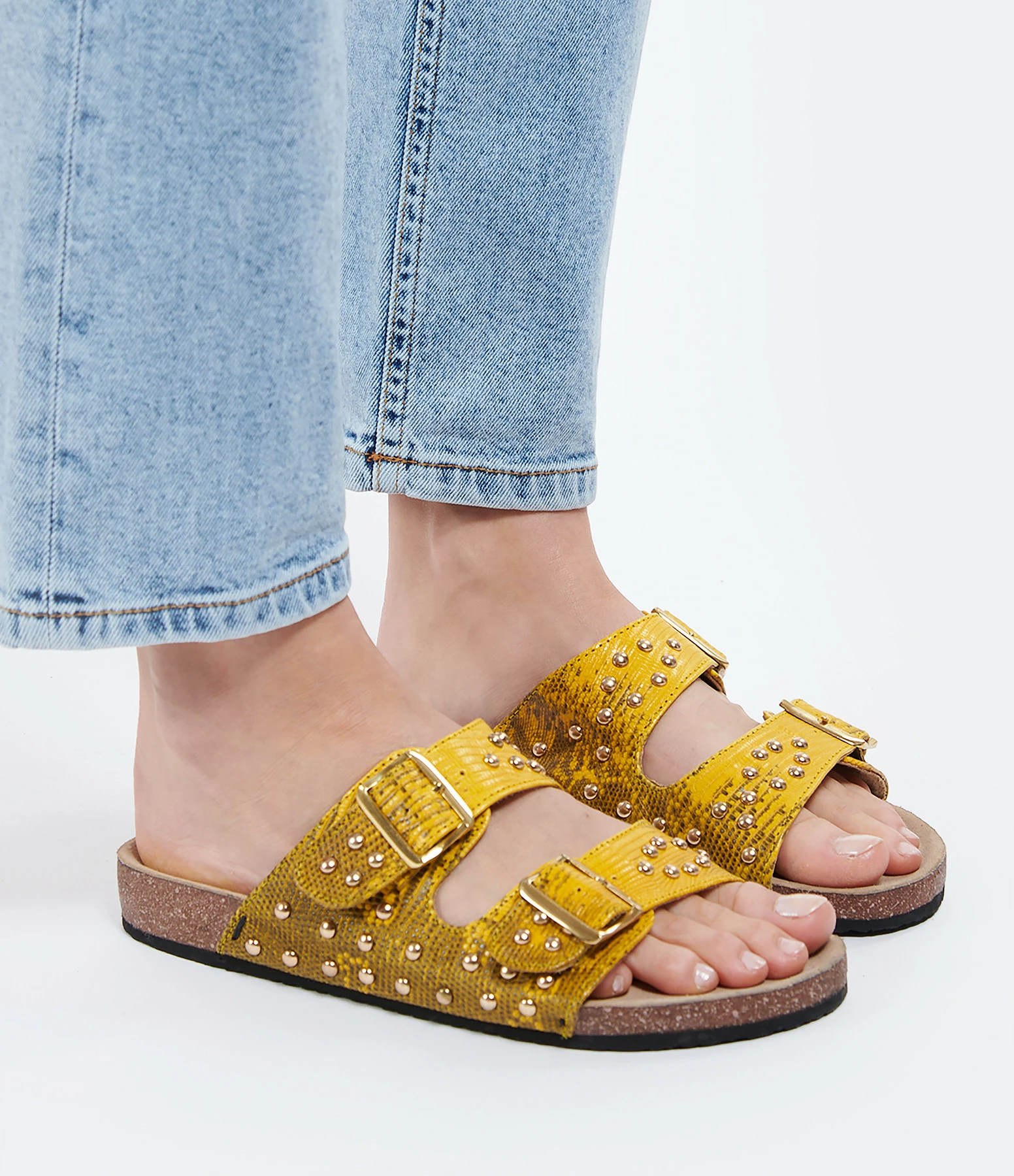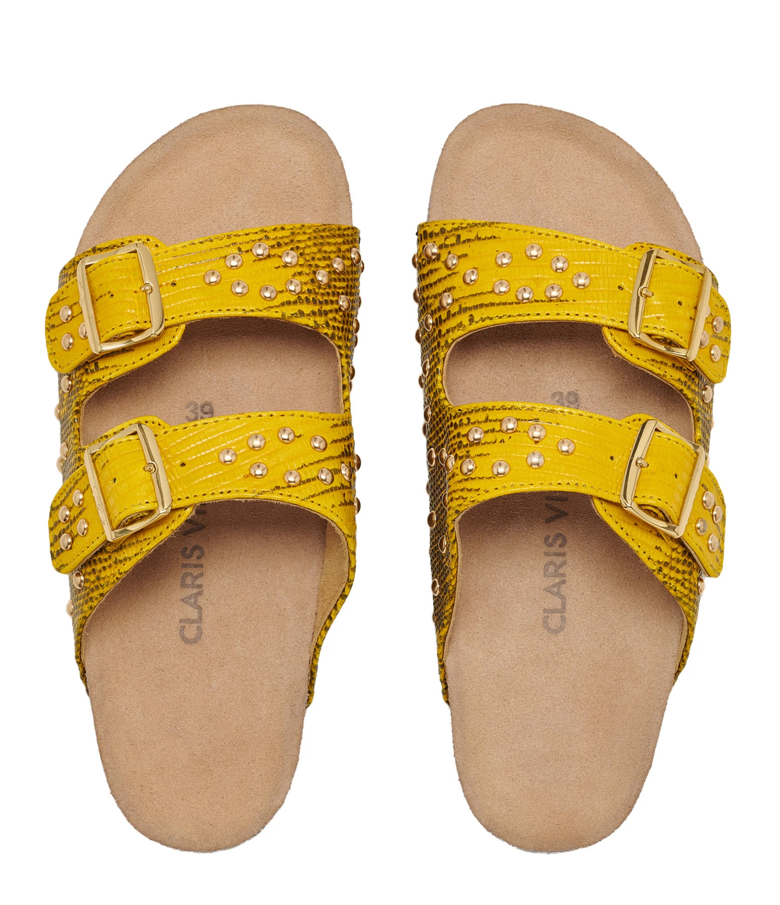 Sandales plates jaune en lézard cloutées. Brides réglables. Doublées cuir et ornées de deux boucles carrées en métal dorée.
