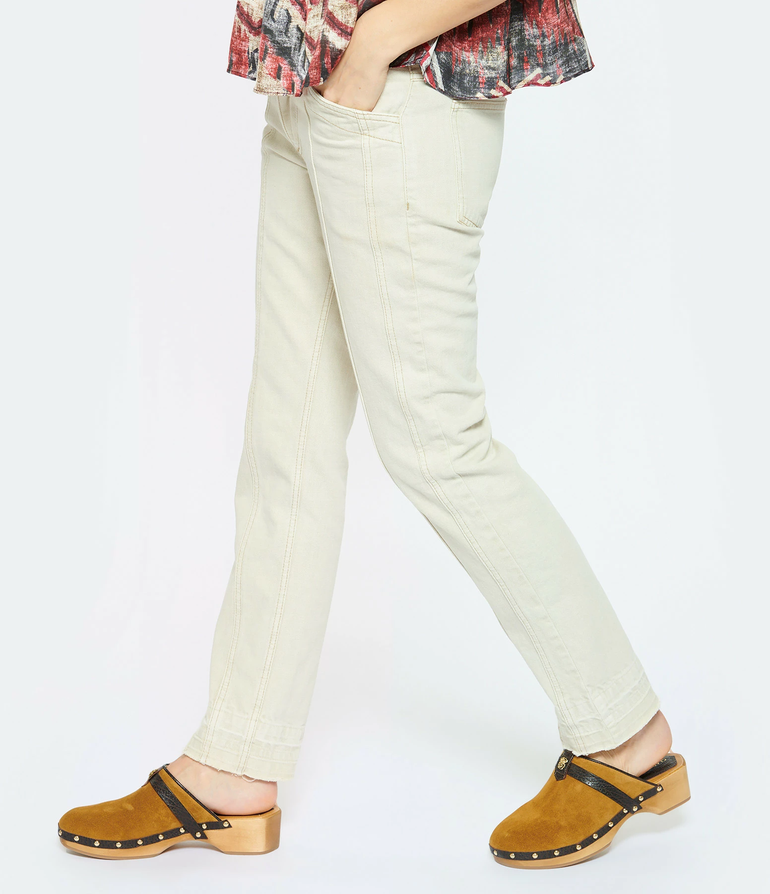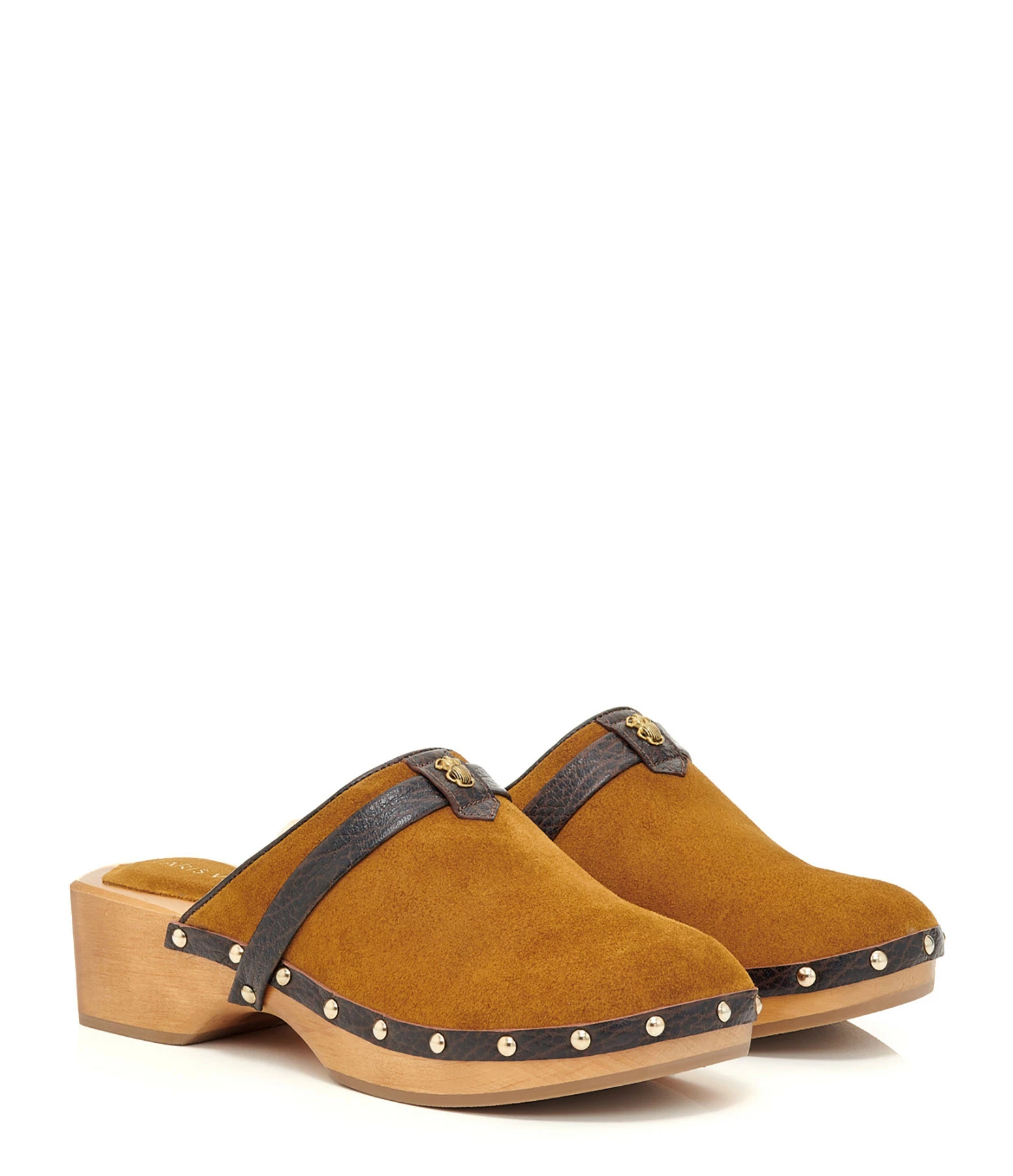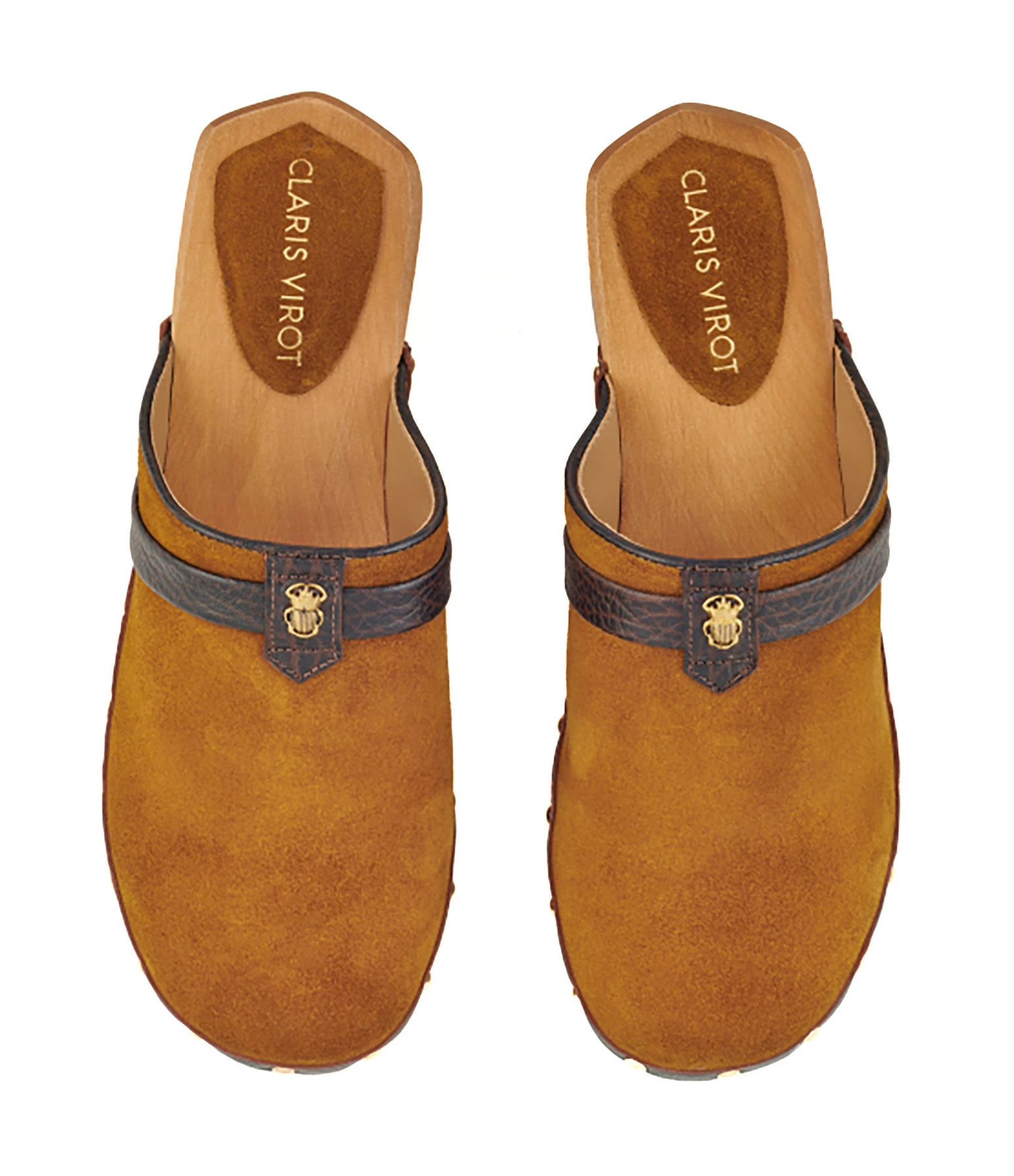 Sabots en cuir suédé marron. Semelles en bois. Détails en cuir grainé marron foncé. Mini scarabée doré à l’avant et clous sur les côtés.