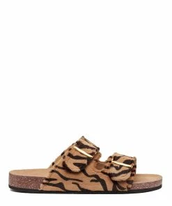 Sandales plates en pony imprimé tigre. Brides réglables. Doublées cuir et ornées de deux boucles carrées en métal dorée.