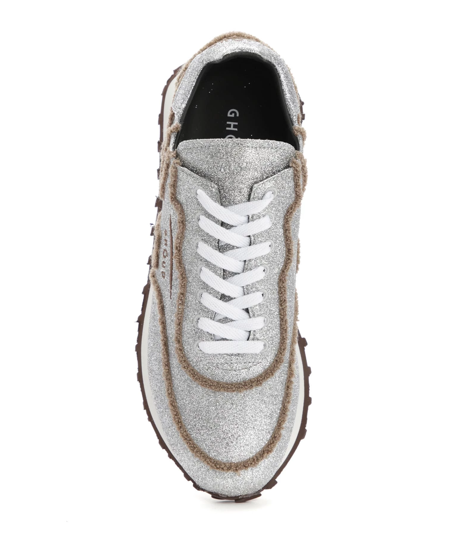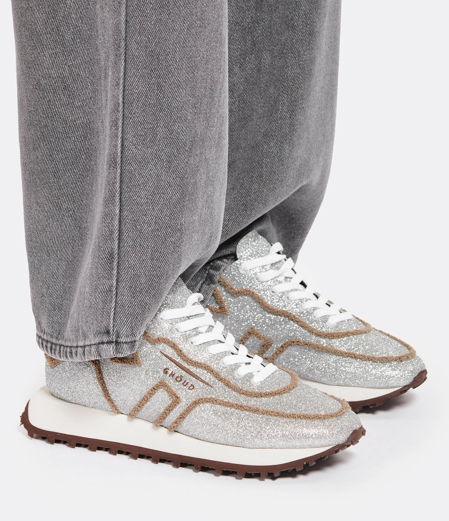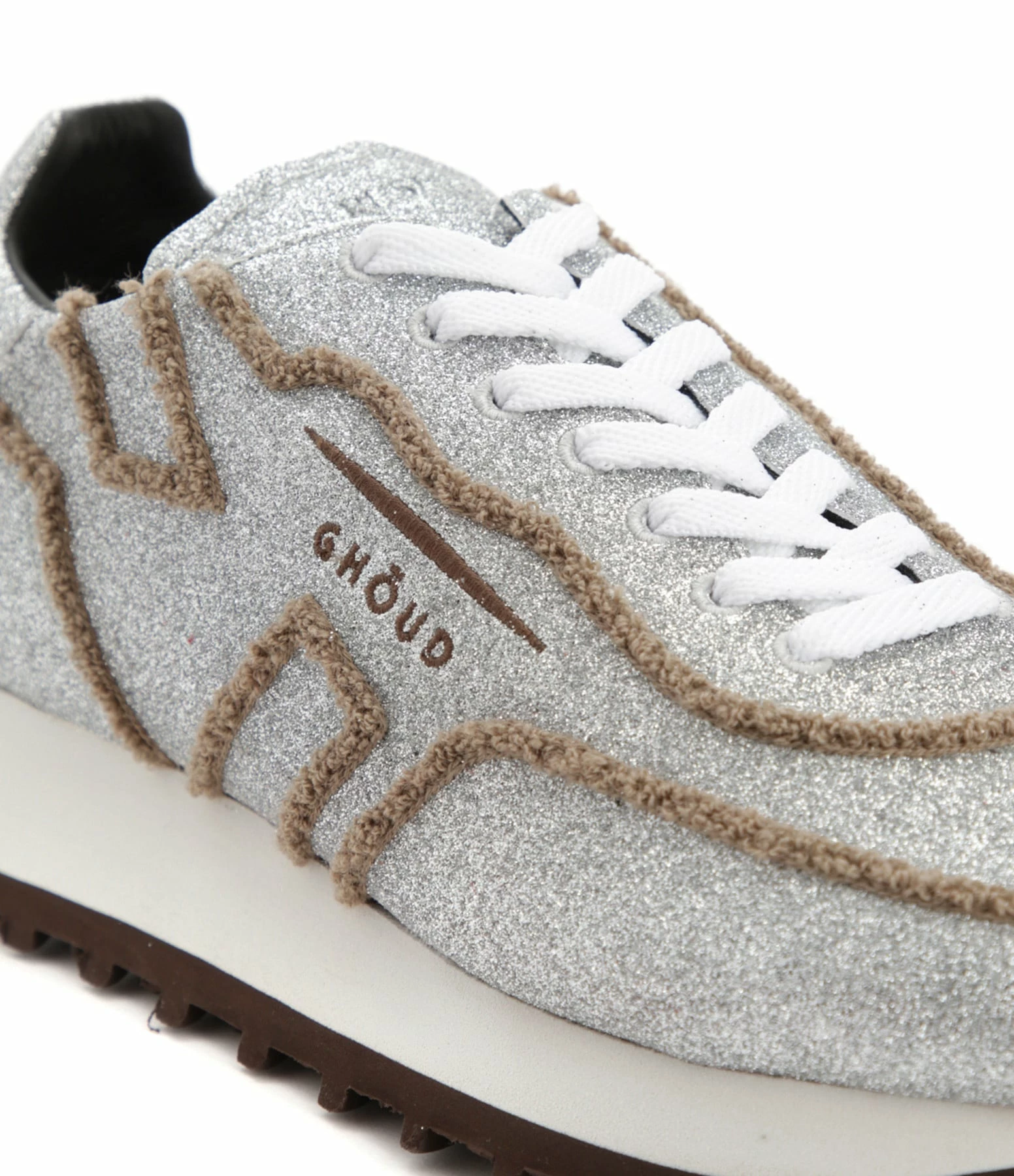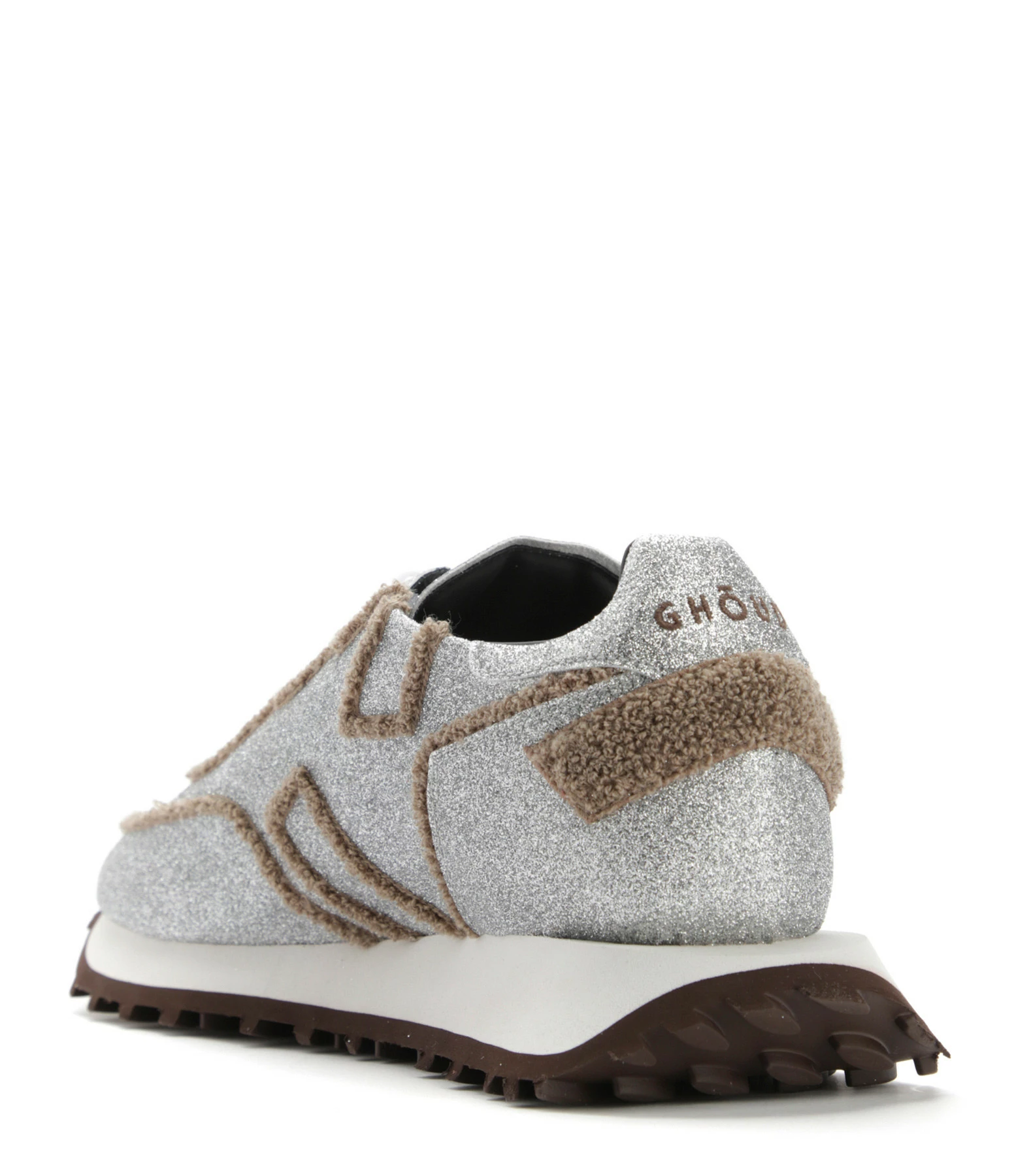 Baskets running pailletées argentées. Détails et empiècement en maille bouclette marron. Semelle en caoutchouc blanc.