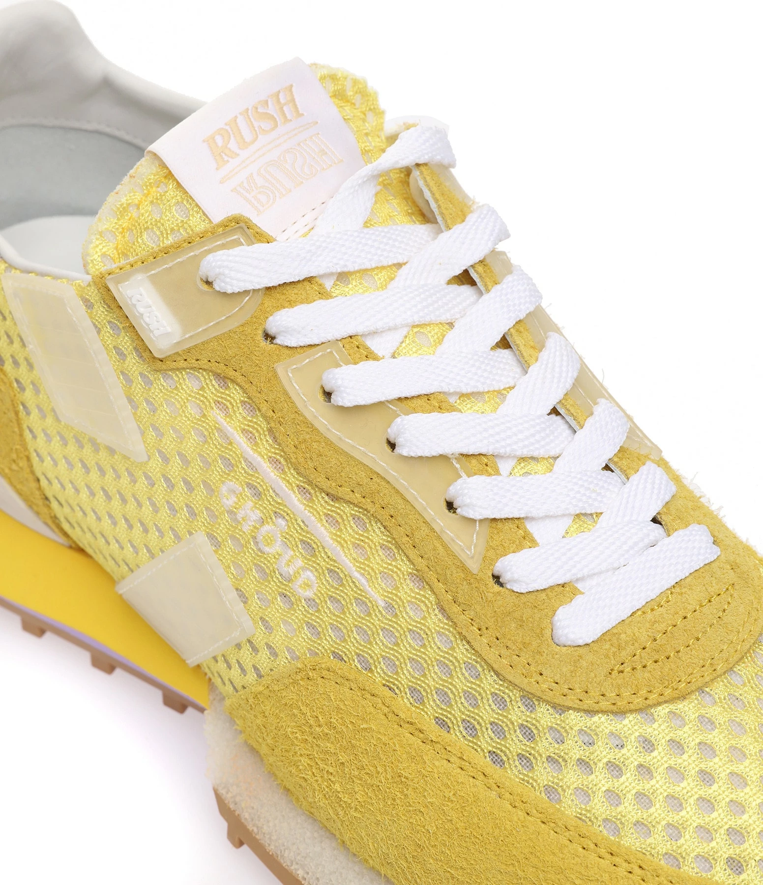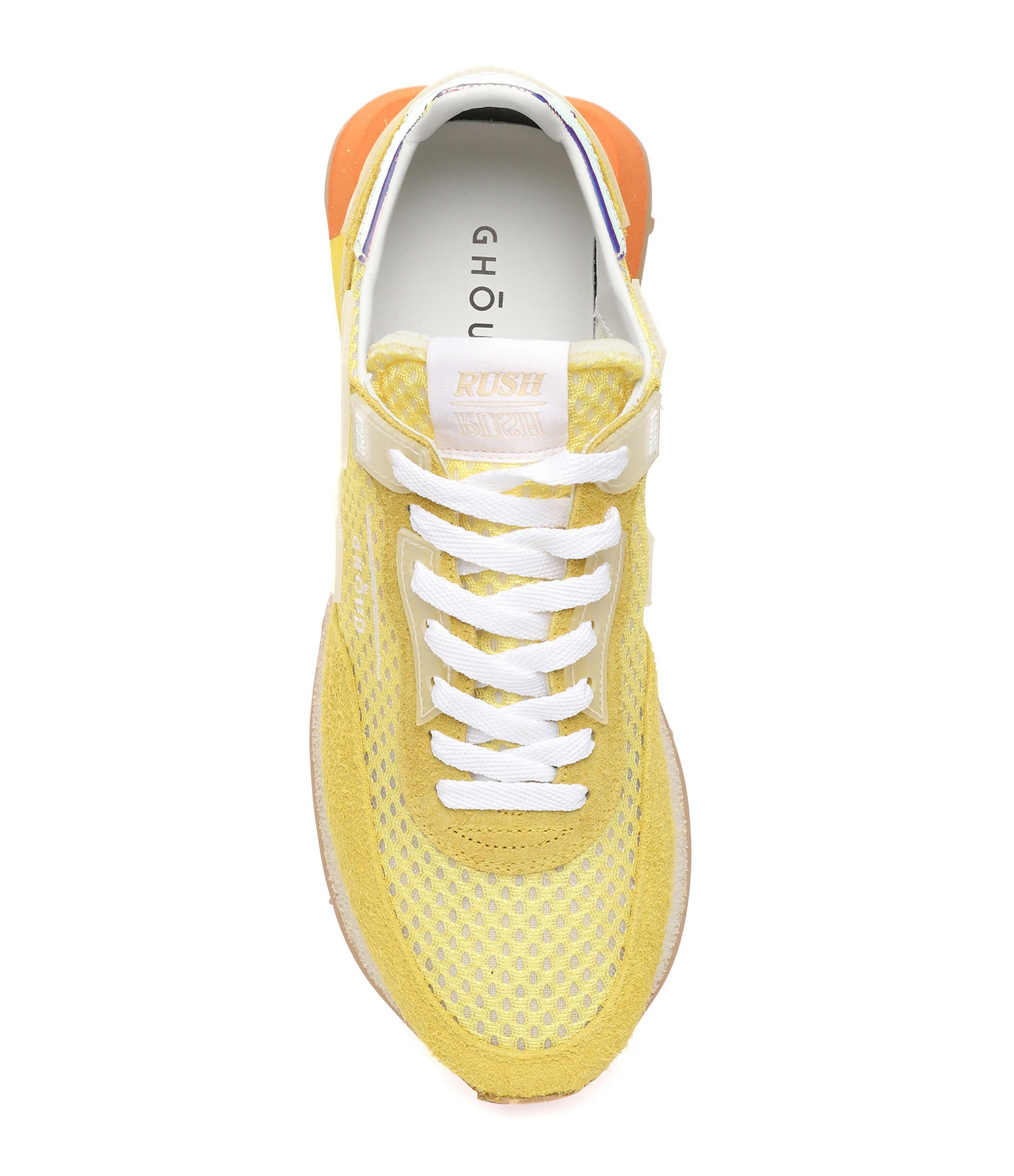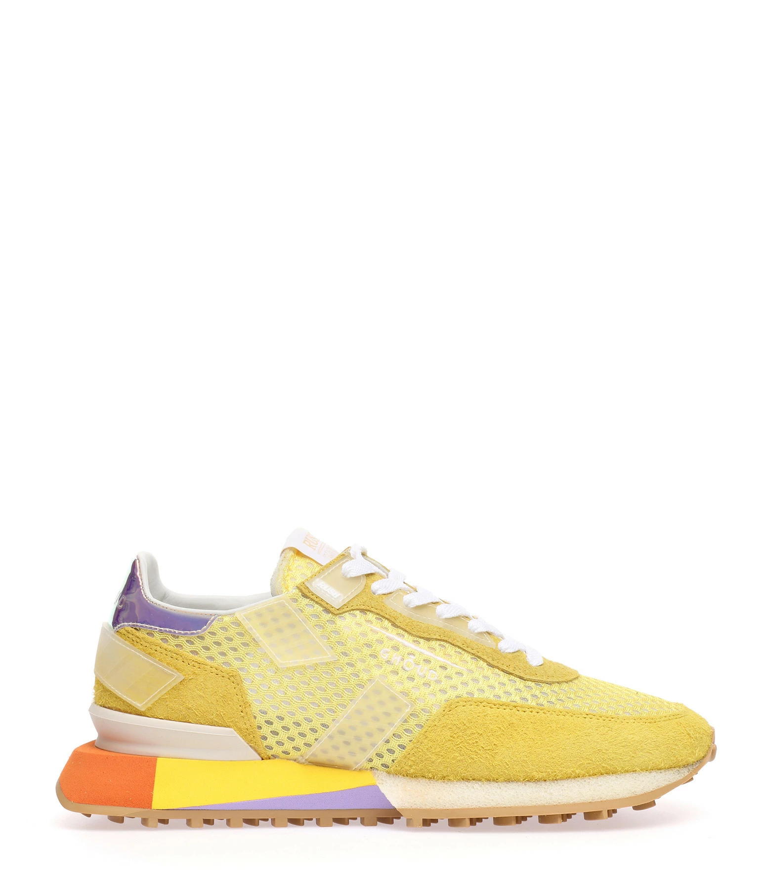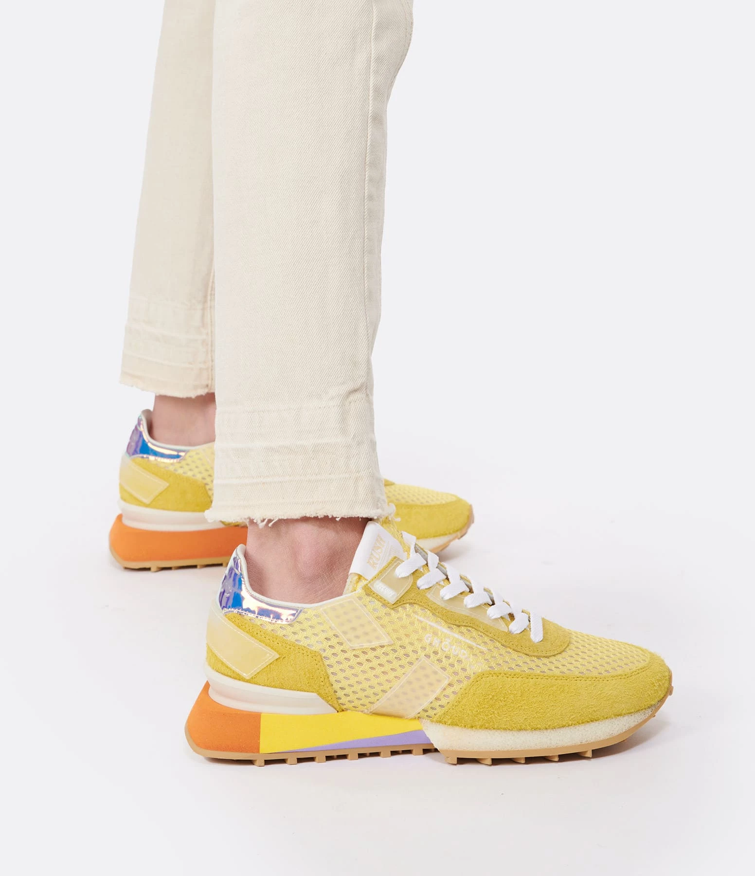 Baskets running jaune multi-matière avec des empiècements contrastants multicolores et transparents. Renfort talon en cuir caoutchouc holographique. Semelle en caoutchouc multicolore. Lacets blancs. Intérieur en cuir et maille bouclette.