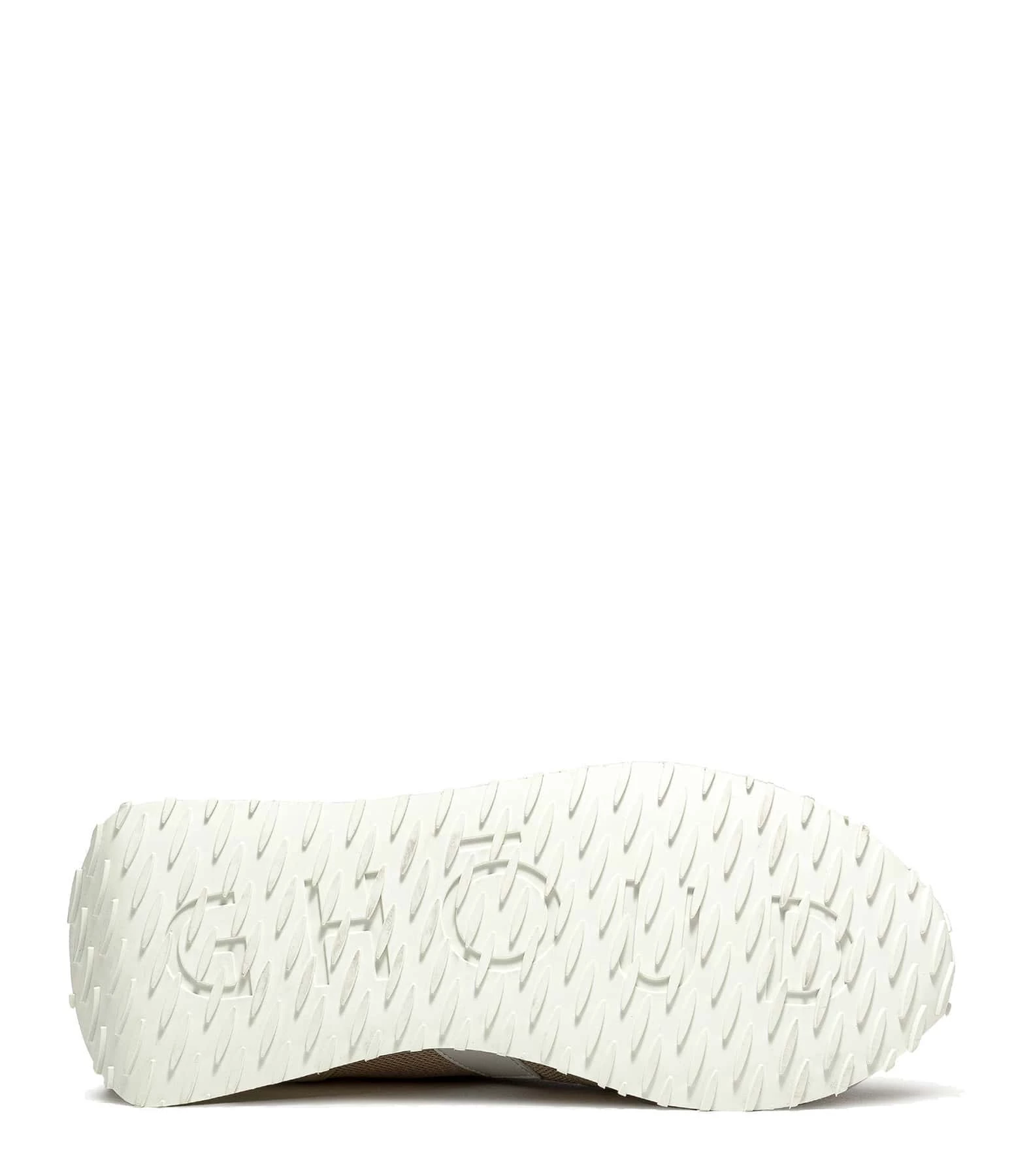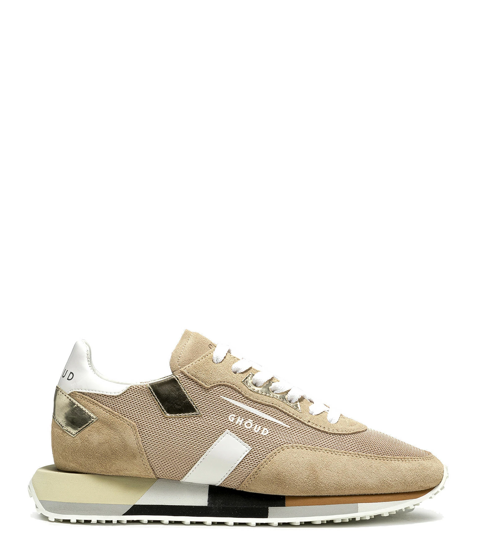 Baskets running beiges à empiècements contrastants bi-matières pour femme. Renfort talon en cuir blanc. Lacets blancs. Semelle en caoutchouc multicolore. Intérieur en cuir et maille bouclette.
