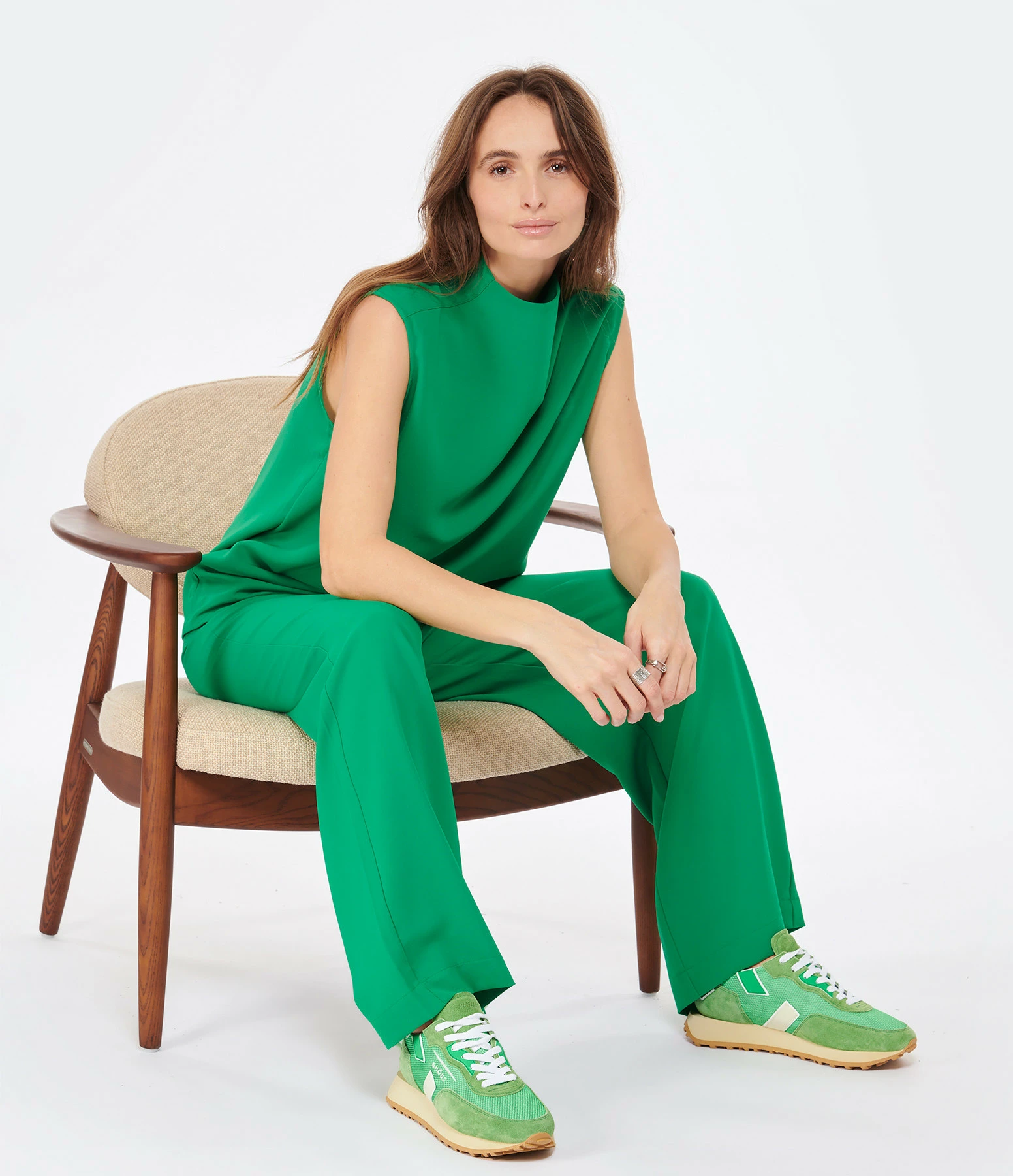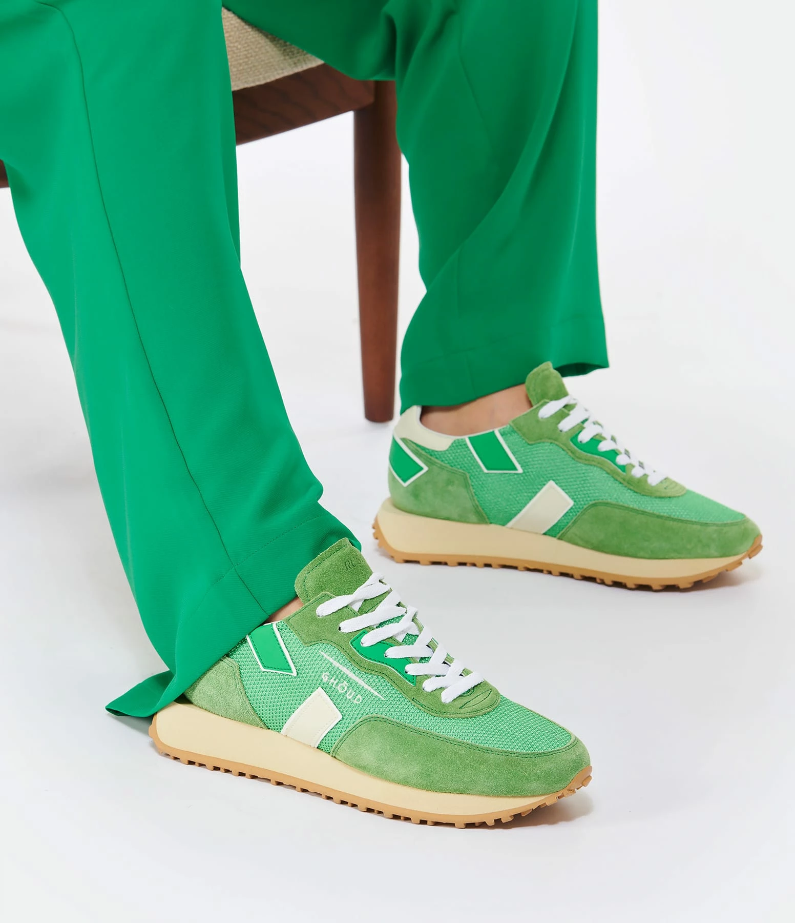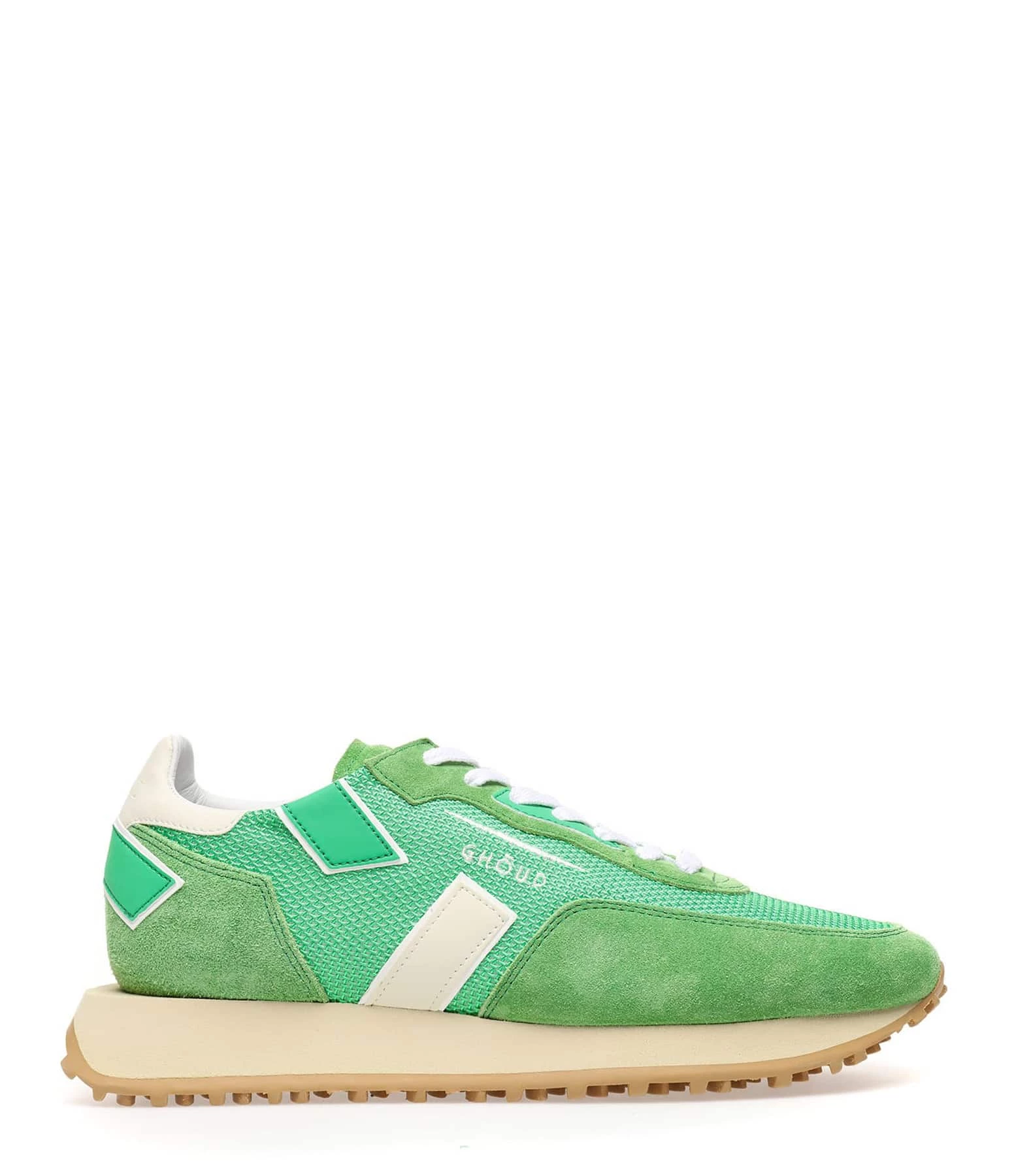 Baskets running verte multi-matière avec des empiècements contrastants en caoutchouc verts et blanc. Semelle en caoutchouc beige. Lacets blancs. Intérieur en cuir et maille bouclette.