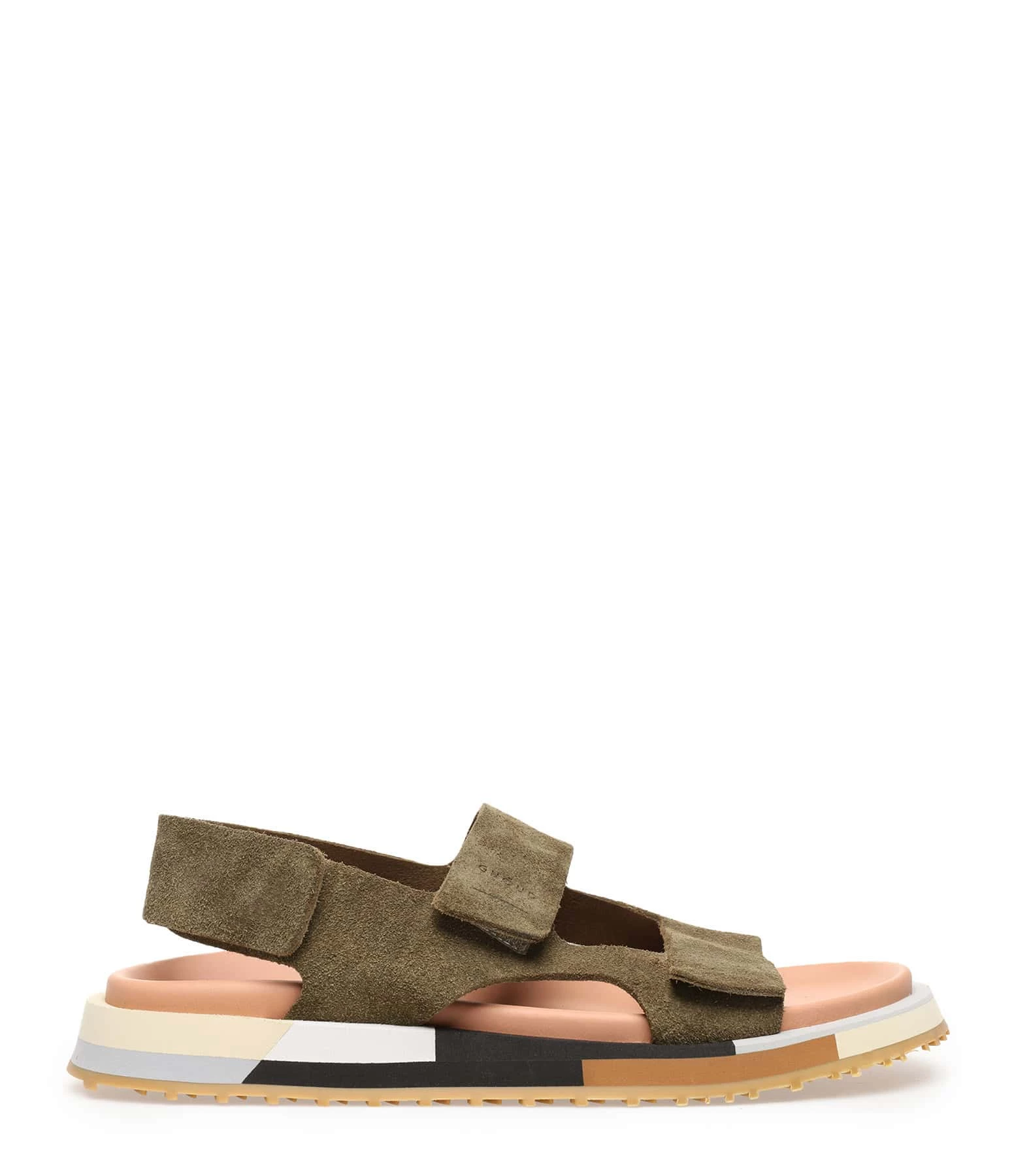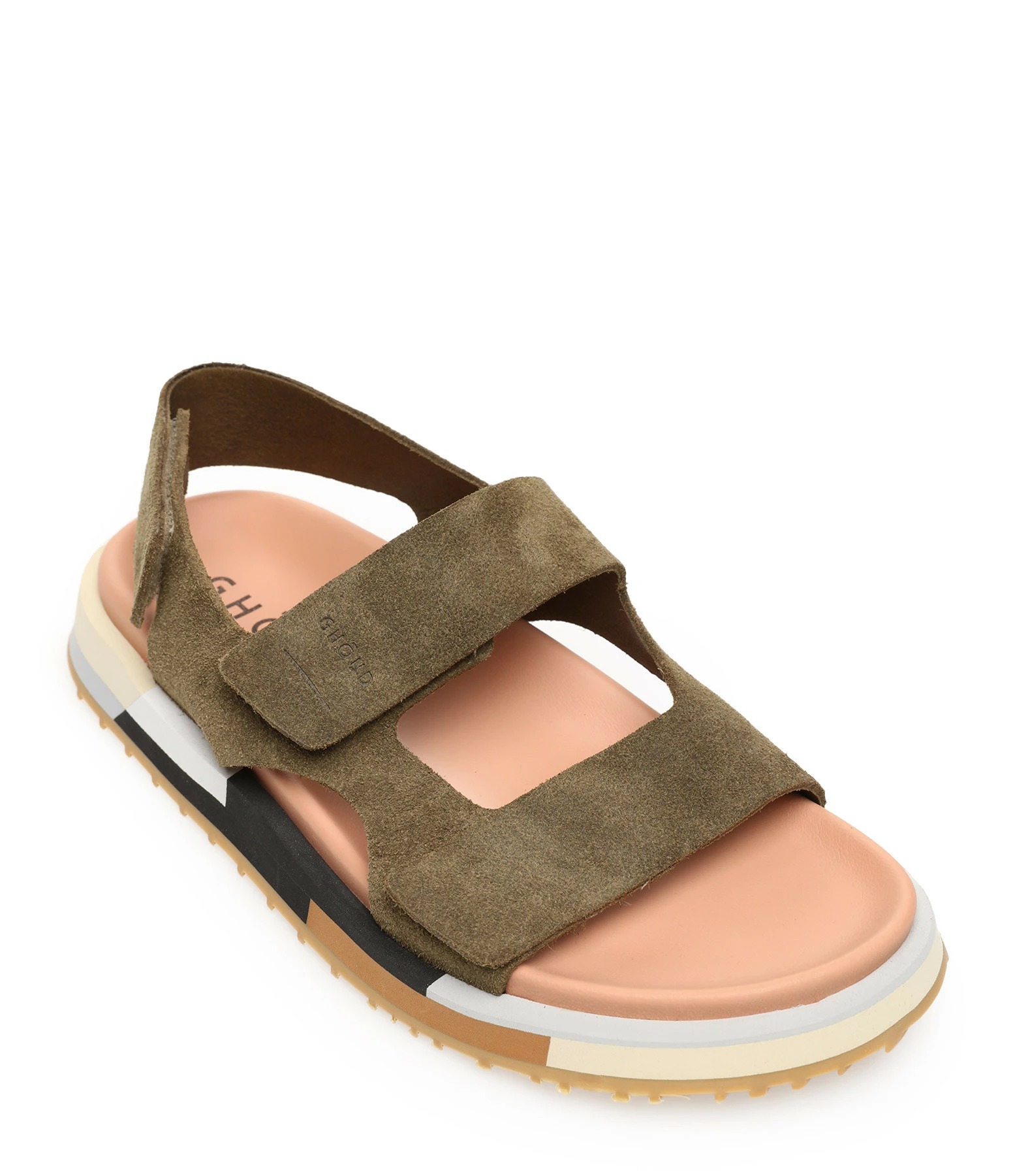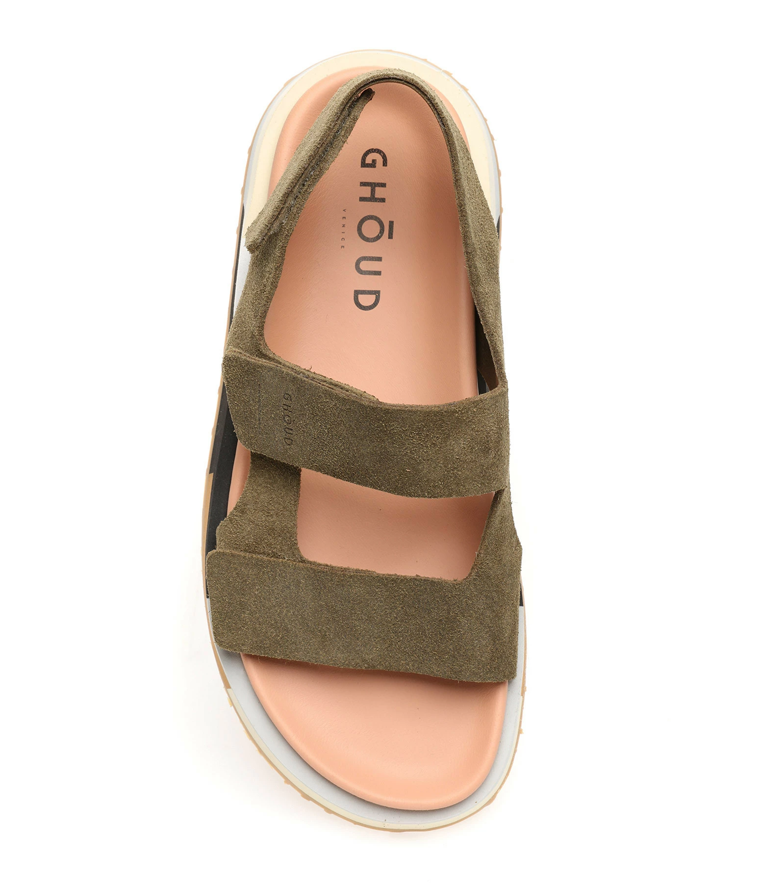 Sandales à brides à scratch en cuir suédé kaki. Semelle en caoutchouc multicolore. Logo GHOUD sur la bride. Attache à scratch autour de la cheville.