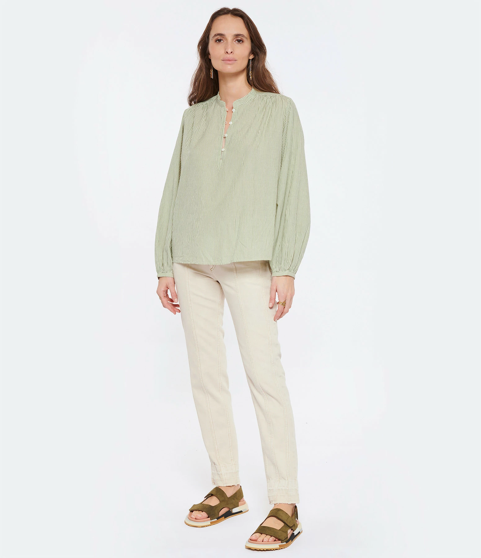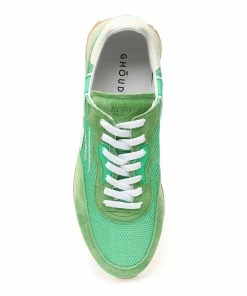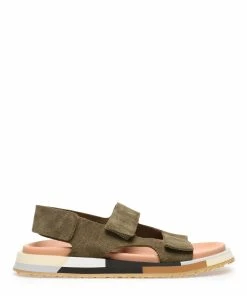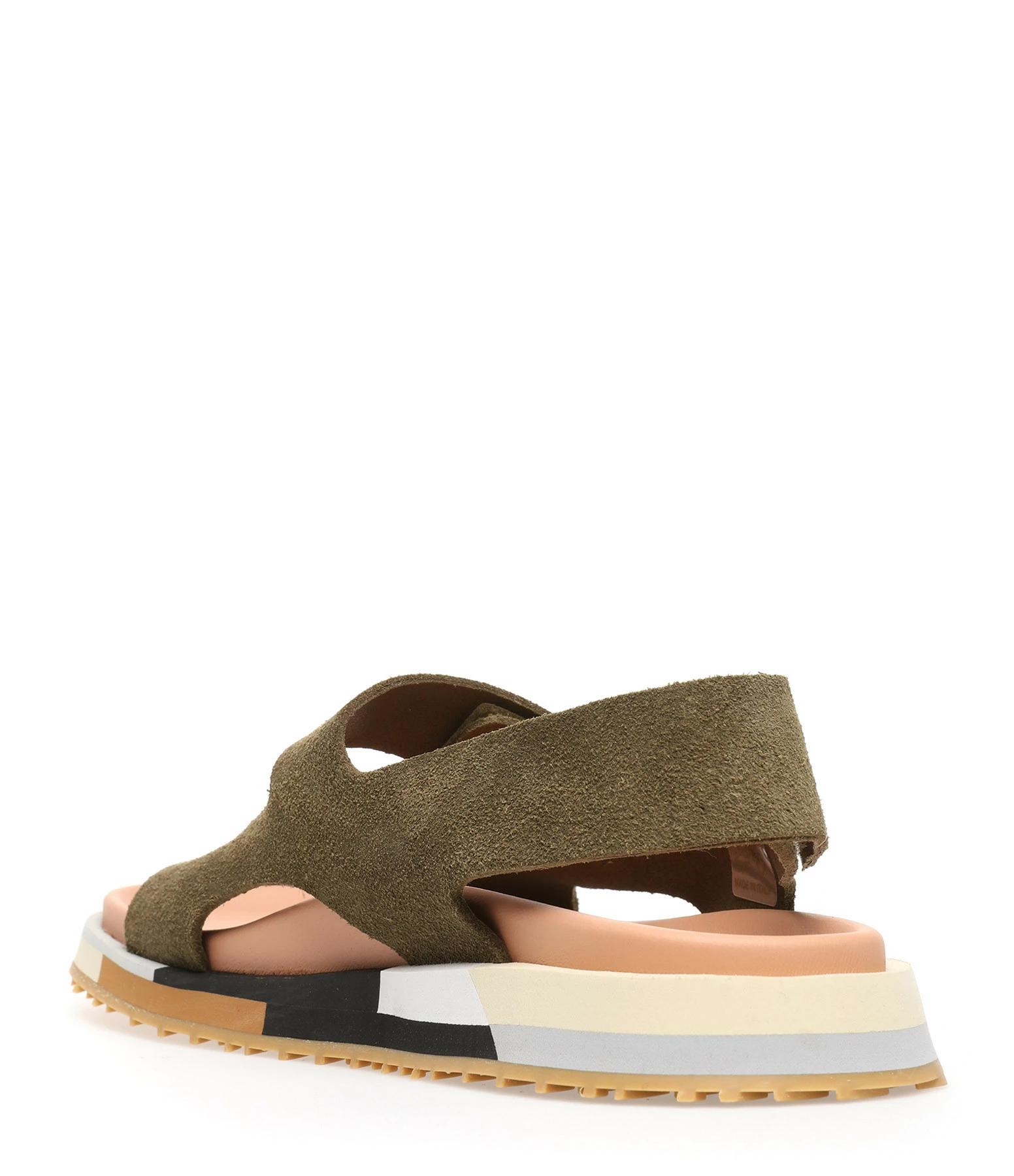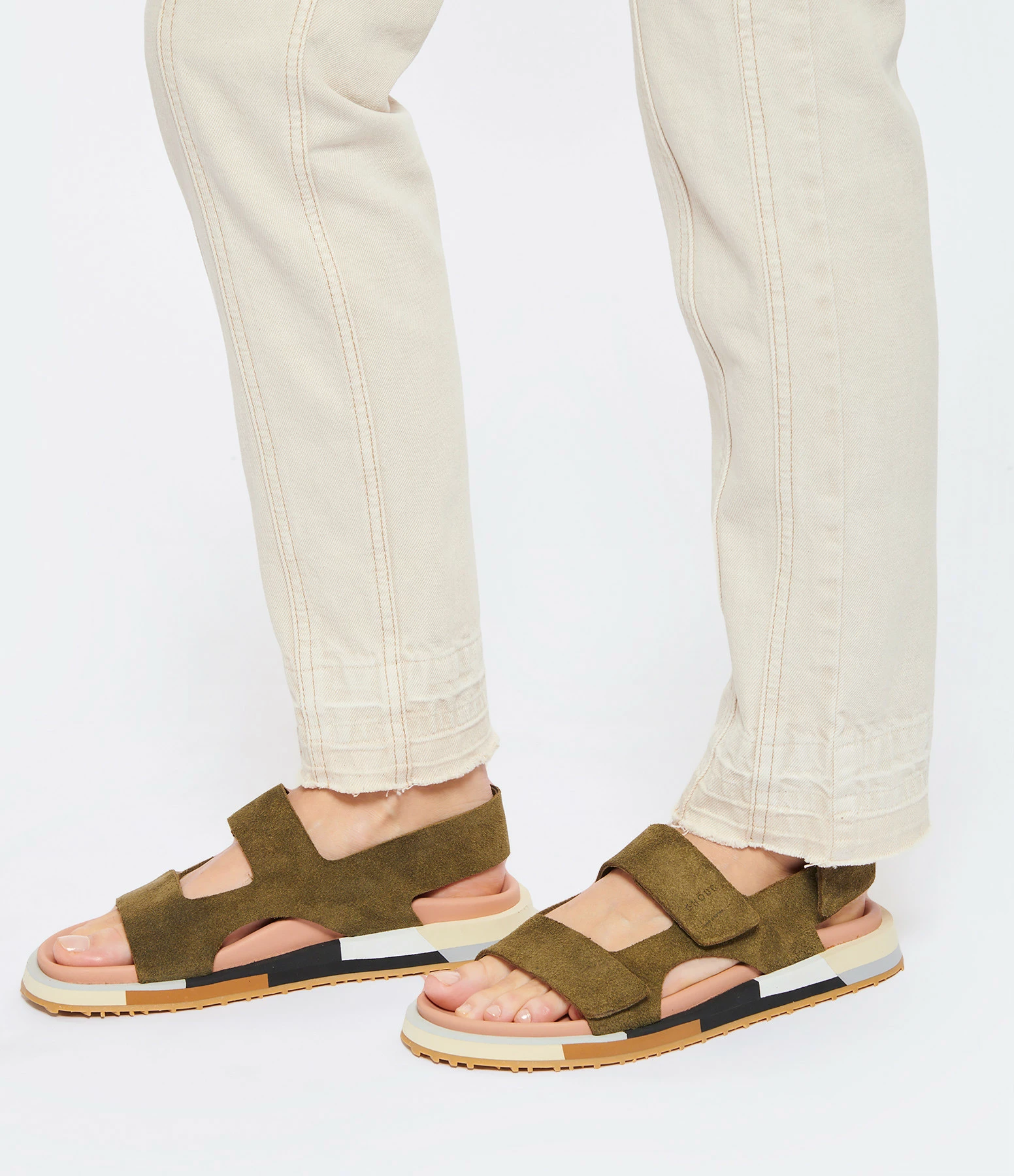 Sandales à brides à scratch en cuir suédé kaki. Semelle en caoutchouc multicolore. Logo GHOUD sur la bride. Attache à scratch autour de la cheville.