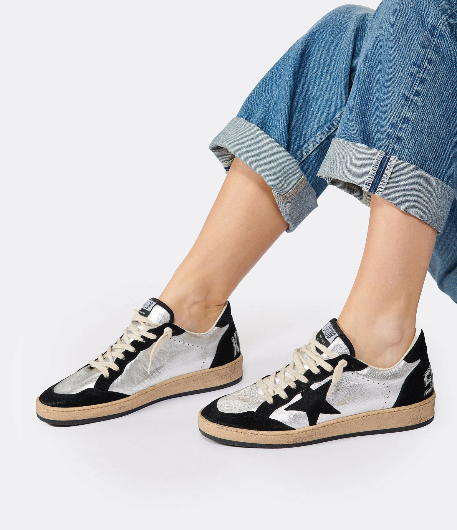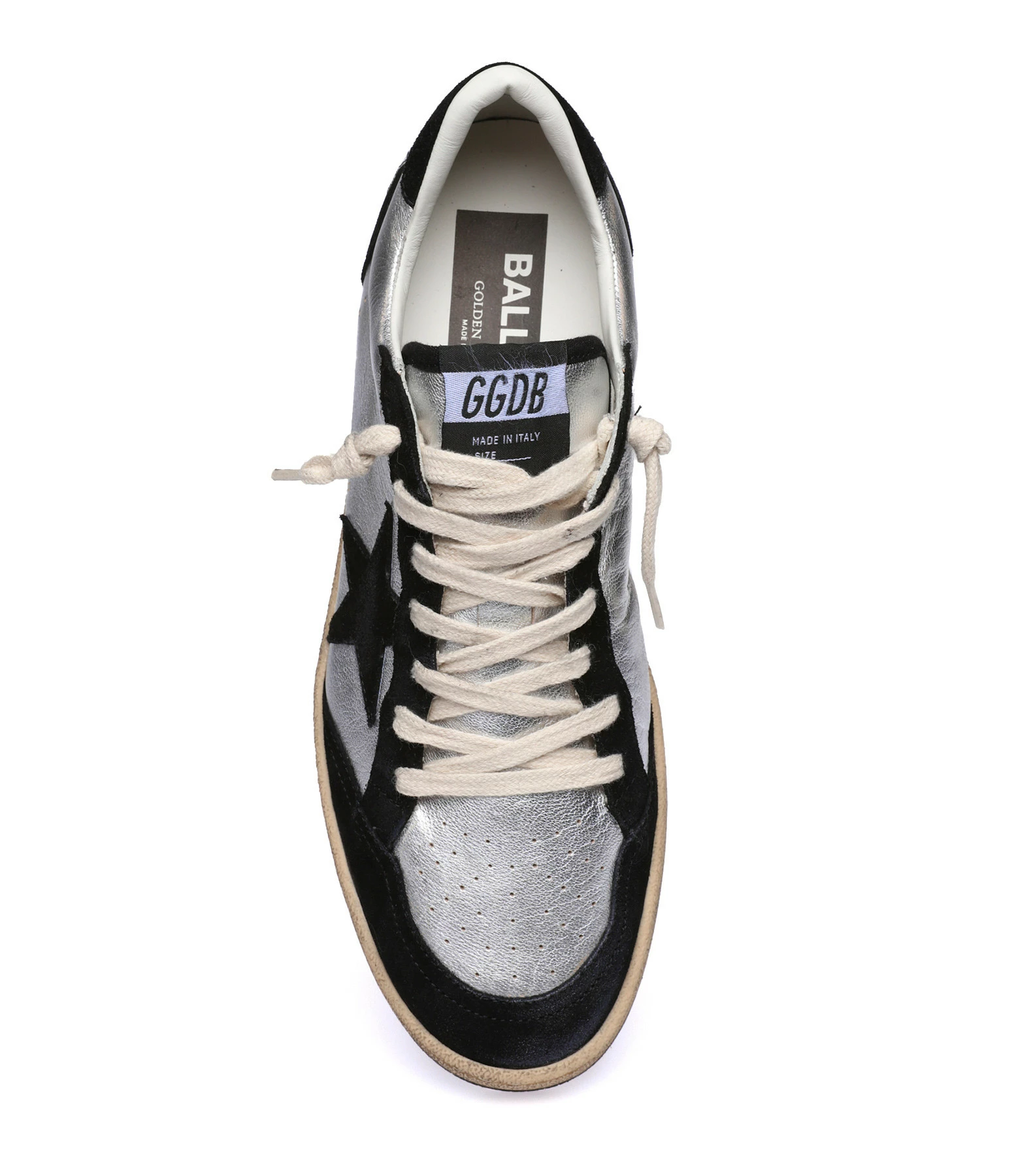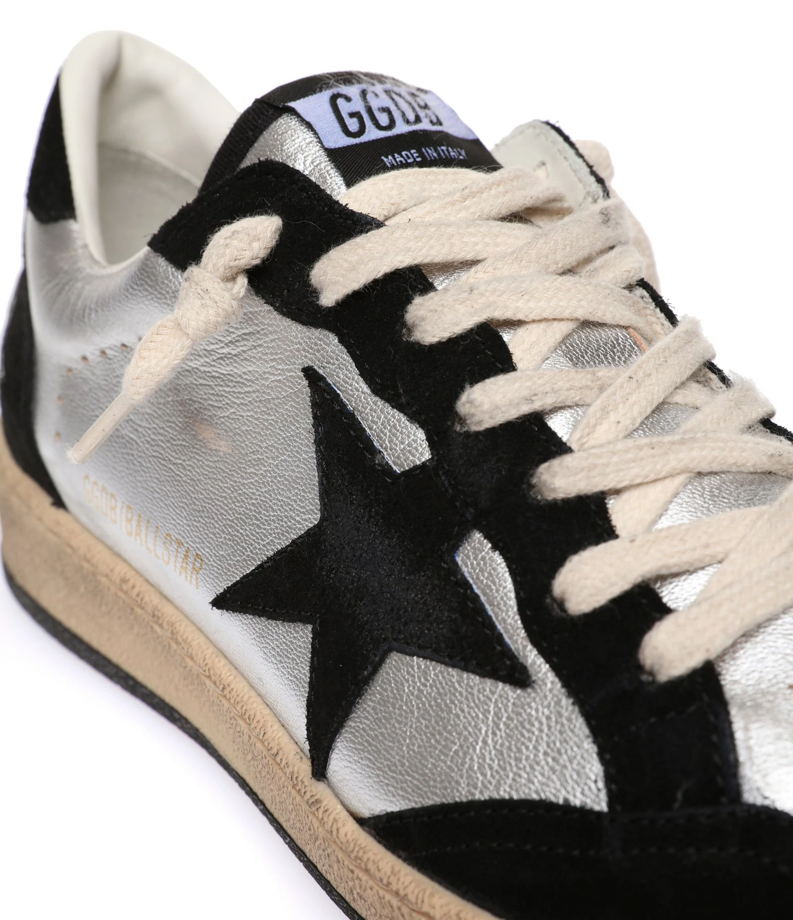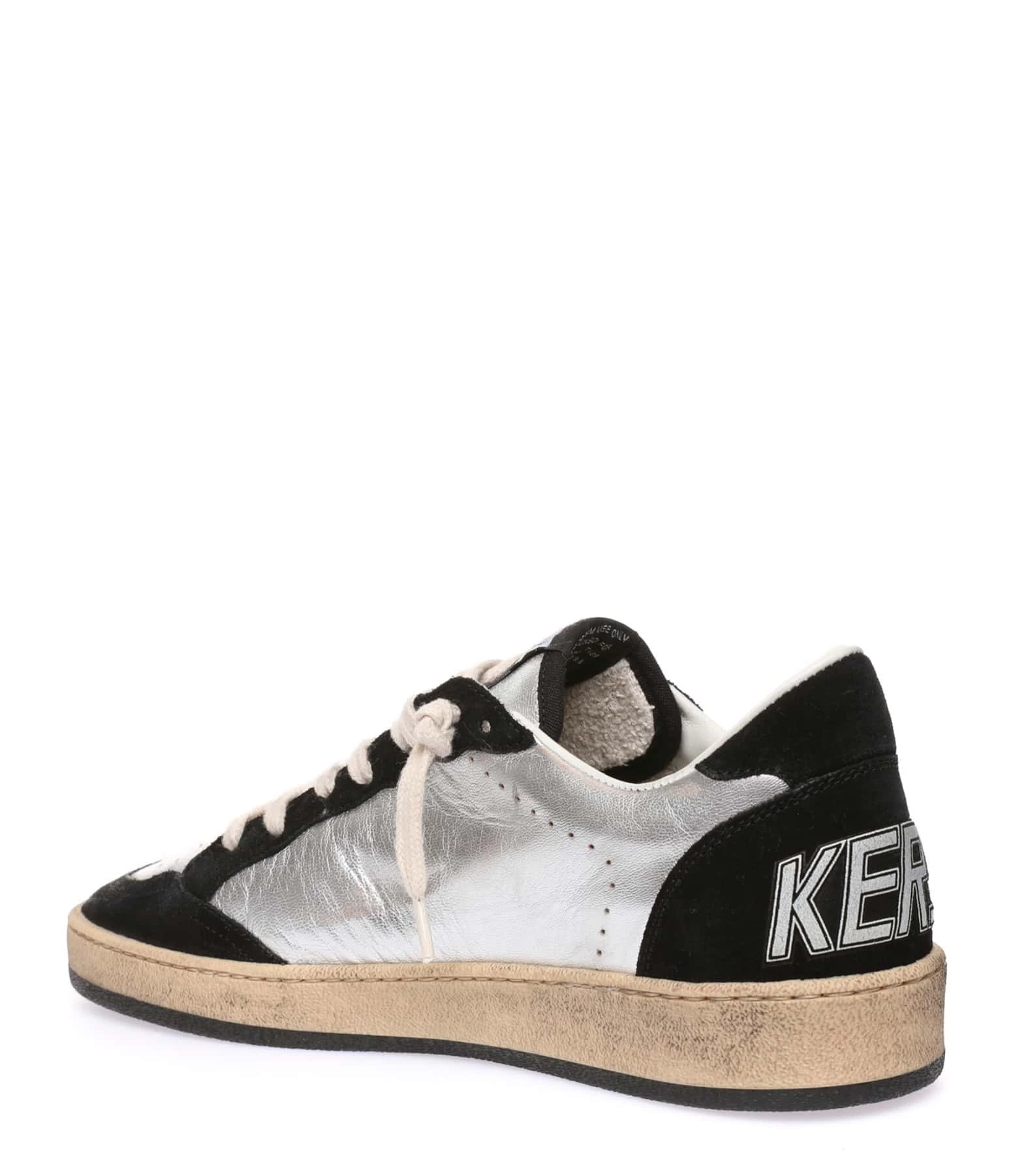 Baskets basses en cuir suédé noir et cuir lisse argenté. Empiècement étoile et renfort talon en cuir suédé noir. Lacets écrus. Inscription “SNEA” sur le talon gauche et “KERS” sur le talon droit et inscription “GGDB/BALLSTAR” sur le côté extérieur. Intérieur en cuir et maille bouclette.