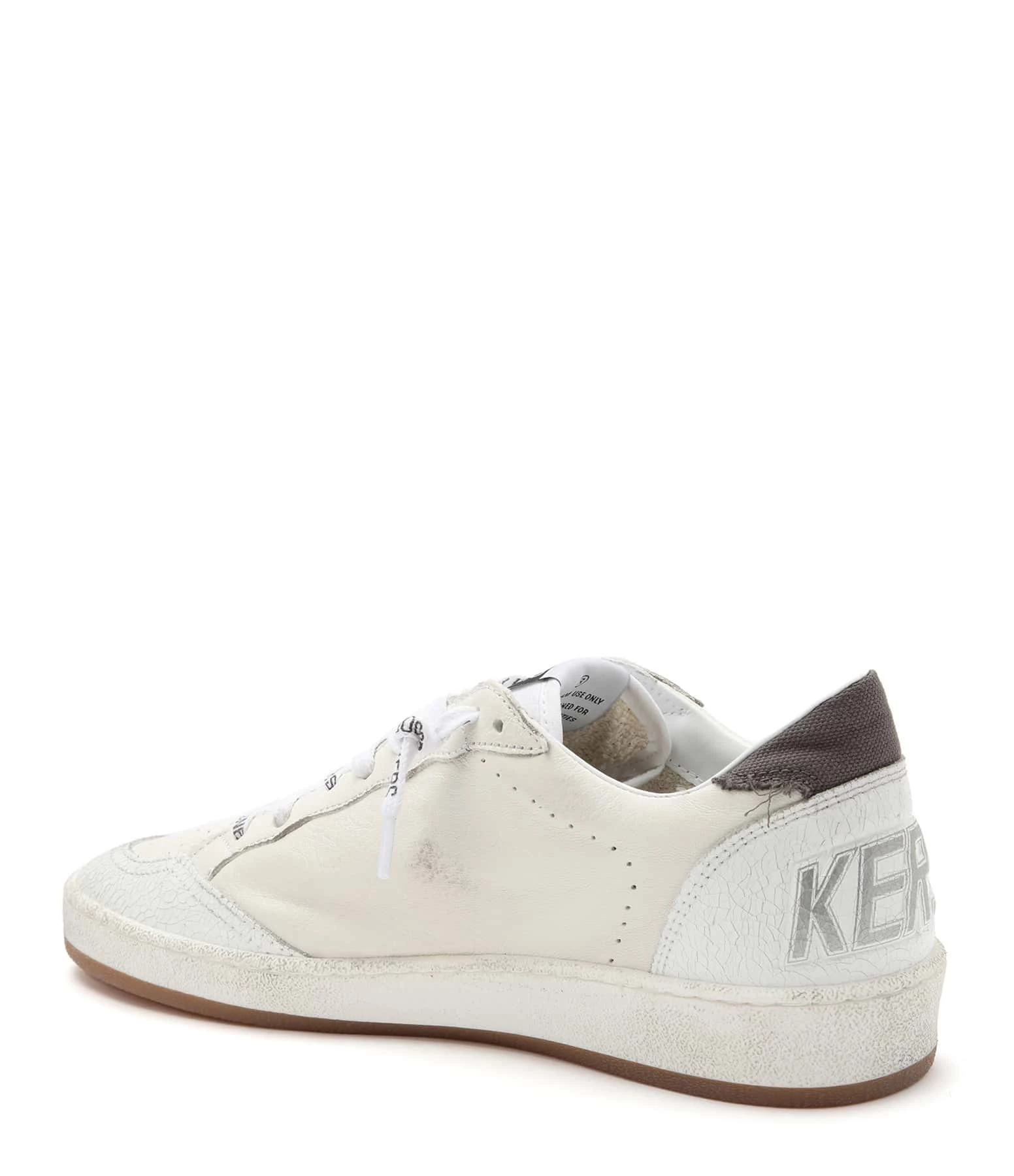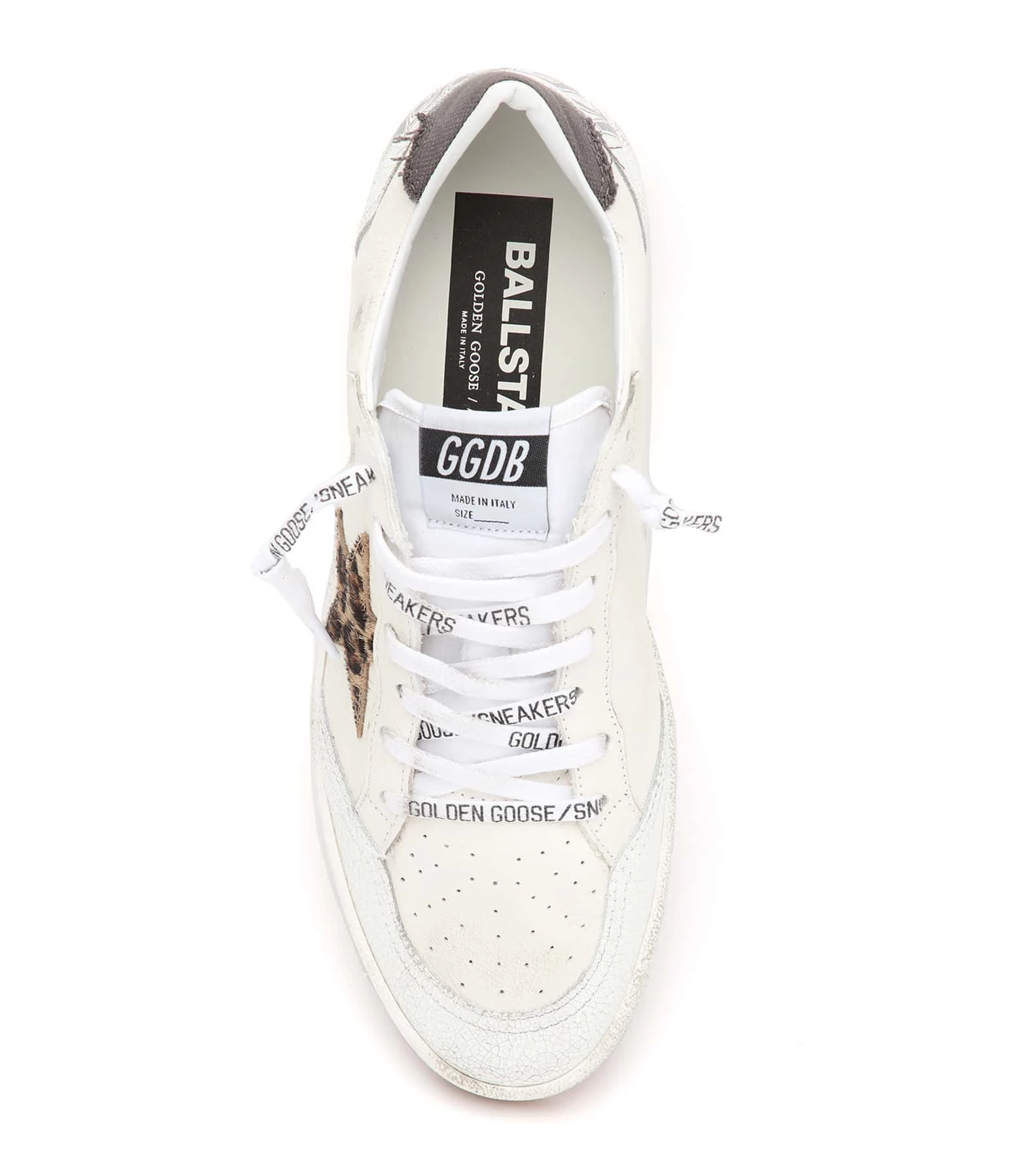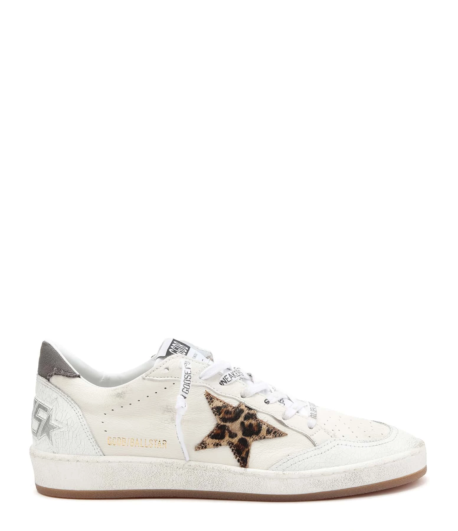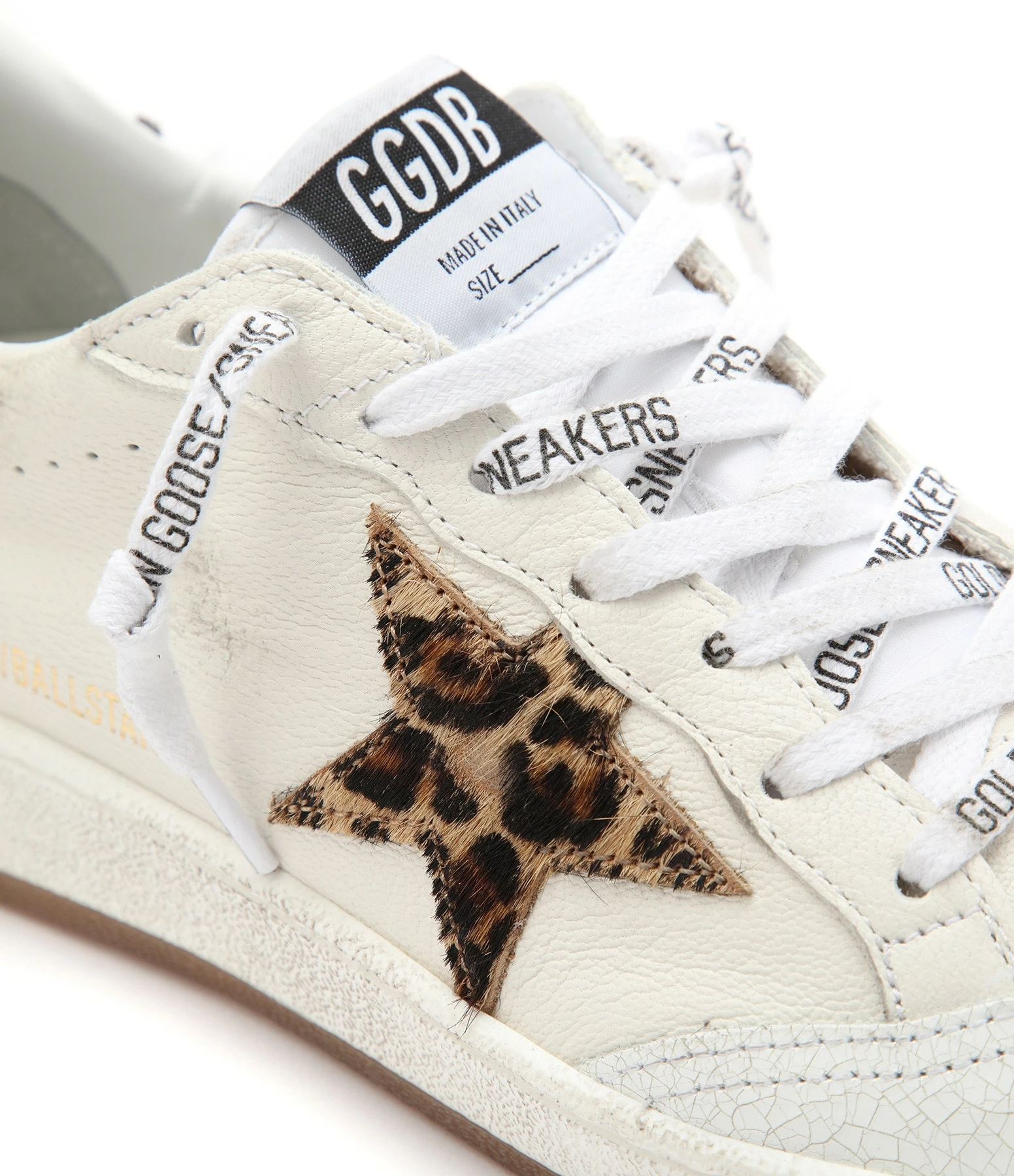 Baskets basses en cuir lisse beige, empiècements étoile en pony imprimé léopard et renfort talon en cuir craquelé blanc. Inscription “SNEA” sur le talon gauche et “KERS” sur le talon droit et “GGDB / BALLSTAR” sur le côté extérieur du pied droit. Intérieur fourré avec semelle en fourrure amovible. Effets usés et tâchés par endroits. Le soin apporté aux détails rend unique chaque modèle.