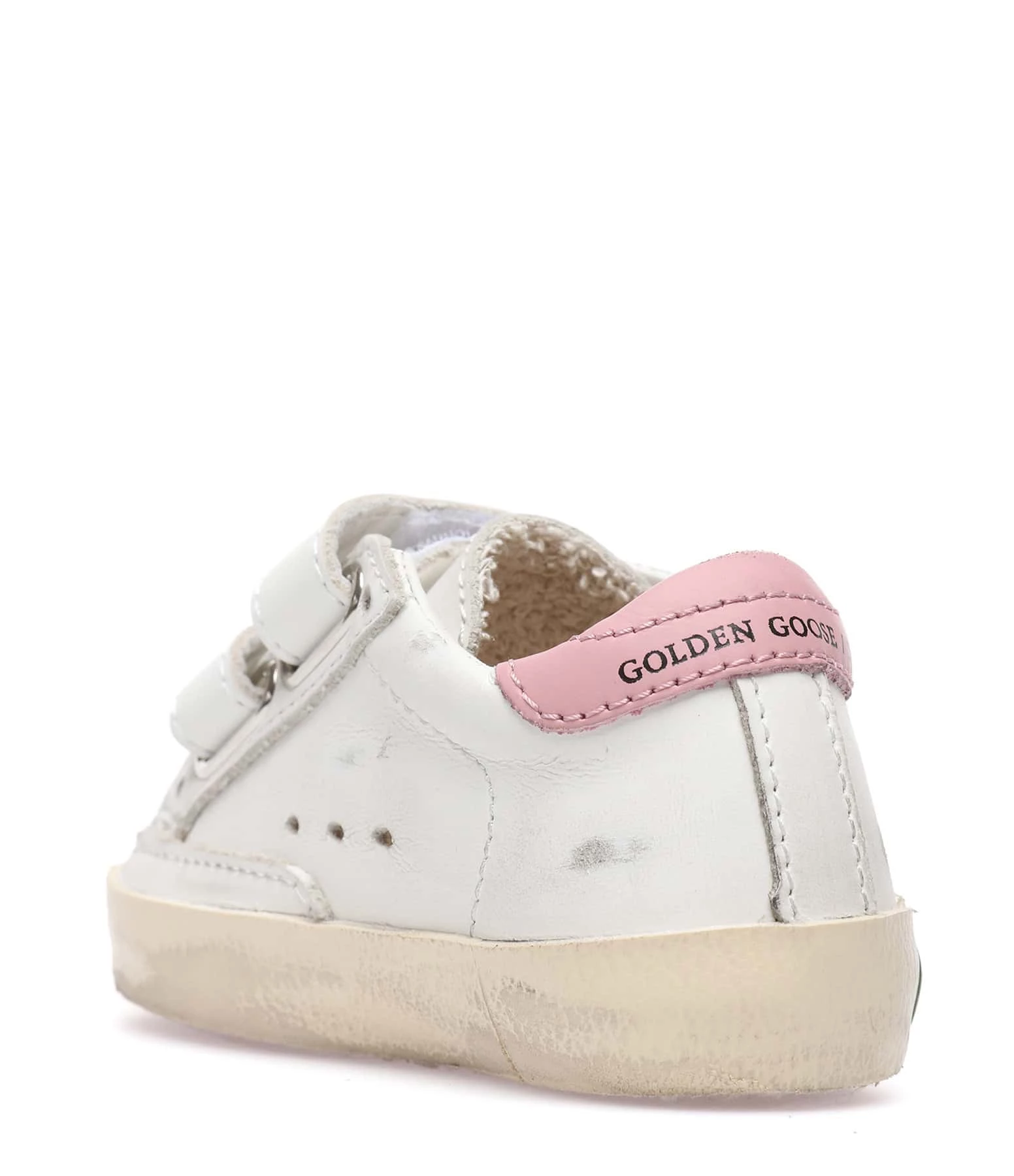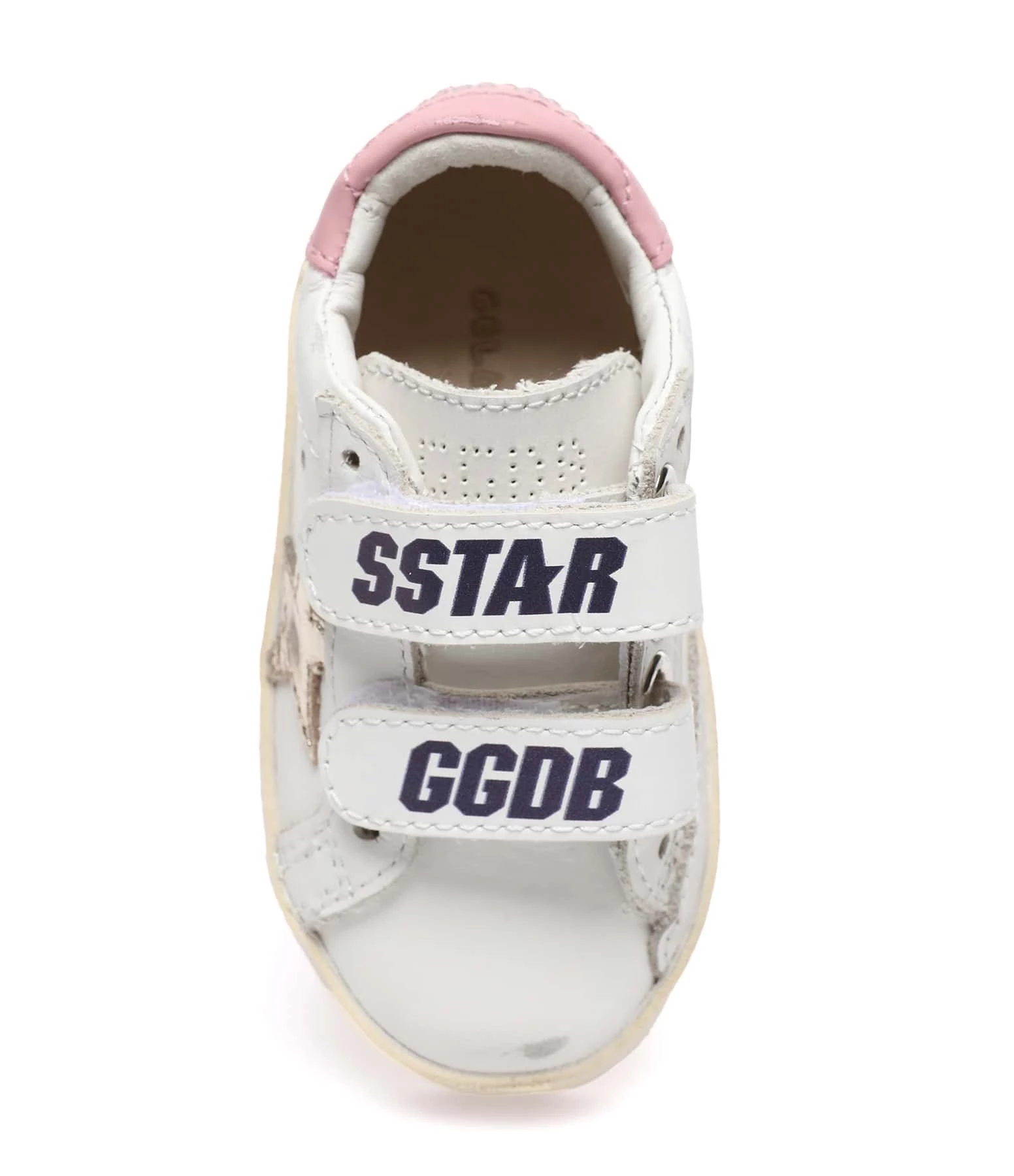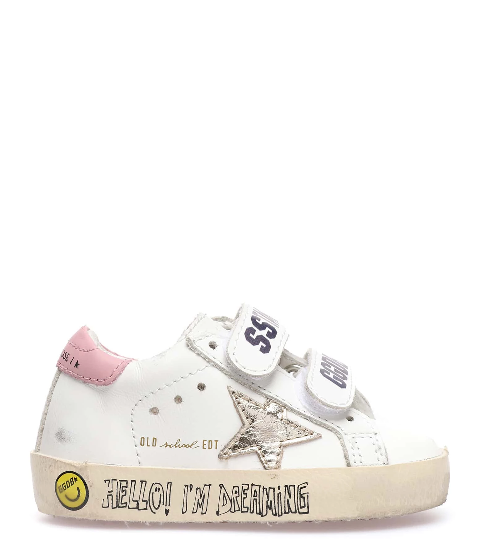 Baskets à scratch en cuir lisse blanc pour enfant. Empiècement étoile en cuir lisse doré. Renfort talon en cuir lisse rose pâle. Scratchs sérigraphiés. Inscription “Hello! I’m dreaming” sur le côté extérieur de la semelle. Intérieur en maille bouclette et cuir.