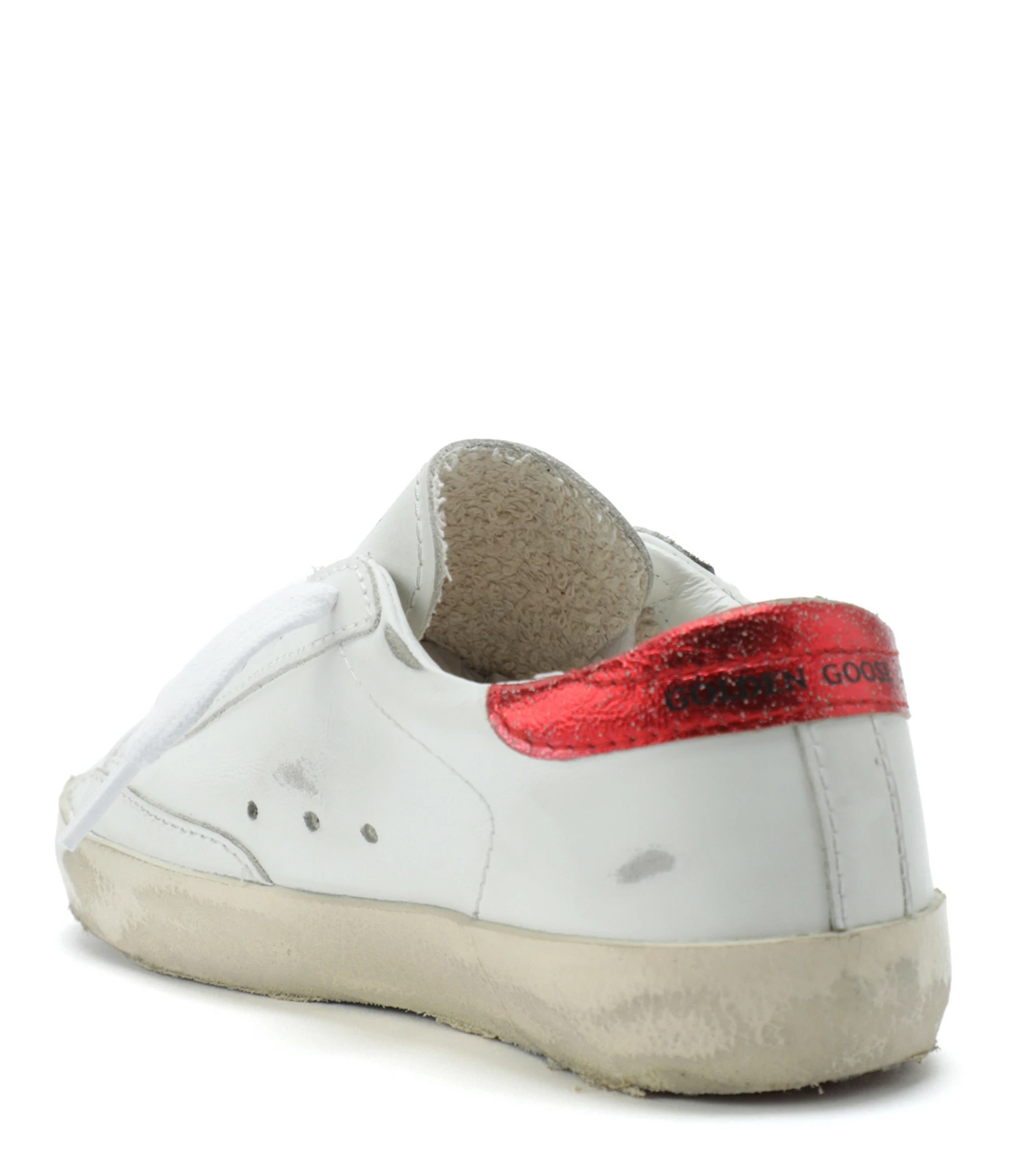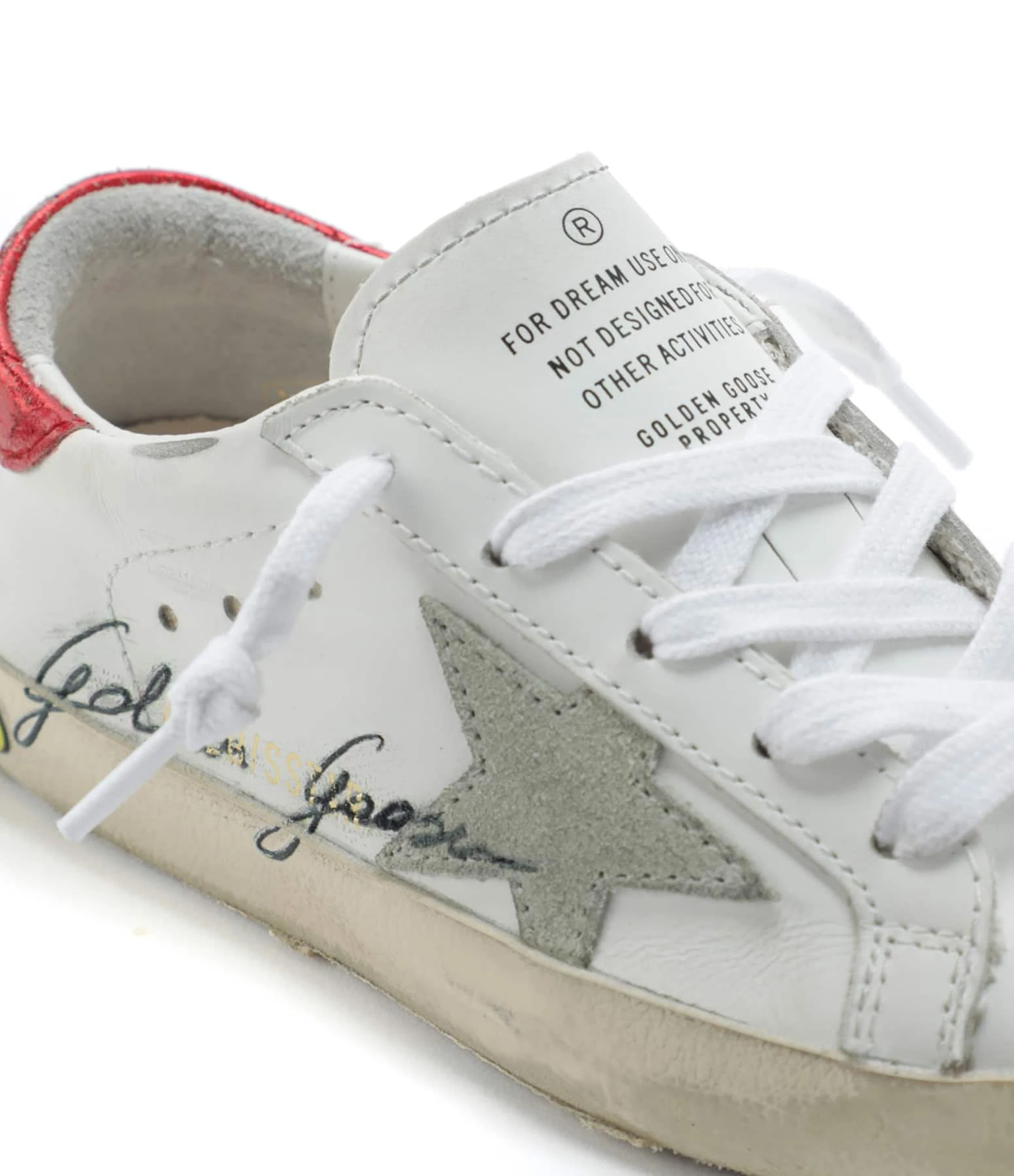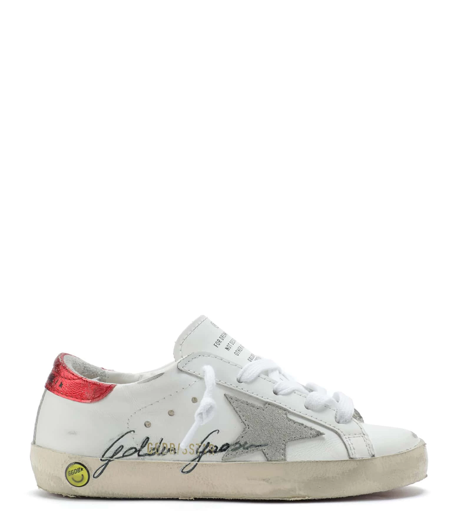 Baskets basses pour enfant en cuir lisse blanc. Empiècement étoile en cuir suédé gris. Renfort talon en cuir métallisé rouge. Lacets blancs. Intérieur en maille bouclette et cuir. Inscription “GGDB/SSTAR” et “golden goose” sur le côté extérieur.