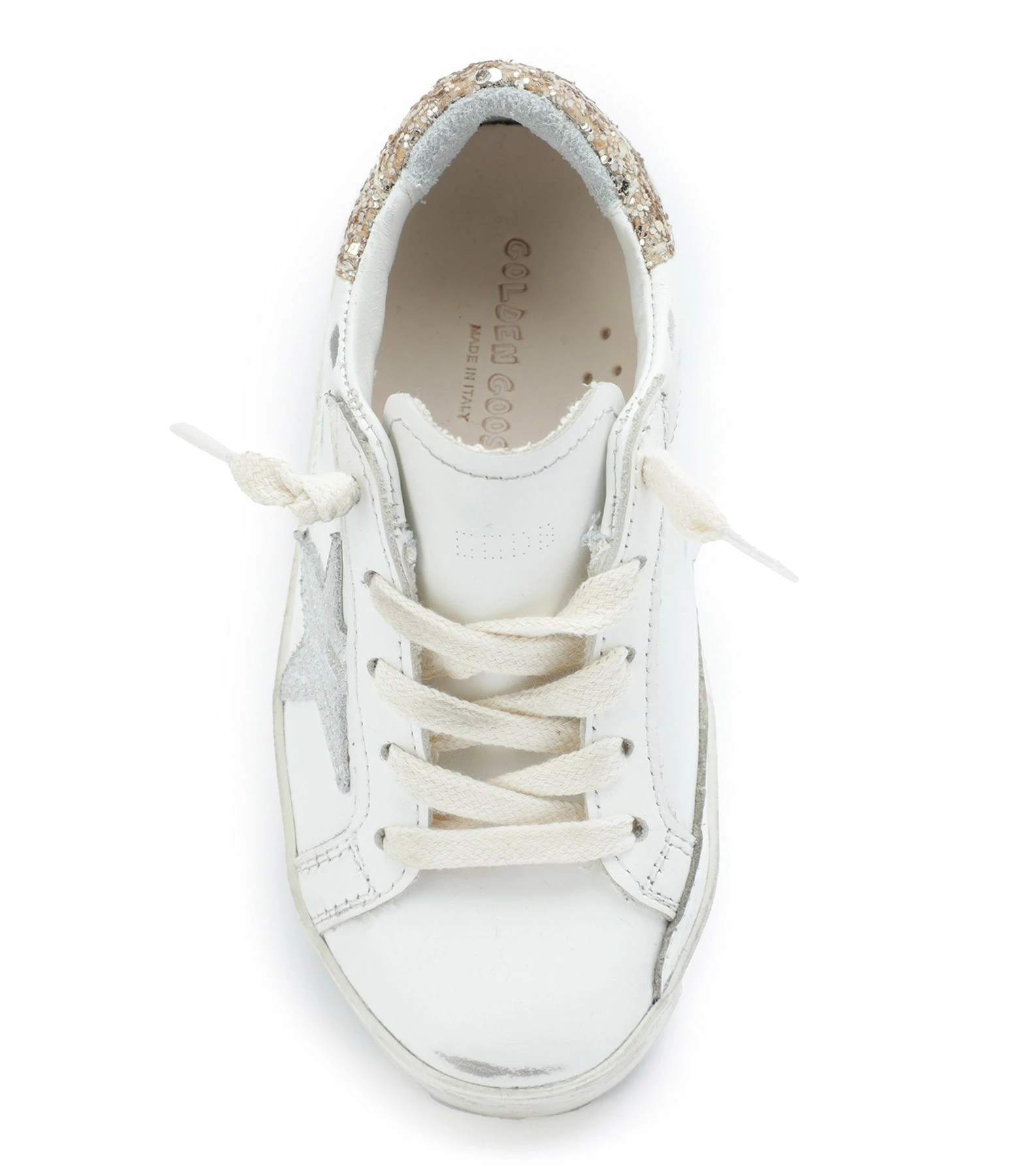 Baskets à lacets en cuir lisse blanc. Empiècement étoile en cuir argenté effet croco. Renfort talon en paillettes dorées. Intérieur en maille bouclette et cuir. Effets usés et tachés par endroits. Le soin apporté aux détails rend unique chaque modèle.