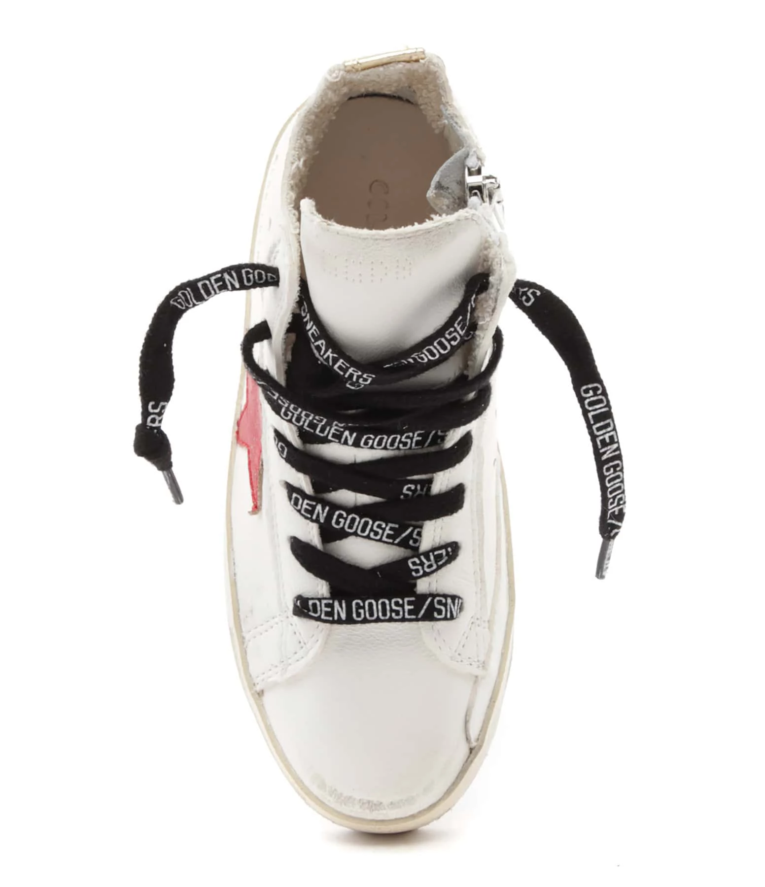 Baskets montantes pour enfant en cuir lisse blanc. Empiècement logo étoile en cuir lamé rouge et inscription “GGDB/Francy” en doré sur la tige. Empiècement en cuir lamé doré sur l’arrière. Lacets noirs avec l’inscription “Golden Goose/Sneakers” imprimée en blanc. Fermeture zippée sur le côté. Semelle beige avec l’inscription “We belong to fantasy” imprimée en noir. Doublées en cuir et maille bouclette. Effet usé.