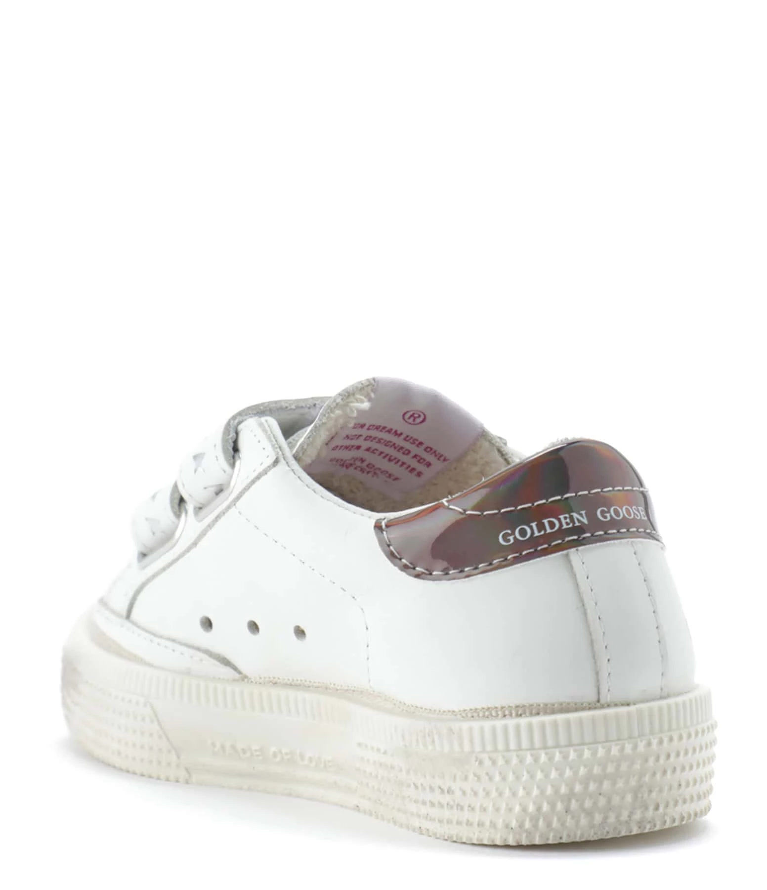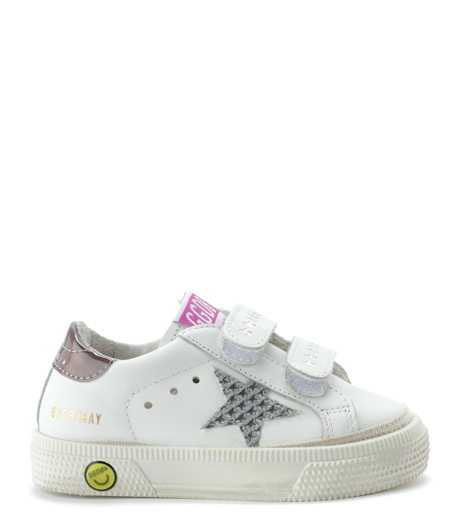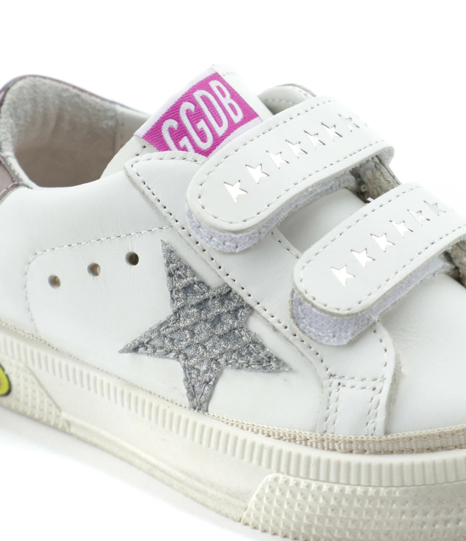 Baskets à scratch en cuir lisse blanc pour bébé. Empiècement étoile à paillettes argentées. Renfort talon argenté à reflets holographiques. Inscription “GGDB/MAY” sur le côté extérieur. Intérieur en maille bouclette et cuir.