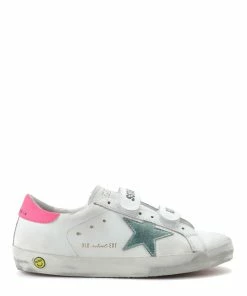 Baskets à scratch en cuir lisse blanc. Empiècement étoile en cuir lisse bleu métallisé. Renfort talon en cuir lisse rose fluo. Scratchs sérigraphiés. Inscription “Old school EDT” sur le côté extérieur. Intérieur en maille bouclette et cuir.