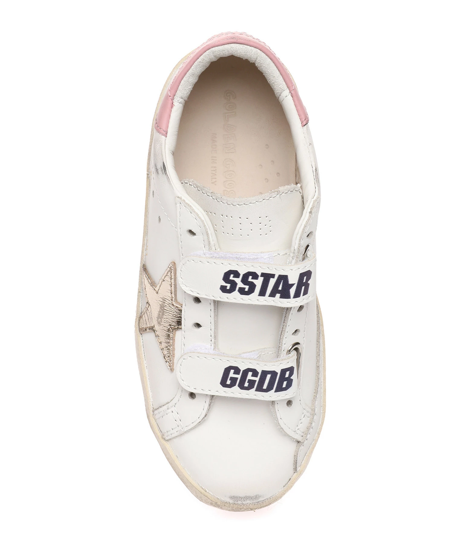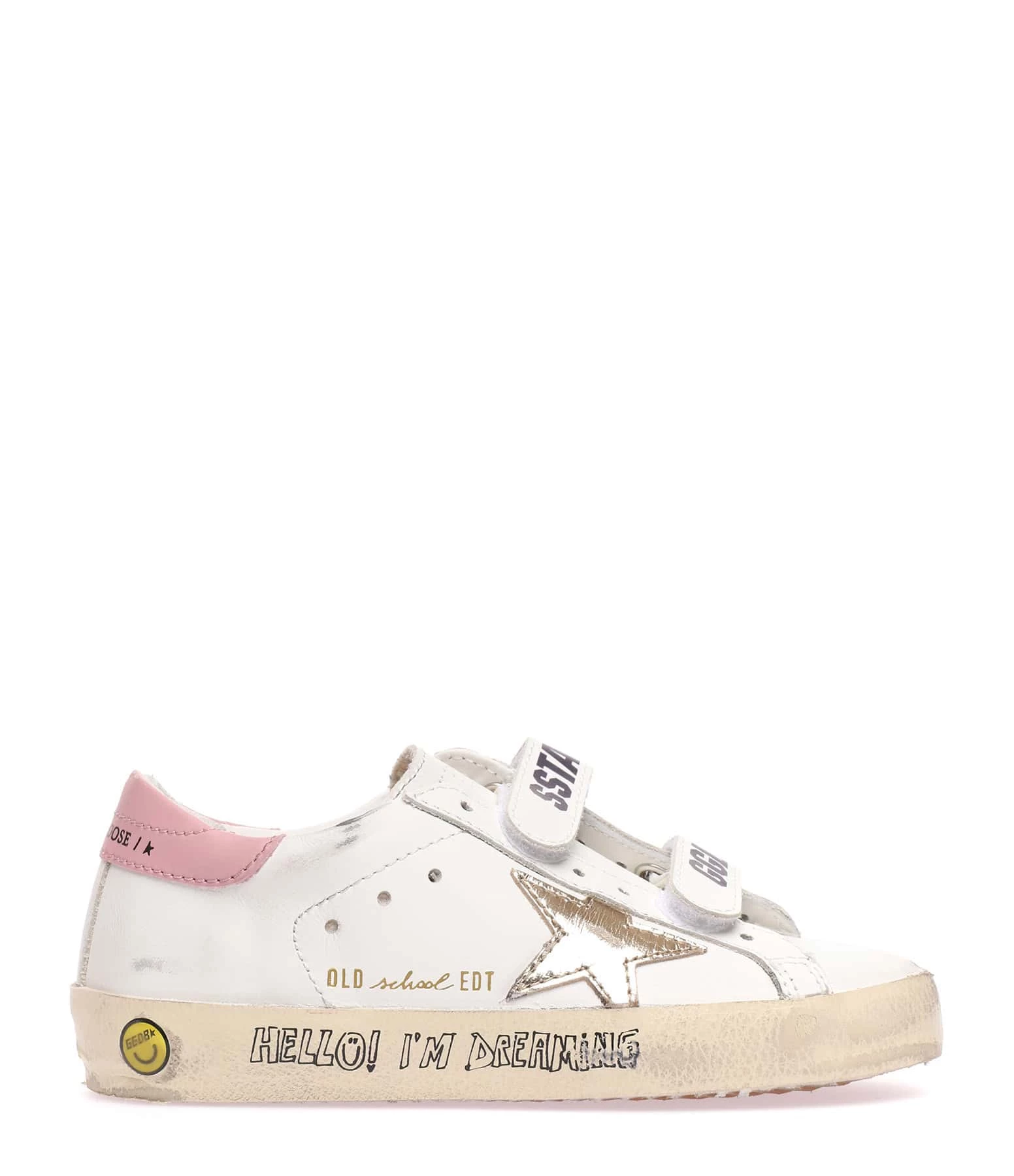 Baskets à scratch en cuir blanc. Empiècement étoile en cuir lisse doré et renfort talon en cuir lisse rose. Intérieur en maille bouclette et cuir. Effets usés et tachés par endroits. Le soin apporté aux détails rend unique chaque modèle.