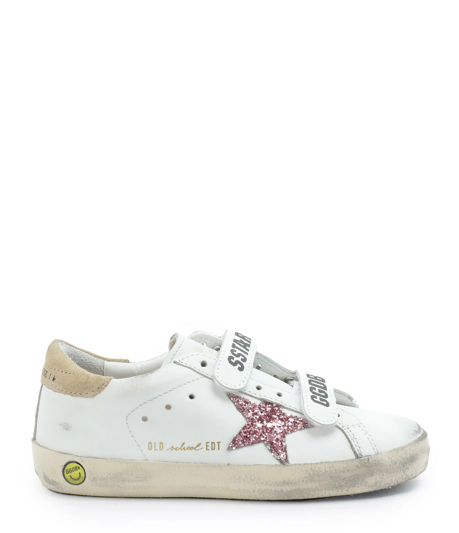 Baskets à scratch en cuir lisse blanc. Empiècement étoile à paillettes roses. Renfort talon en cuir suédé beige. Scratchs sérigraphiés. Inscription “Old school EDT” sur le côté extérieur. Intérieur en maille bouclette et cuir.