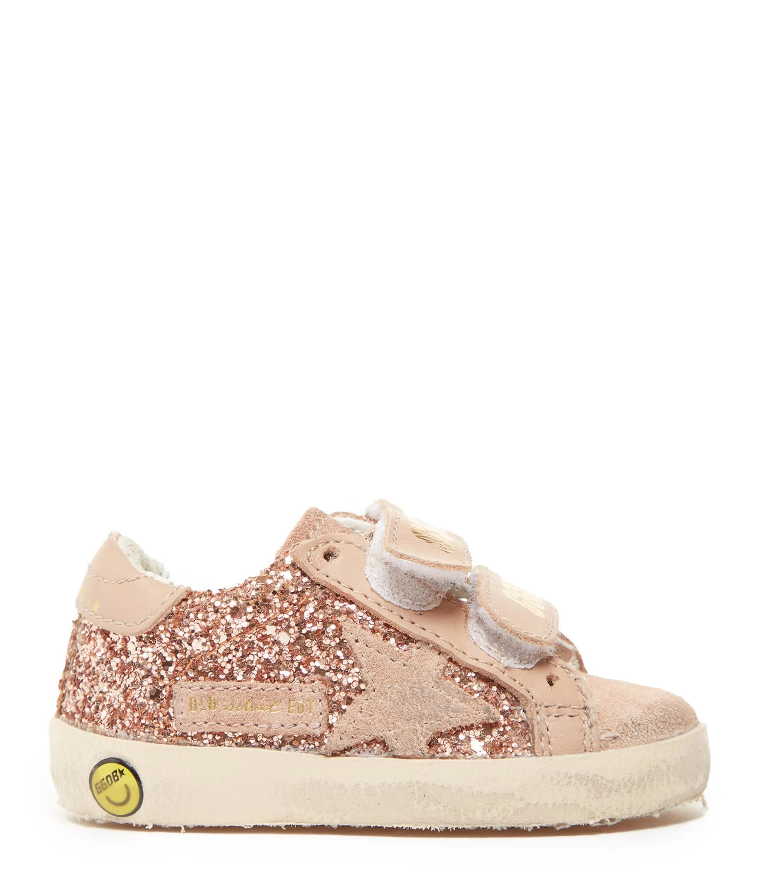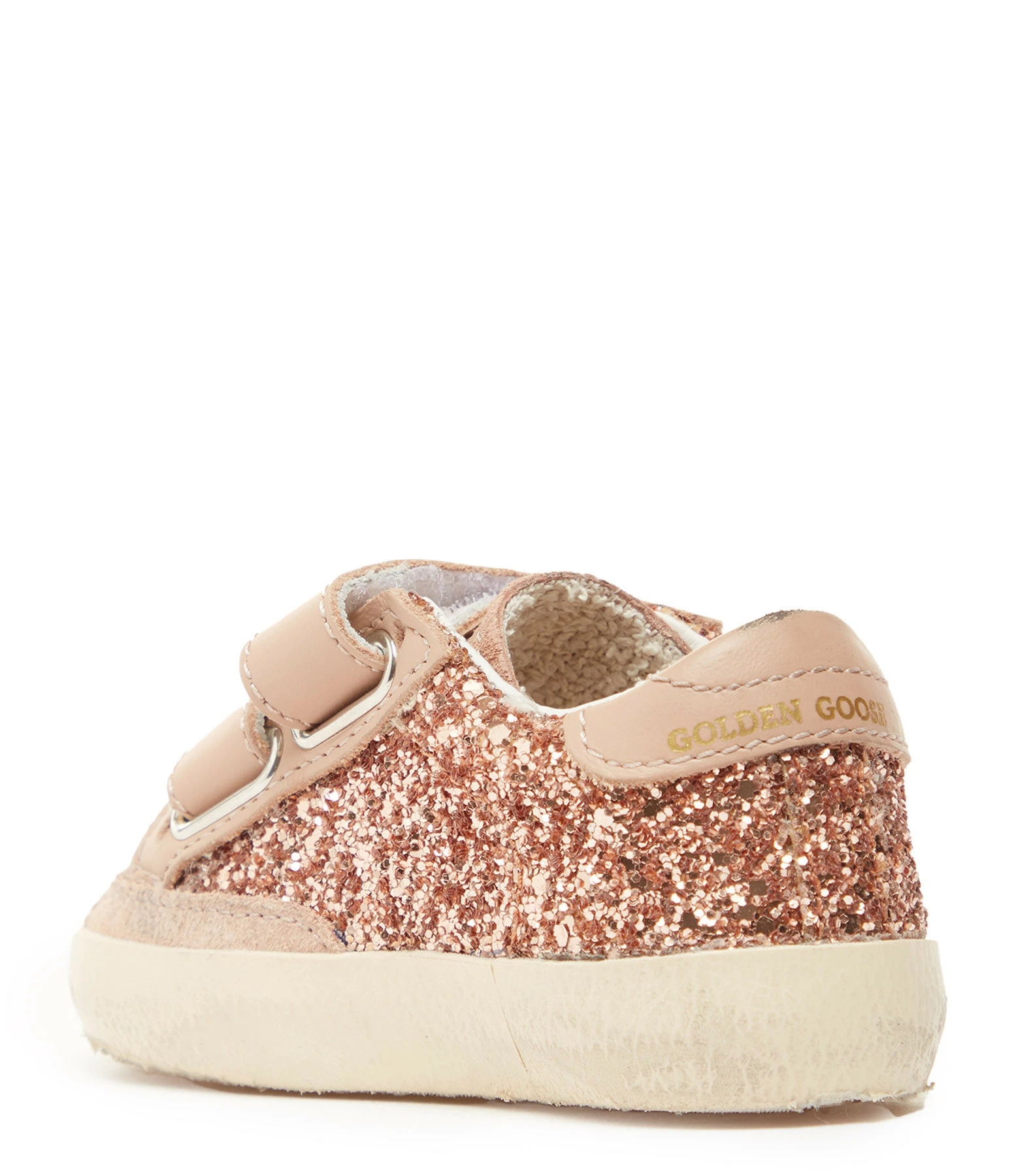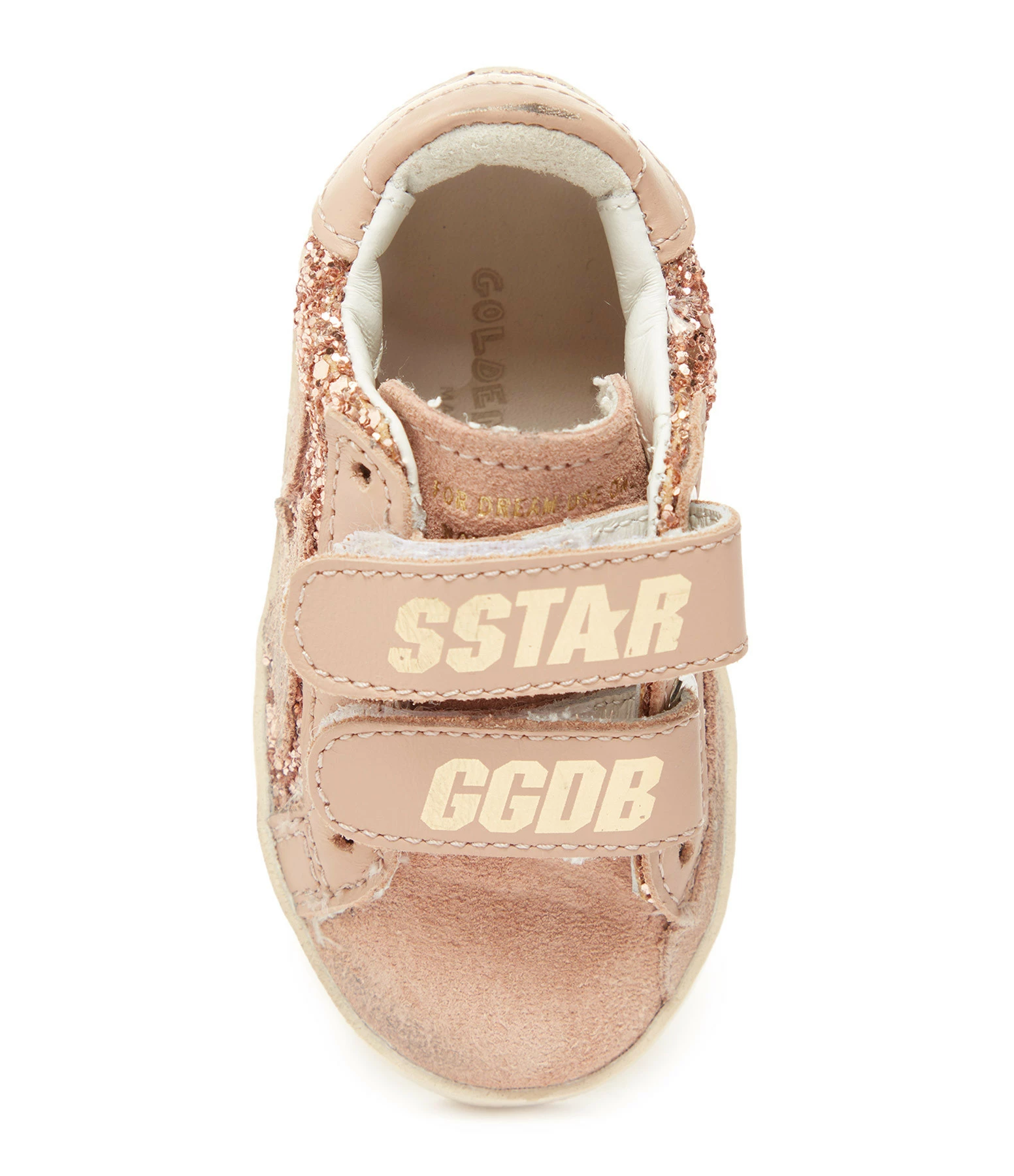Baskets en cuir suédé beige et paillettes dorées roses. Fermeture à scratch avec inscription “SSTAR GGDB” sérigraphiée en doré. Empiècement en cuir suédé logo étoile beige.