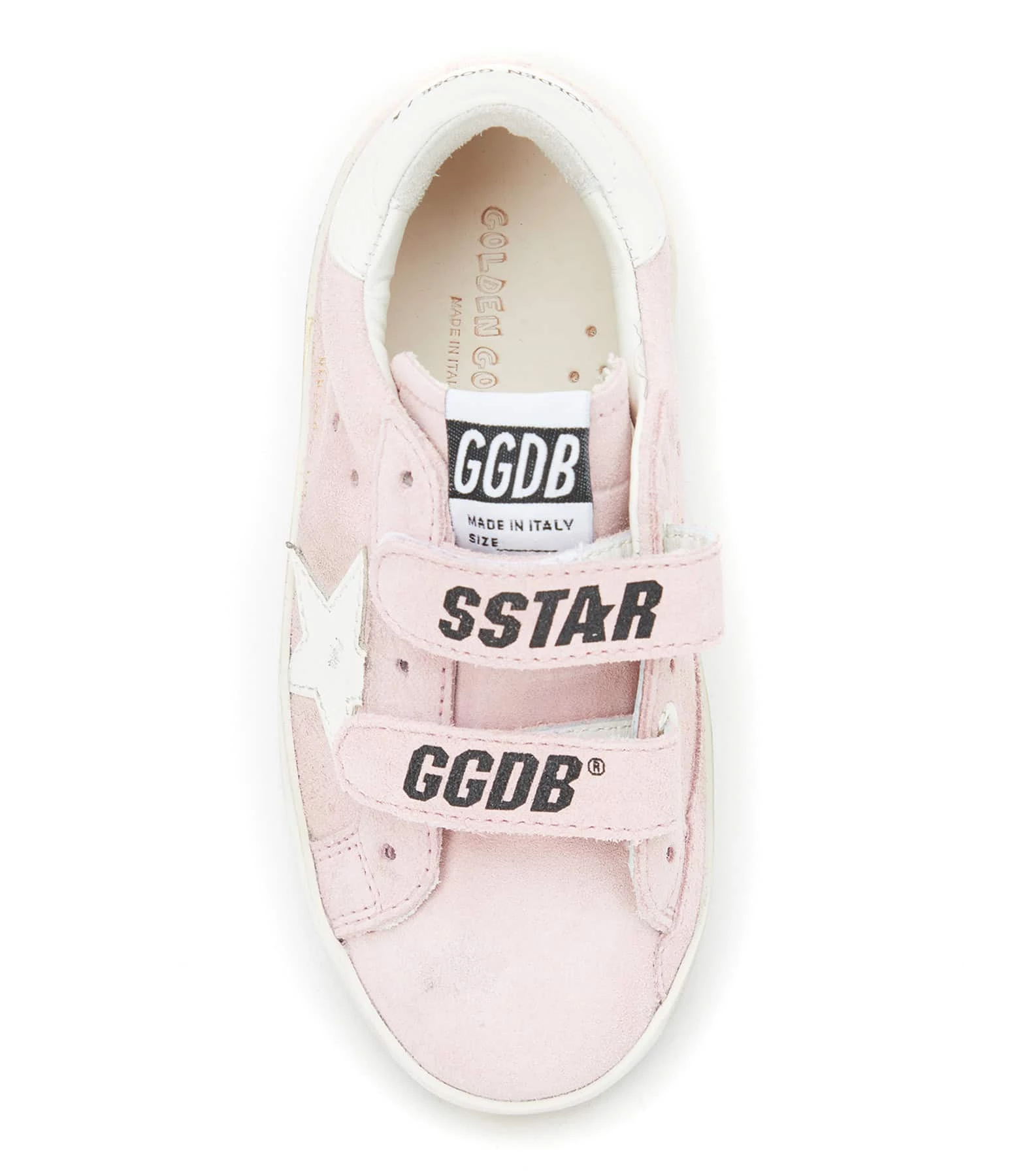 Baskets à scratch en cuir suédé rose. Empiècement étoile et renfort talon en cuir lisse blanc. Scratchs sérigraphiés. Inscription “Old school EDT” sur le côté extérieur. Intérieur en maille bouclette et cuir.
