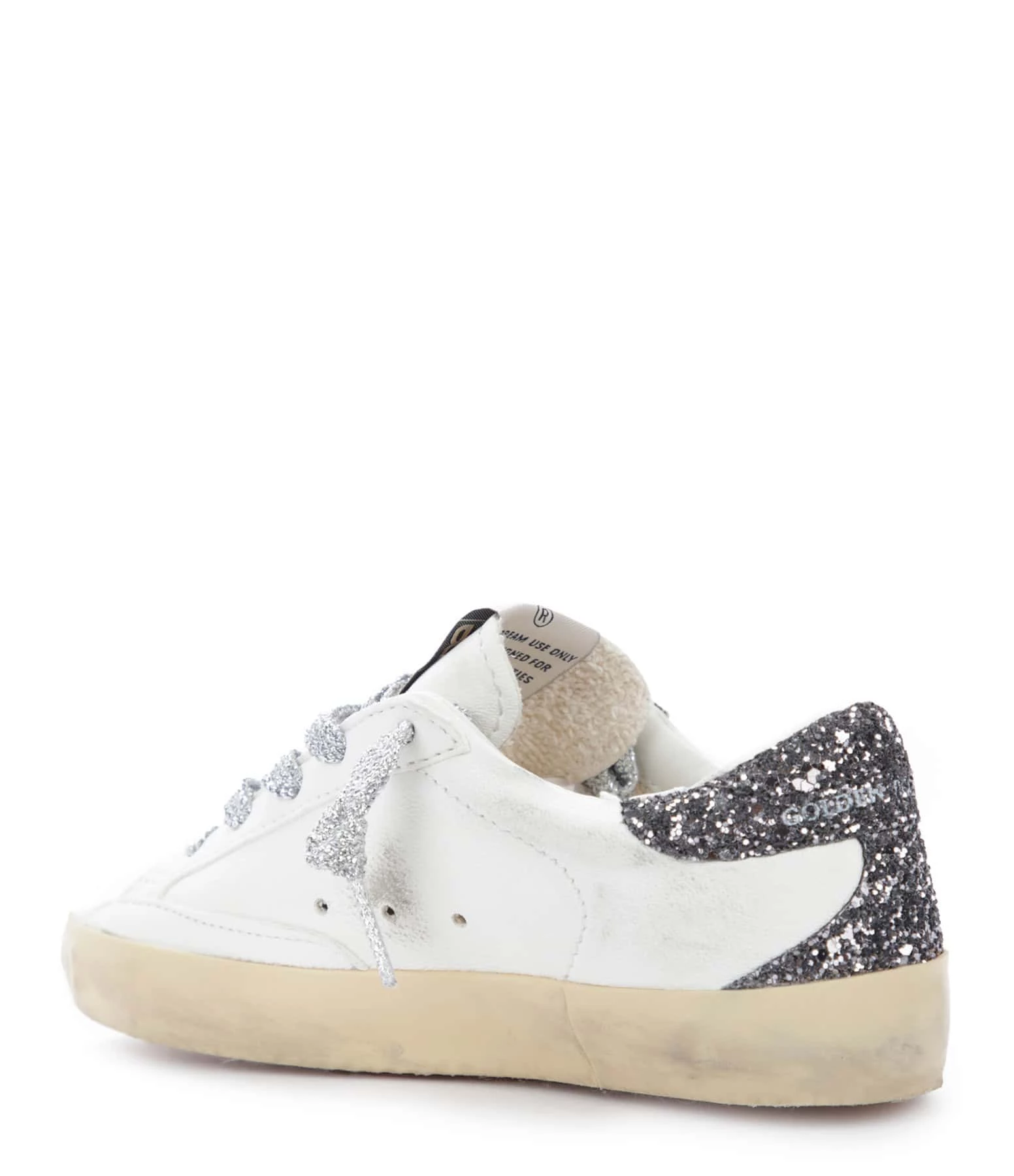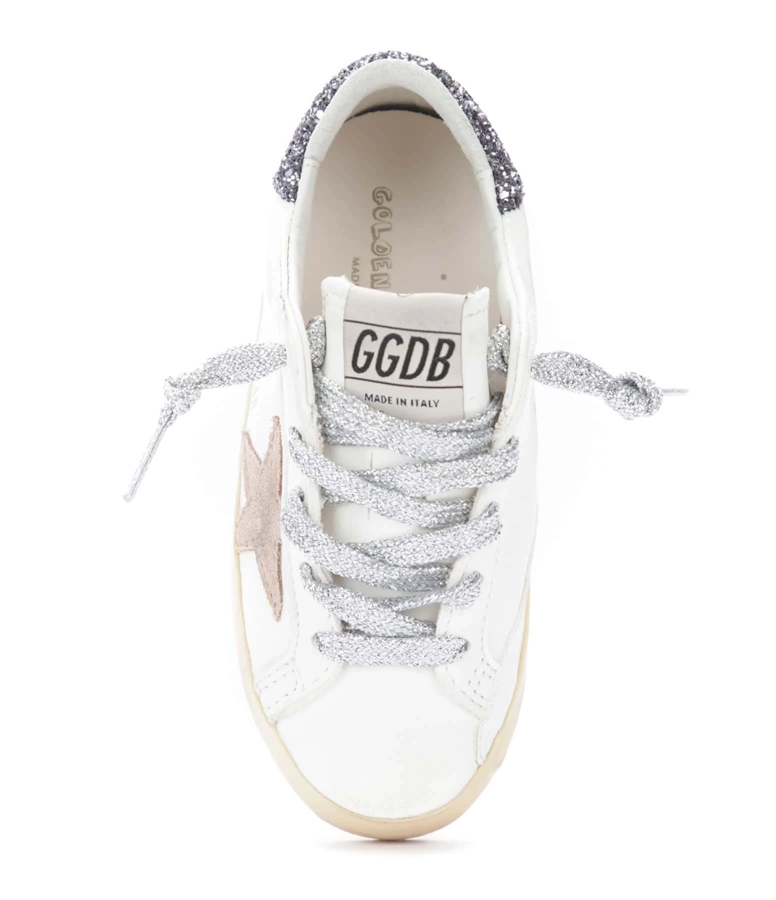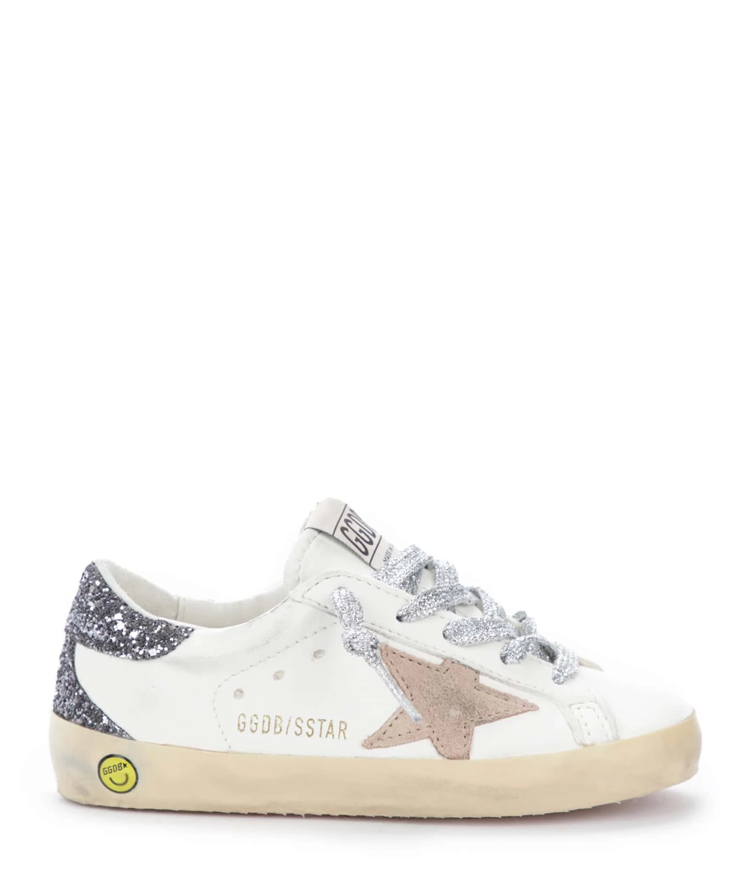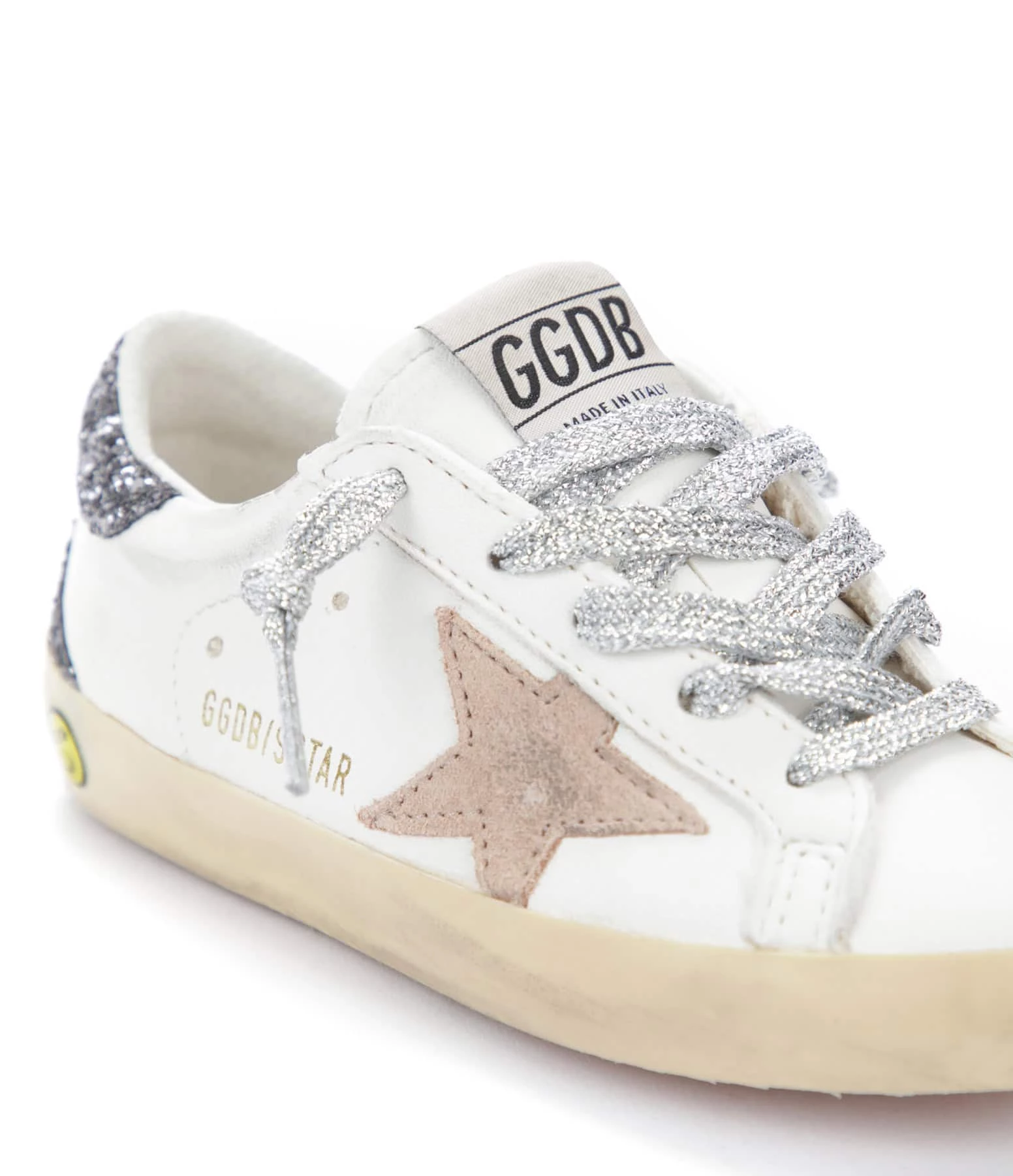 Baskets à lacets en cuir lisse blanc. Empiècement étoile en cuir suédé rose. Renfort talon en paillettes gris foncés. Intérieur en maille bouclette et cuir. Effets usés et tachés par endroits. Le soin apporté aux détails rend unique chaque modèle.