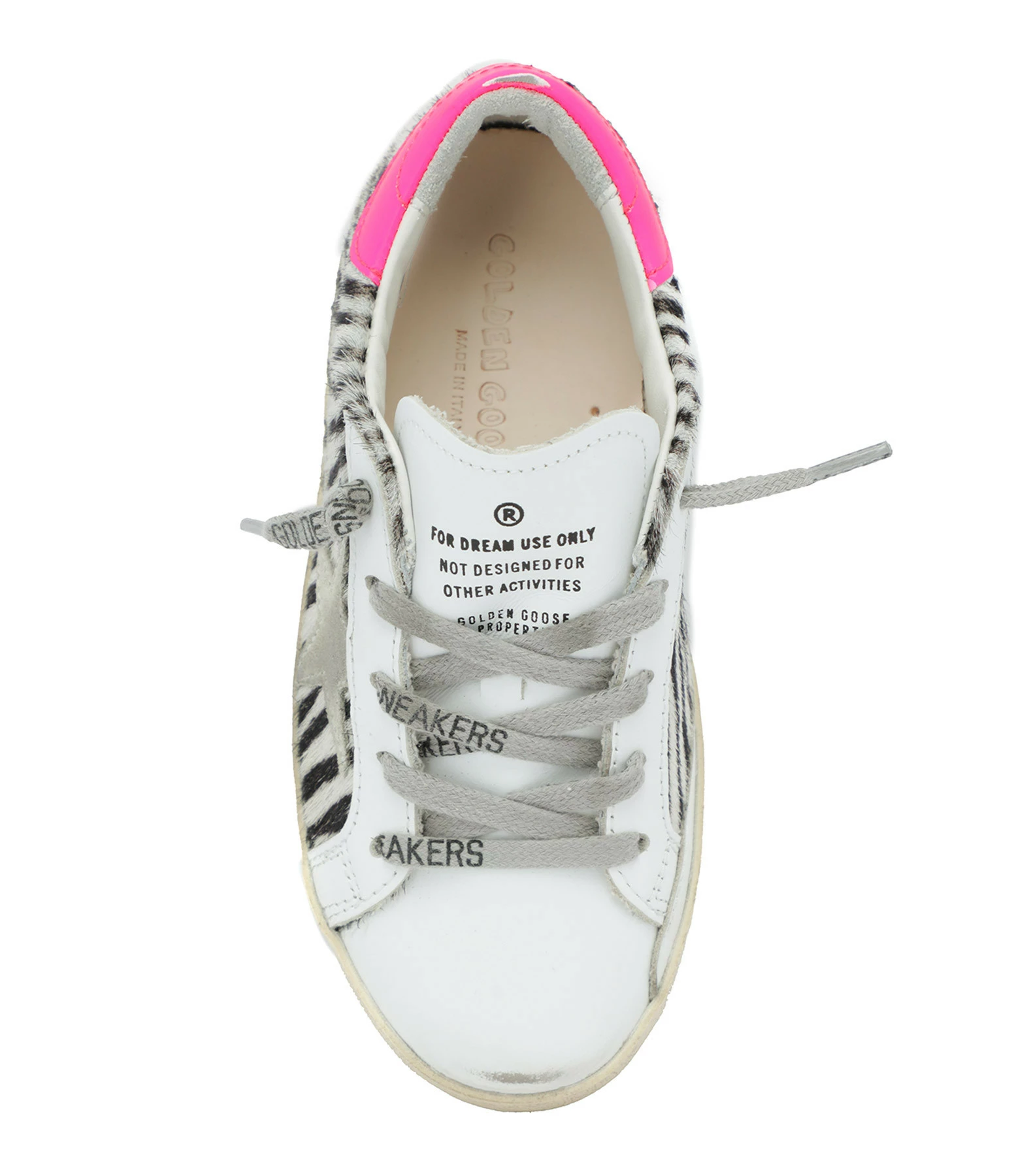Baskets basses pour enfant en cuir pony zébré. Empiècement étoile en cuir suédé gris. Renfort talon en cuir lisse rose fluo. Languette en cuir lisse blanche avec inscriptions. Lacets gris sérigraphiés. Intérieur en maille bouclette et cuir. Inscription “GGDB/SSTAR” sur le côté extérieur.