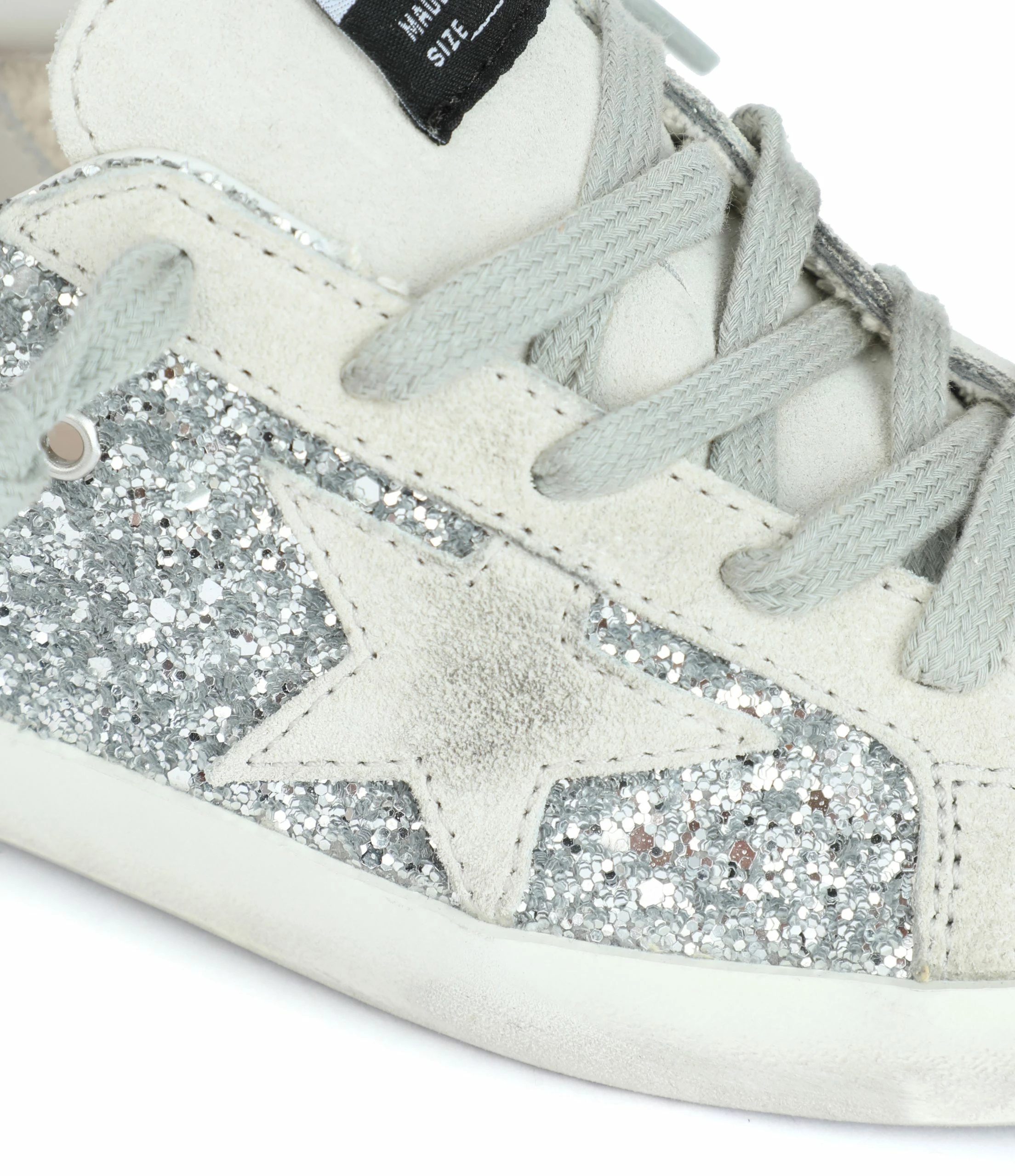 Baskets basses à paillettes argentées et languette en cuir suédé gris. Empiècement étoile et renfort talon en cuir suédé gris. Lacets gris. Intérieur en maille bouclette et cuir. Inscription “GGDB/SSTAR” sur le côté extérieur.