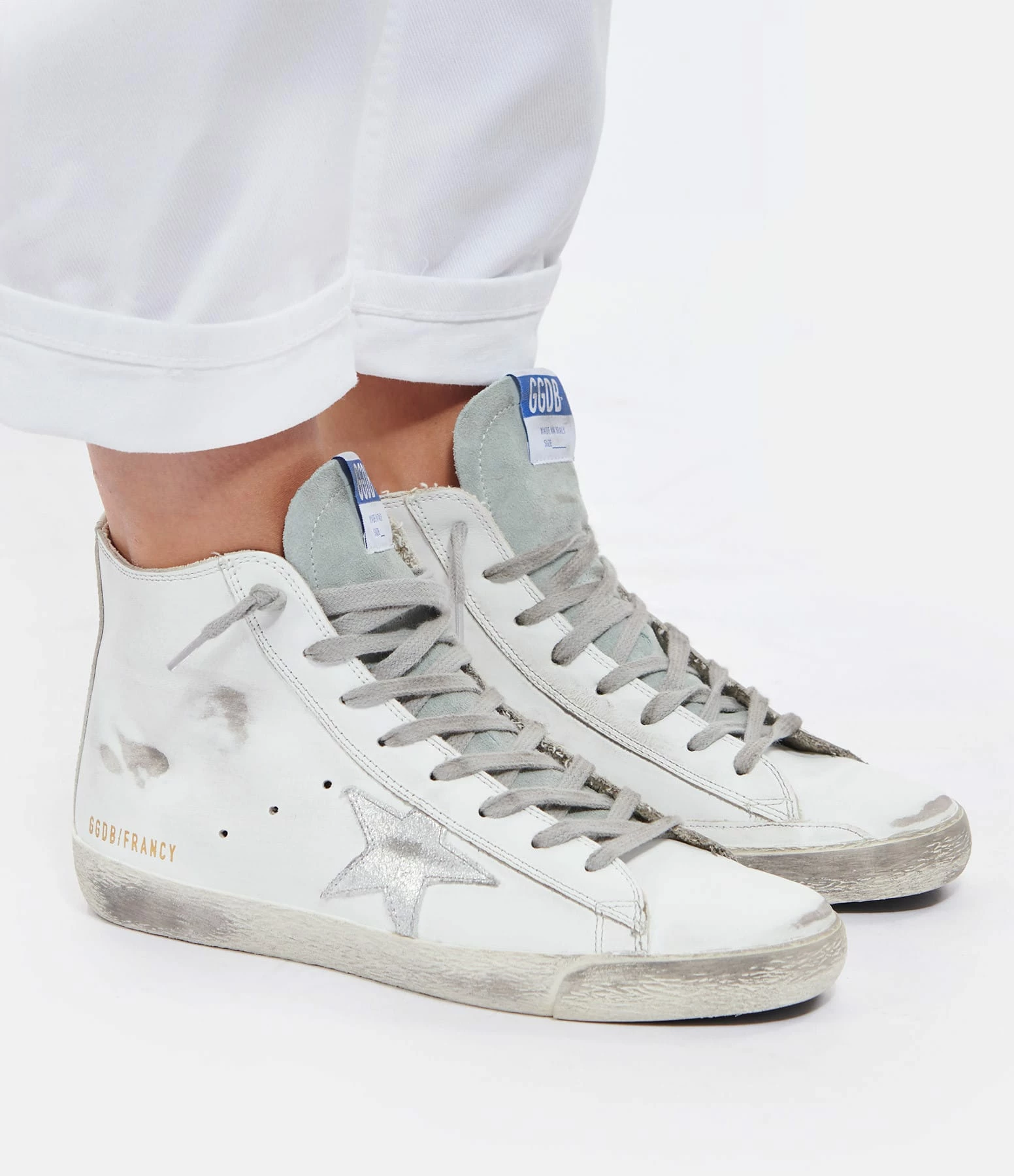 Baskets montantes en cuir lisse blanc. Empiècement étoile en cuir argenté. Lacets gris. Fermeture par zip sur le côté. Inscription “GGDB/FRANCY” sur le côté extérieur et logo “Francy” sur le côté intérieur. Intérieur en cuir et maille bouclette.