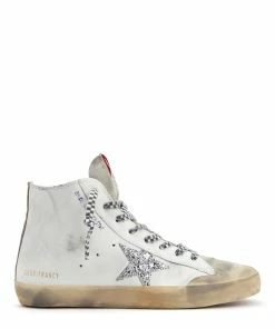 Baskets montantes en cuir lisse blanc. Embout et languette en cuir suédé taupe. Étiquette blanche et rouge avec inscription “GGDB MADE IN ITALY” cousue sur la languette. Empiècement logo étoile en paillettes argentées et inscriptions “GGDB/FRANCY” en doré et “UNVEIL YOUR INNER-STAR” en bleu sur la tige. Empiècement en cuir marron sur l’arrière. Fermeture à lacets à carreaux noirs et blancs et fermeture zippée sur le côté. Empiècement en plastique avec inscription “GOLDEN” sur la tige. Semelle beige. Doublées en cuir et maille bouclette. Effet usé.