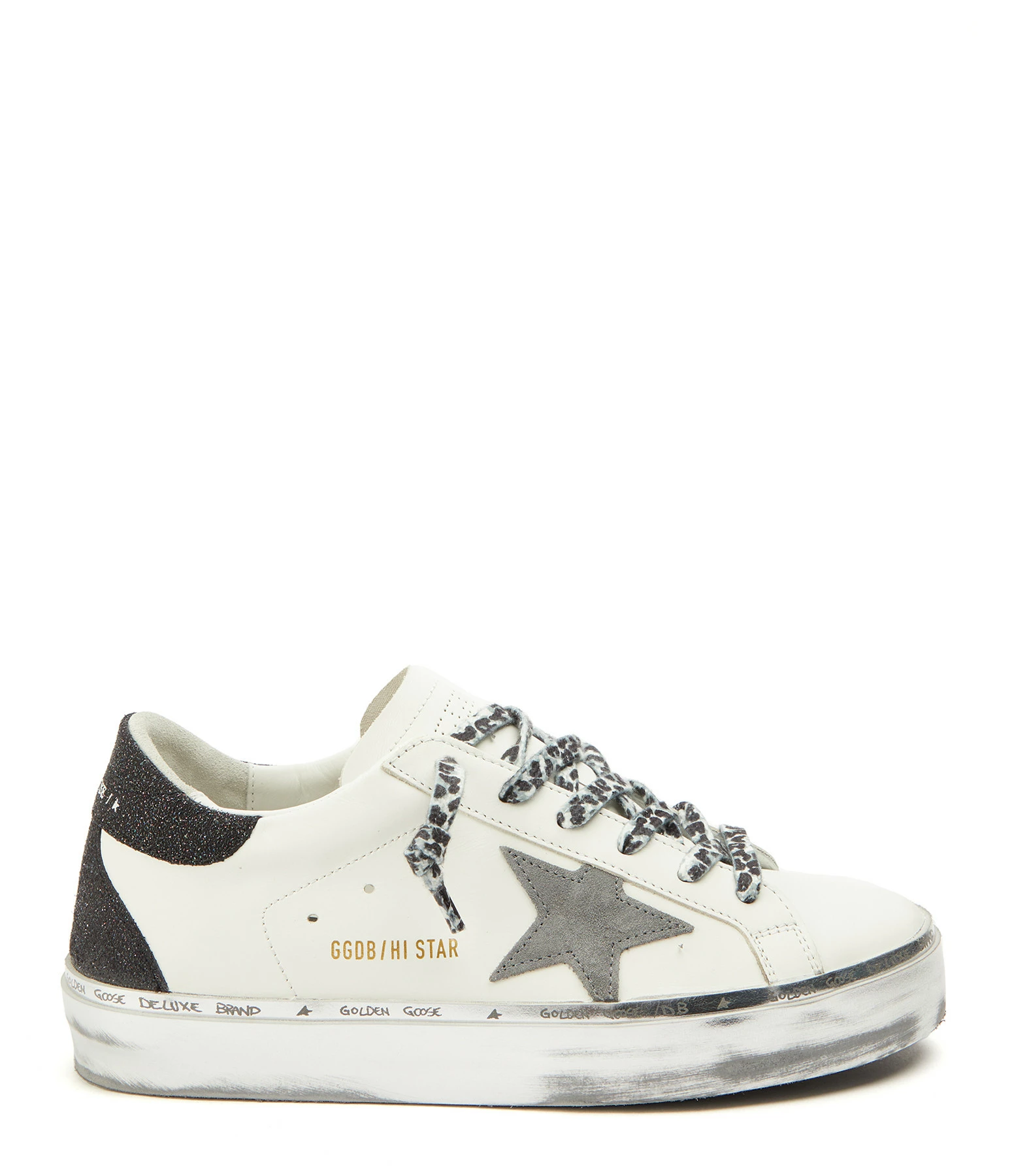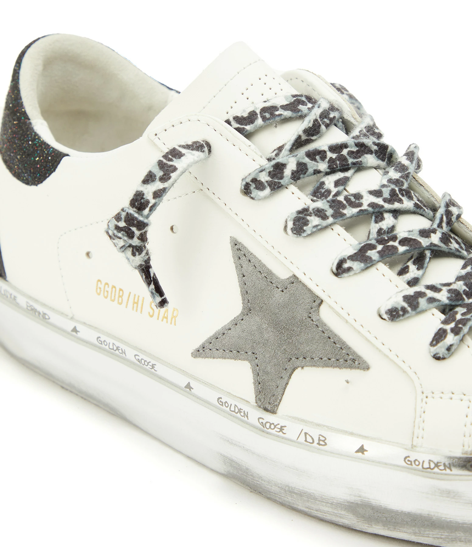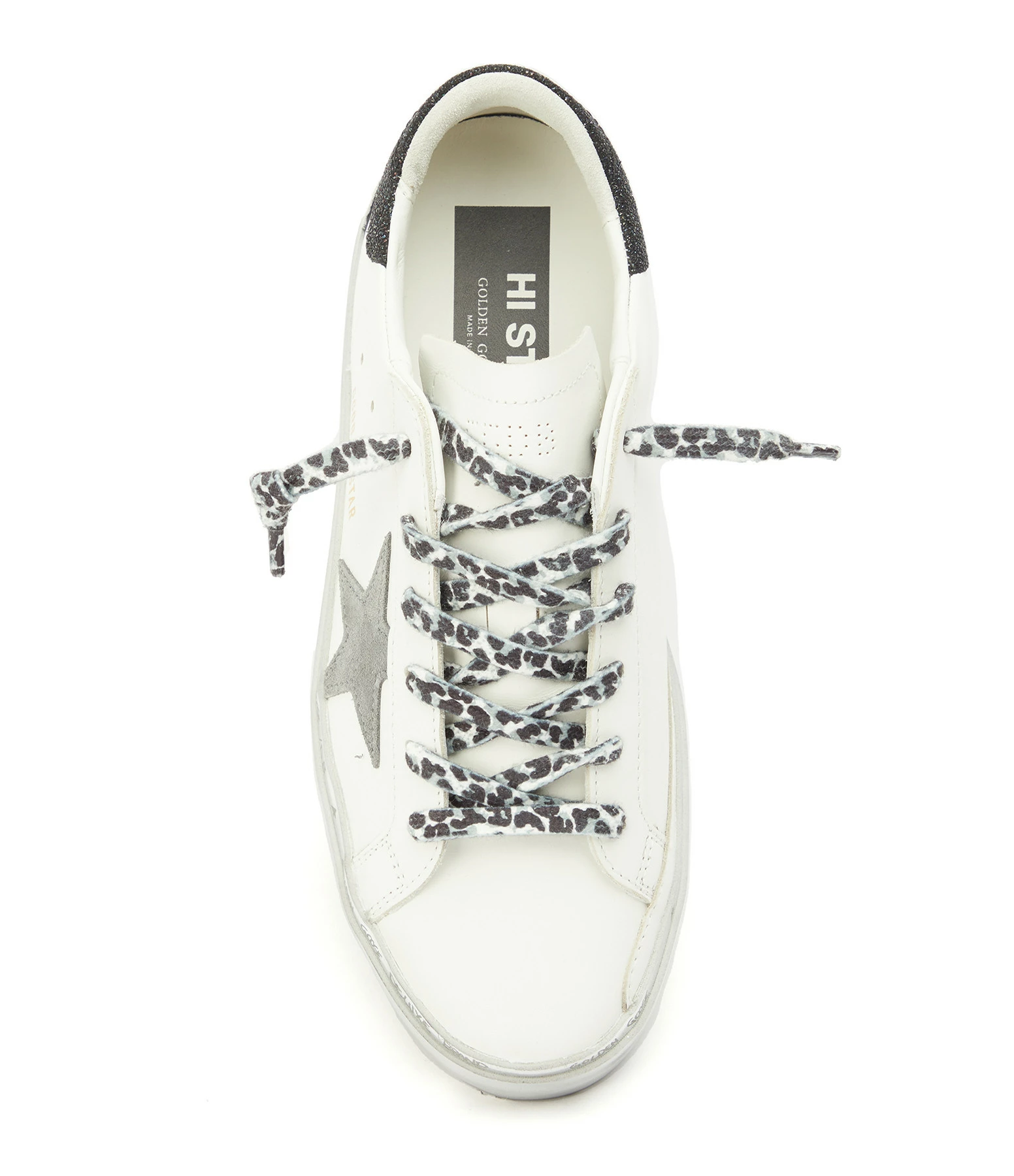 Baskets basses en cuir lisse blanc. Empiècement étoile en cuir suédé gris. Renfort talon en paillettes noires. Lacets imprimés leopard. Semelle compensée avec inscriptions réalisées à la main “GOLDEN GOOSE DELUXE BRAND” et inscription “GGDB/HI STAR” sur le côté extérieur. Intérieur en cuir et maille bouclette.