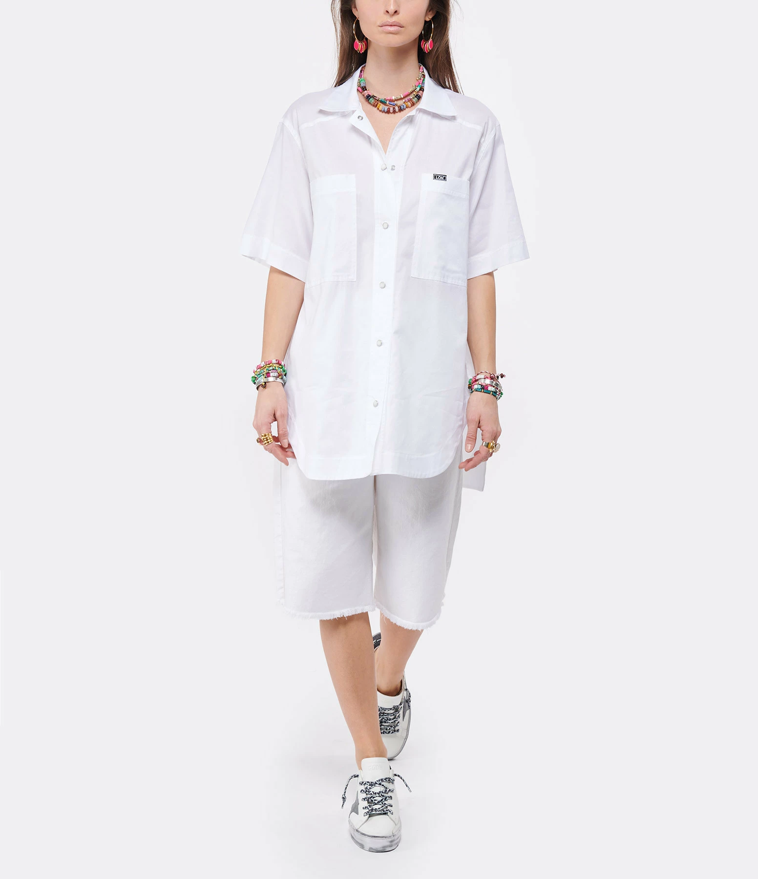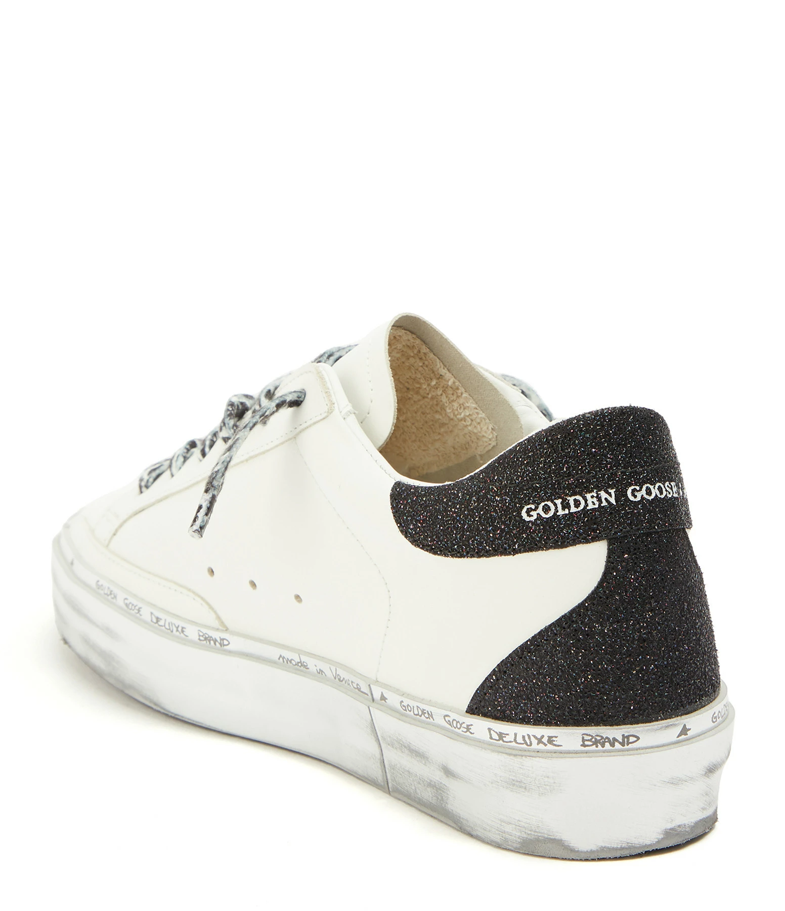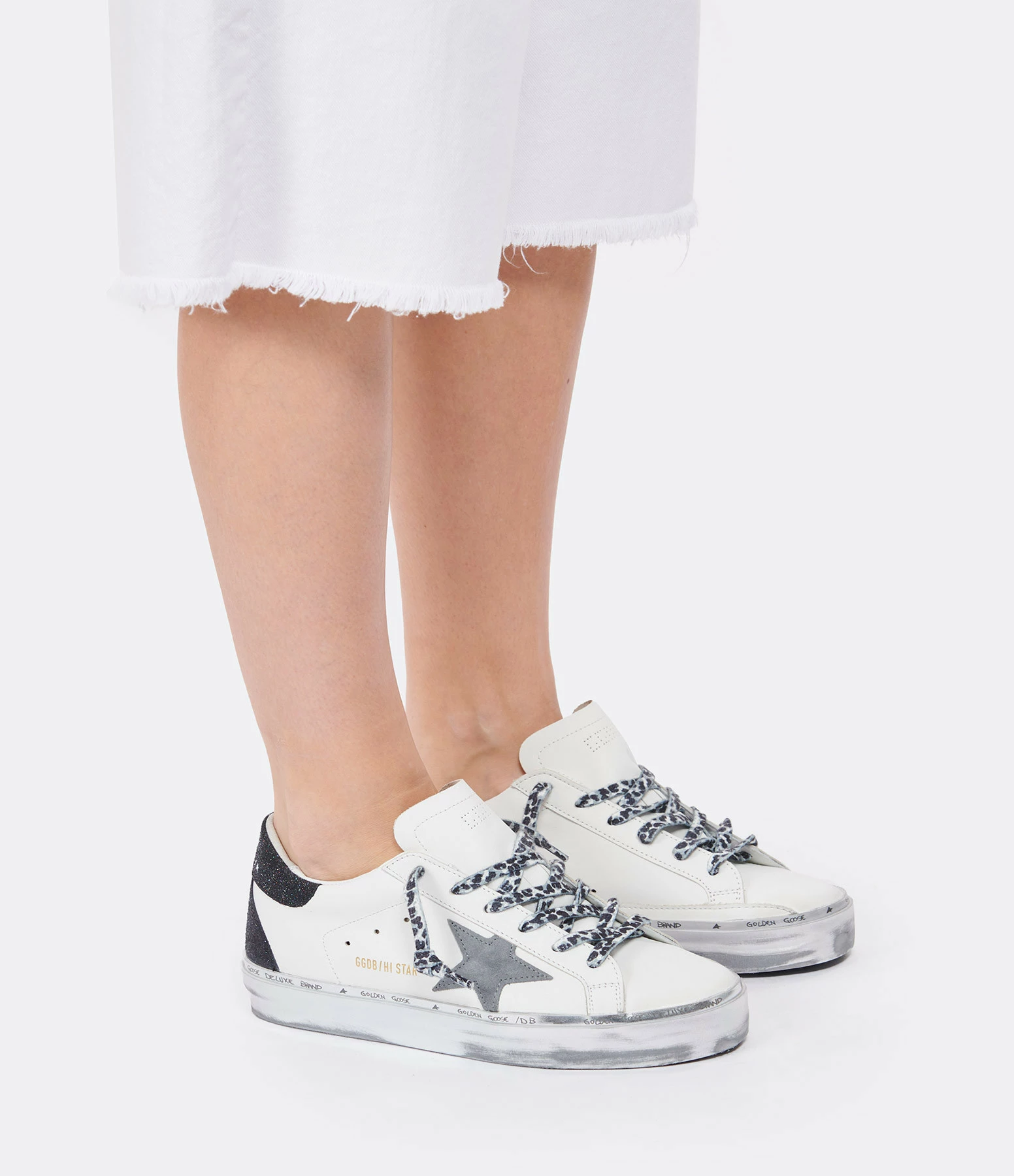 Baskets basses en cuir lisse blanc. Empiècement étoile en cuir suédé gris. Renfort talon en paillettes noires. Lacets imprimés leopard. Semelle compensée avec inscriptions réalisées à la main “GOLDEN GOOSE DELUXE BRAND” et inscription “GGDB/HI STAR” sur le côté extérieur. Intérieur en cuir et maille bouclette.