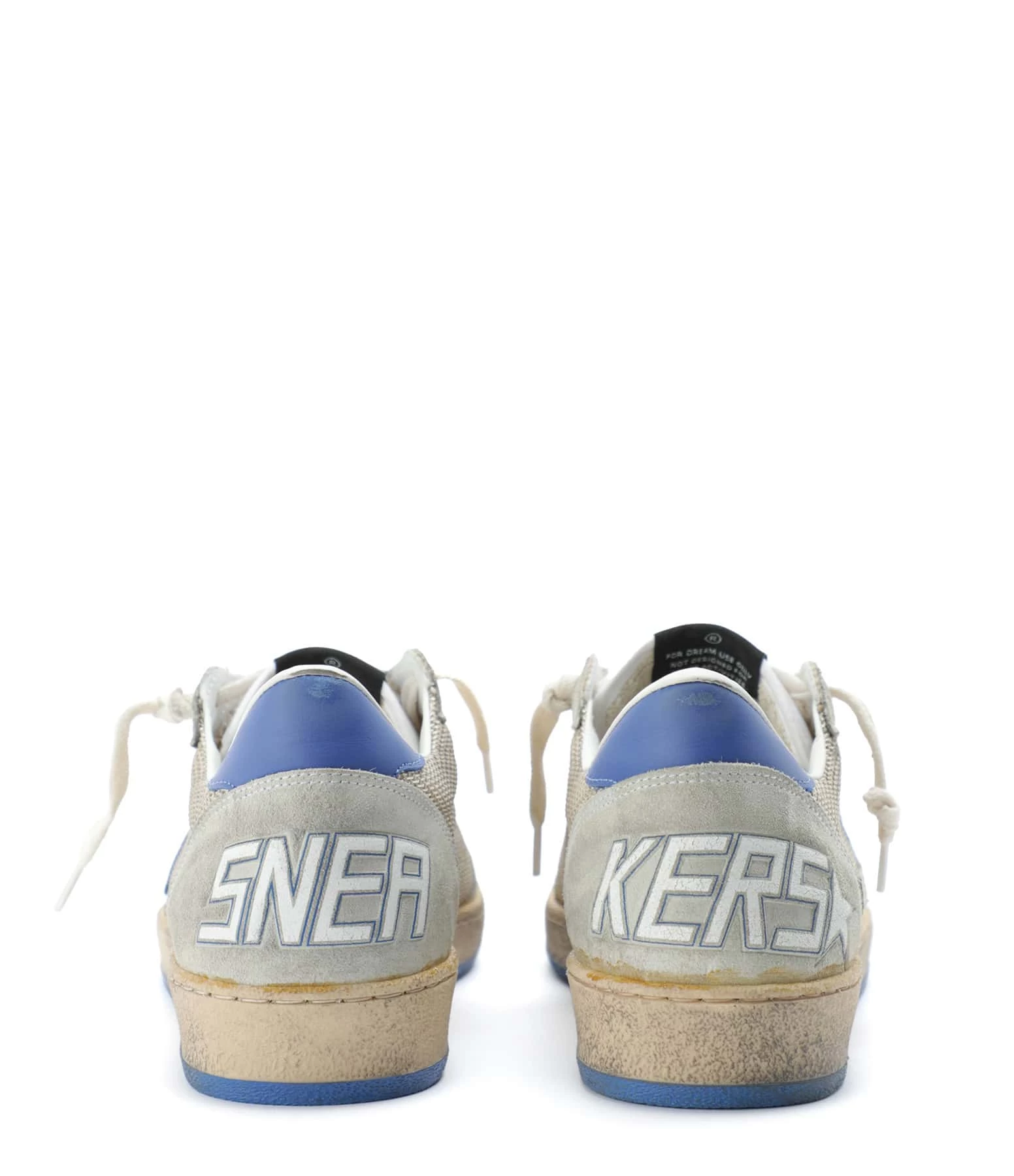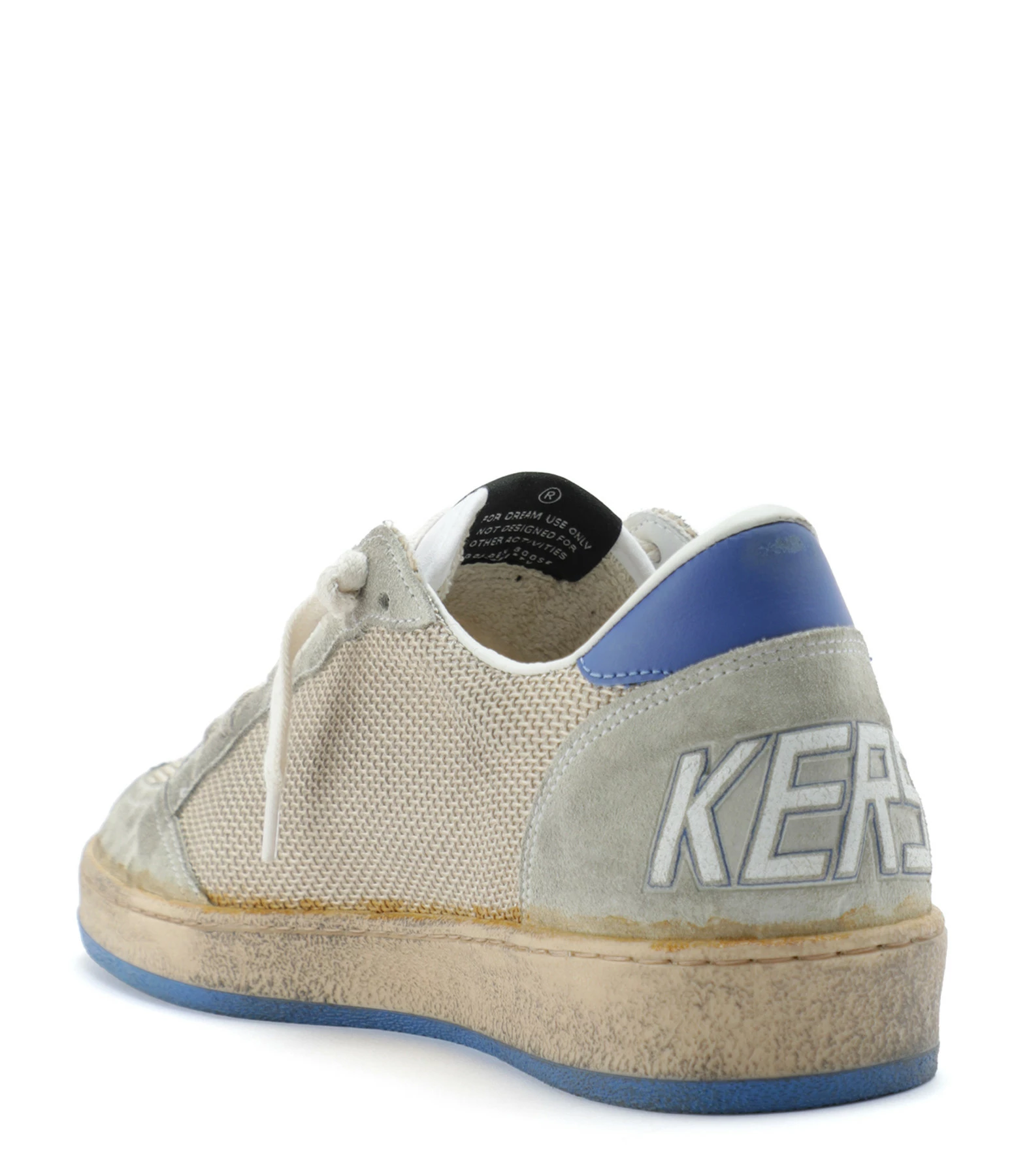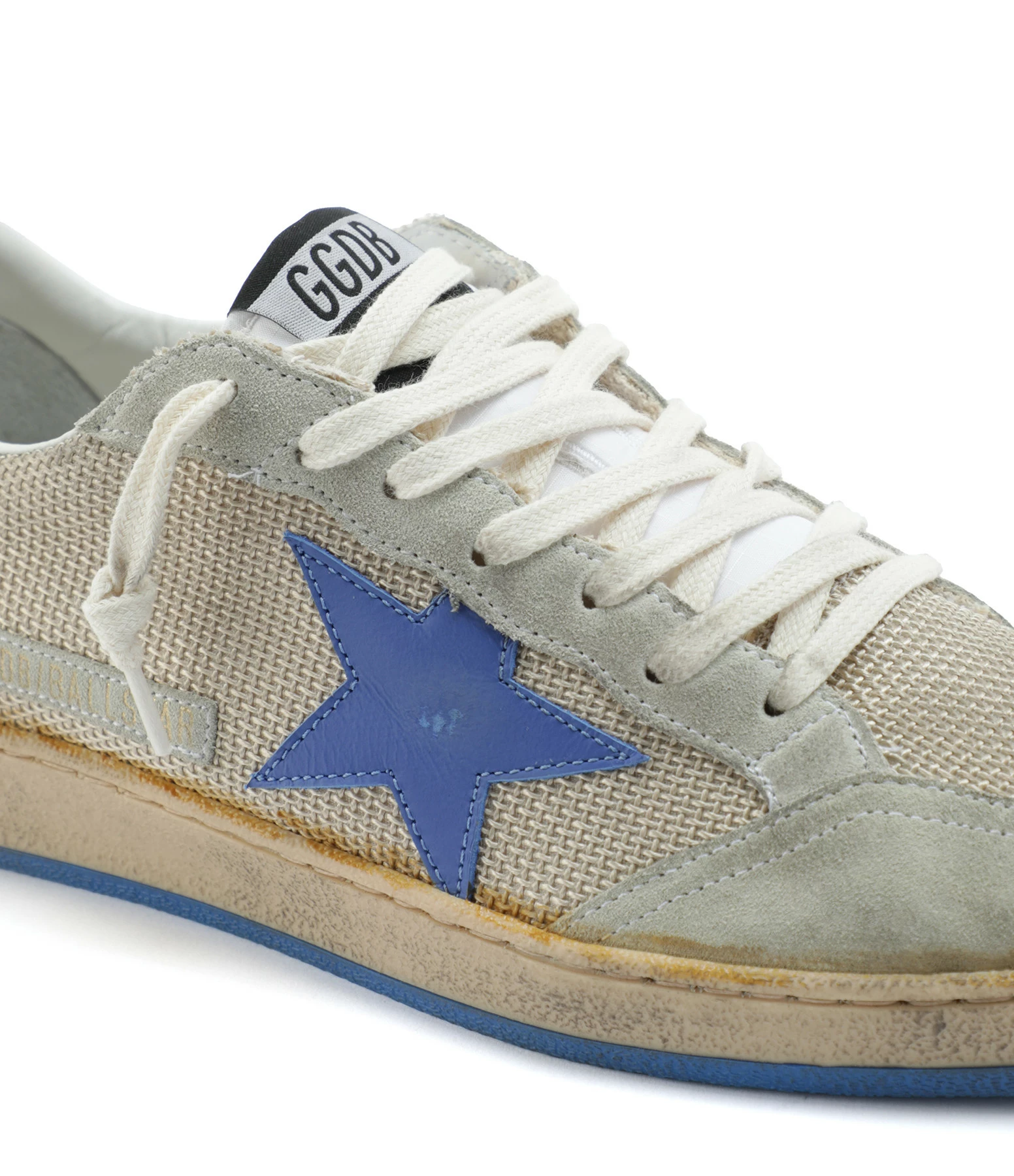 Baskets basses en toile et cuir suédé gris. Empiècement étoile en cuir lisse bleu. Renfort talon en cuir lisse bleu. Lacets écrus. Inscription “SNEA” sur le talon gauche et “KERS” sur le talon droit et “GGDB / BALLSTAR” sur le côté extérieur du pied droit. Semelles bleues. Intérieur en cuir et maille bouclette.