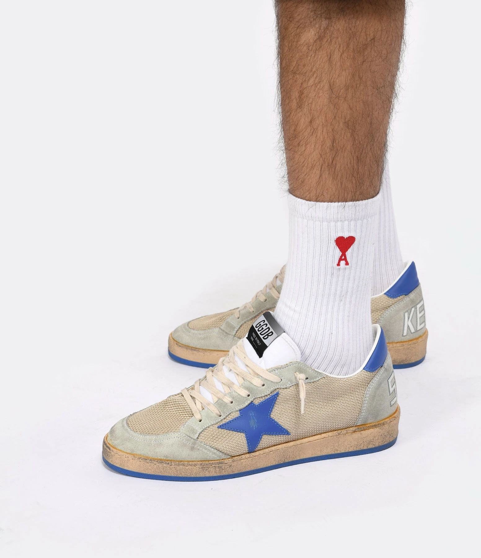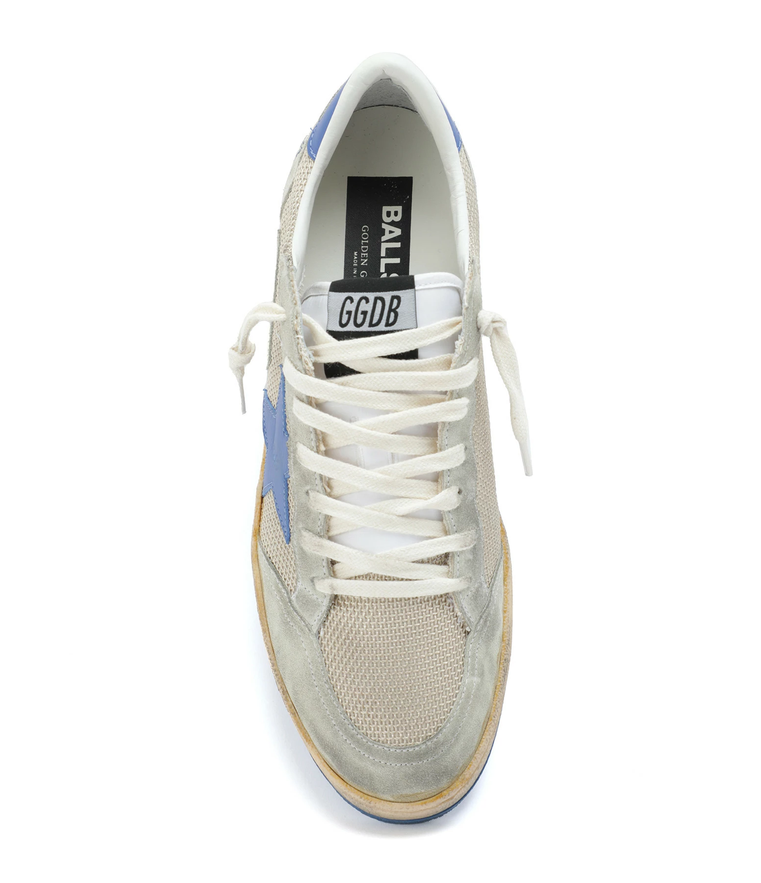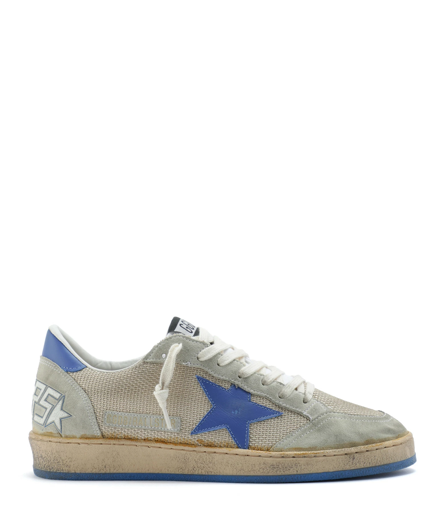 Baskets basses en toile et cuir suédé gris. Empiècement étoile en cuir lisse bleu. Renfort talon en cuir lisse bleu. Lacets écrus. Inscription “SNEA” sur le talon gauche et “KERS” sur le talon droit et “GGDB / BALLSTAR” sur le côté extérieur du pied droit. Semelles bleues. Intérieur en cuir et maille bouclette.