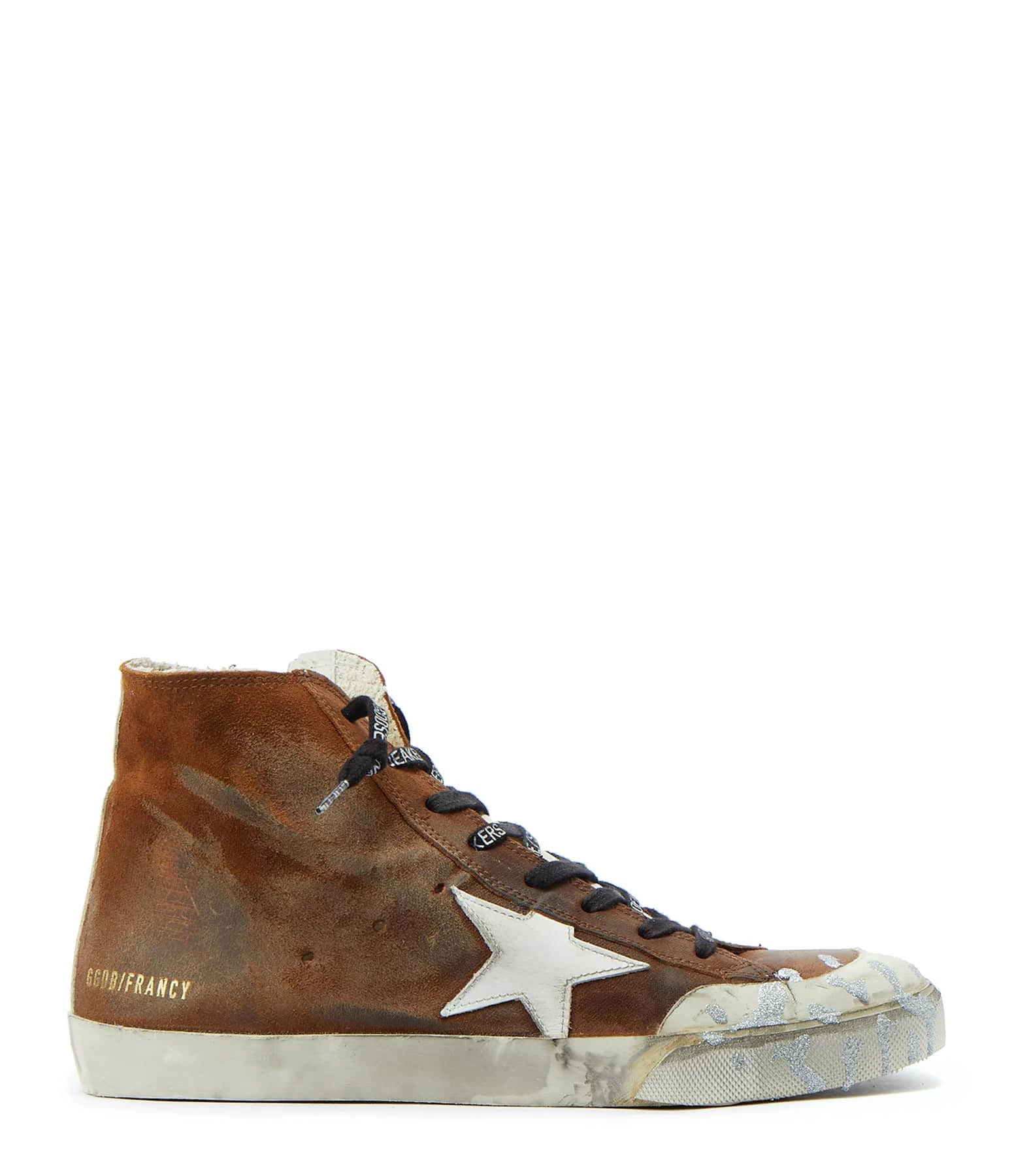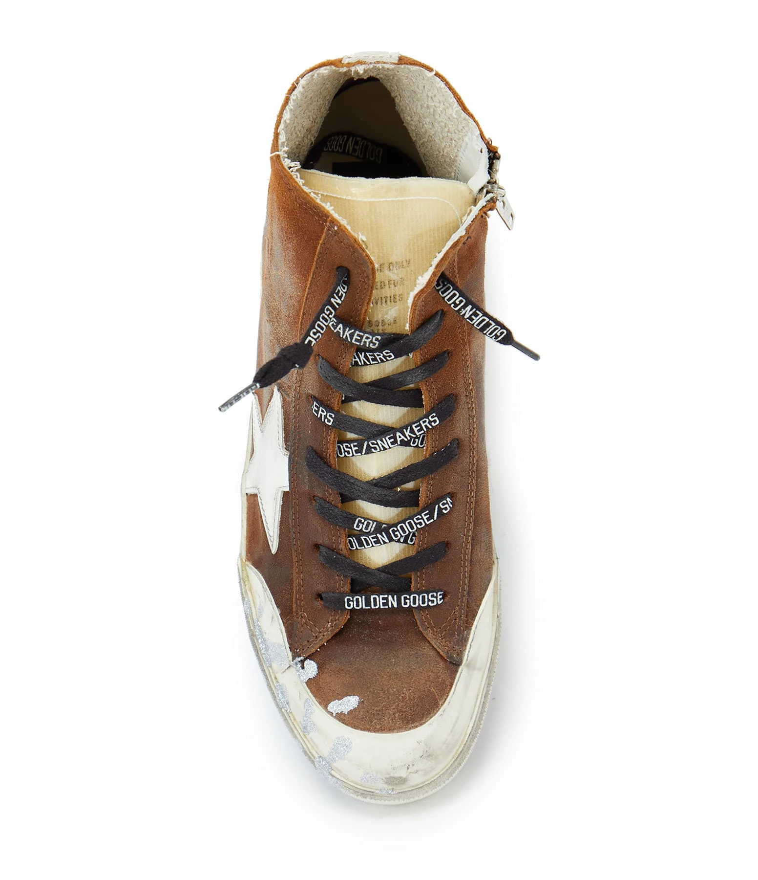 Baskets montantes en cuir suédé marron. Empiècement étoile en cuir lisse blanc. Lacets noirs sérigraphiés. Languette plastifiée. Effets taches de peintures à paillettes argentées. Fermeture par zip sur le côté. Intérieur en cuir et en maille bouclette.