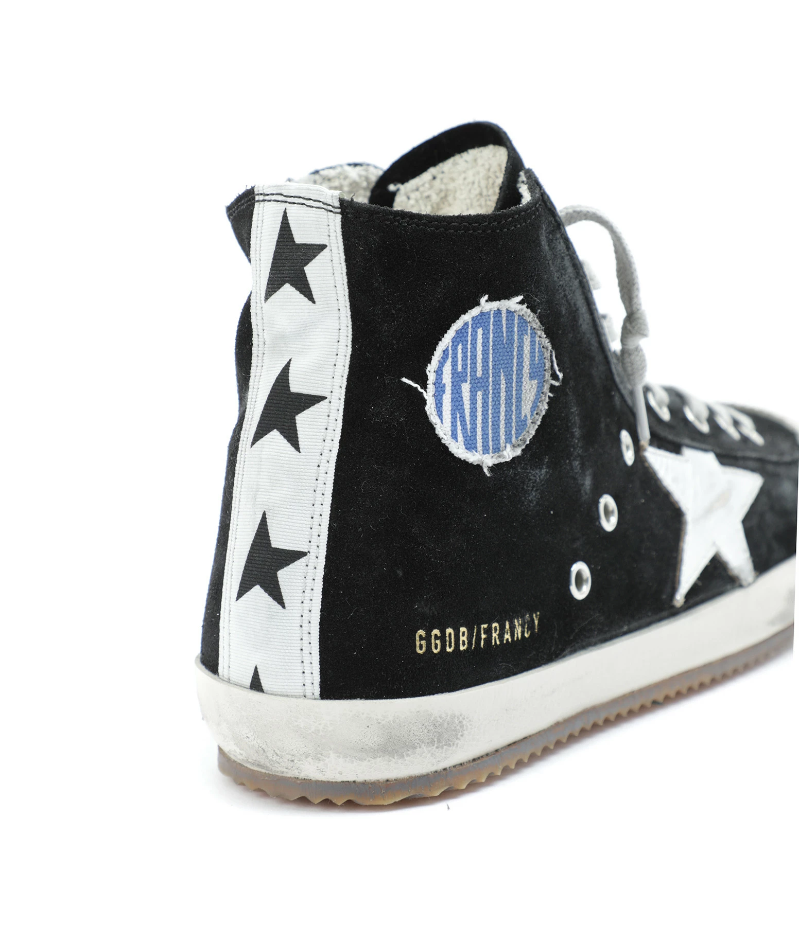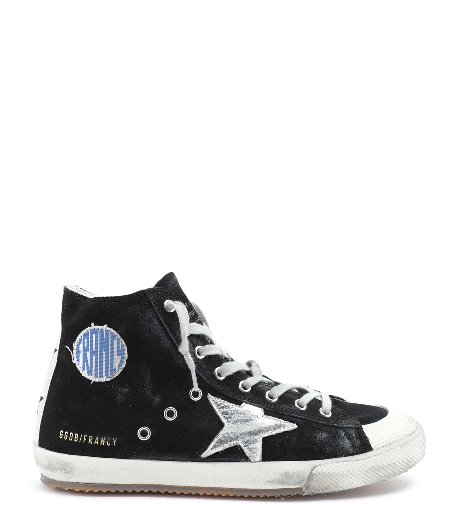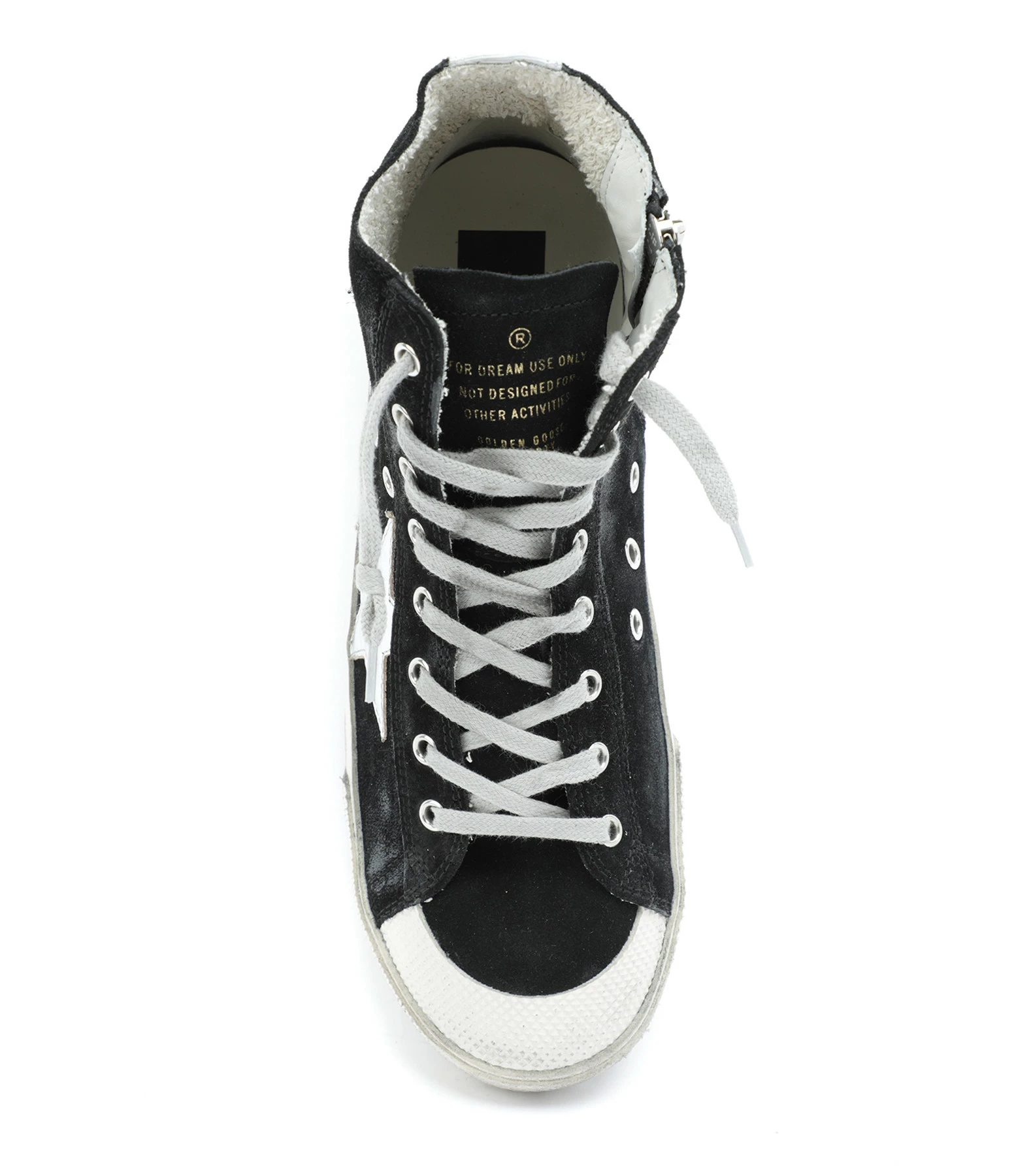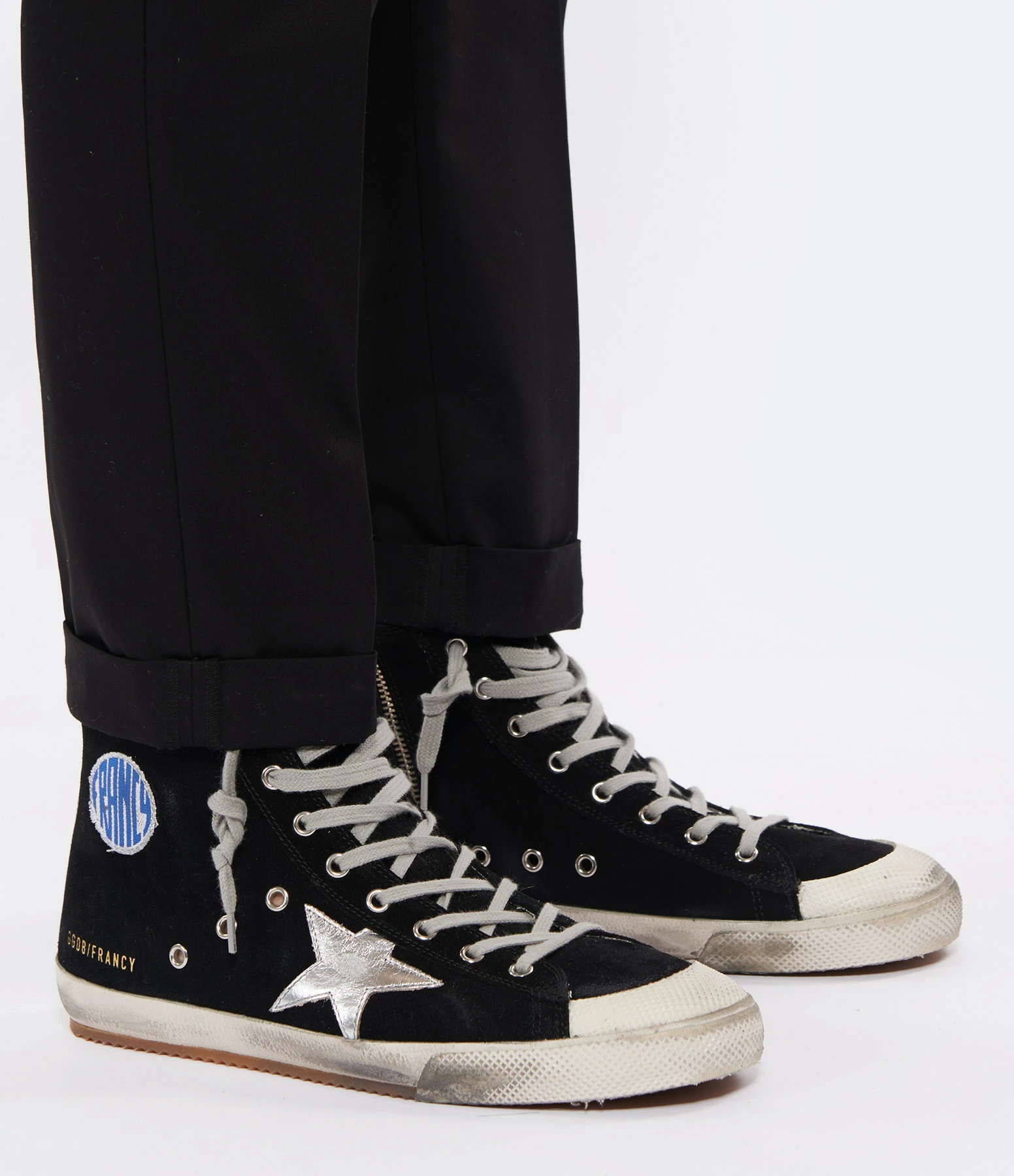 Baskets montantes pour homme en cuir suédé noir. Empiècement étoile en cuir lisse argenté. Tige en tissus blanc à imprimé étoile. Lacets gris. Fermeture par zip sur le côté. Intérieur en cuir et maille bouclette.