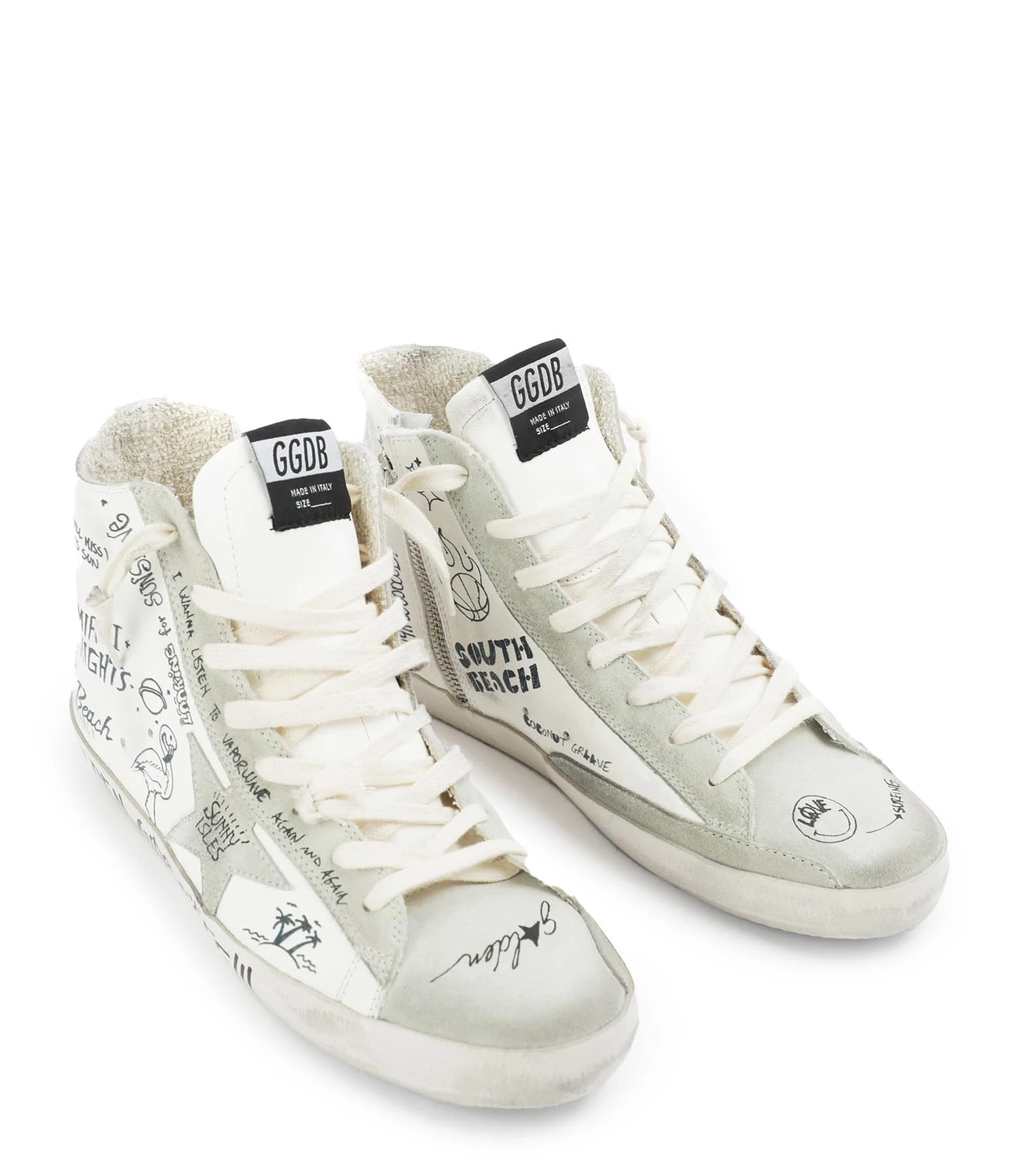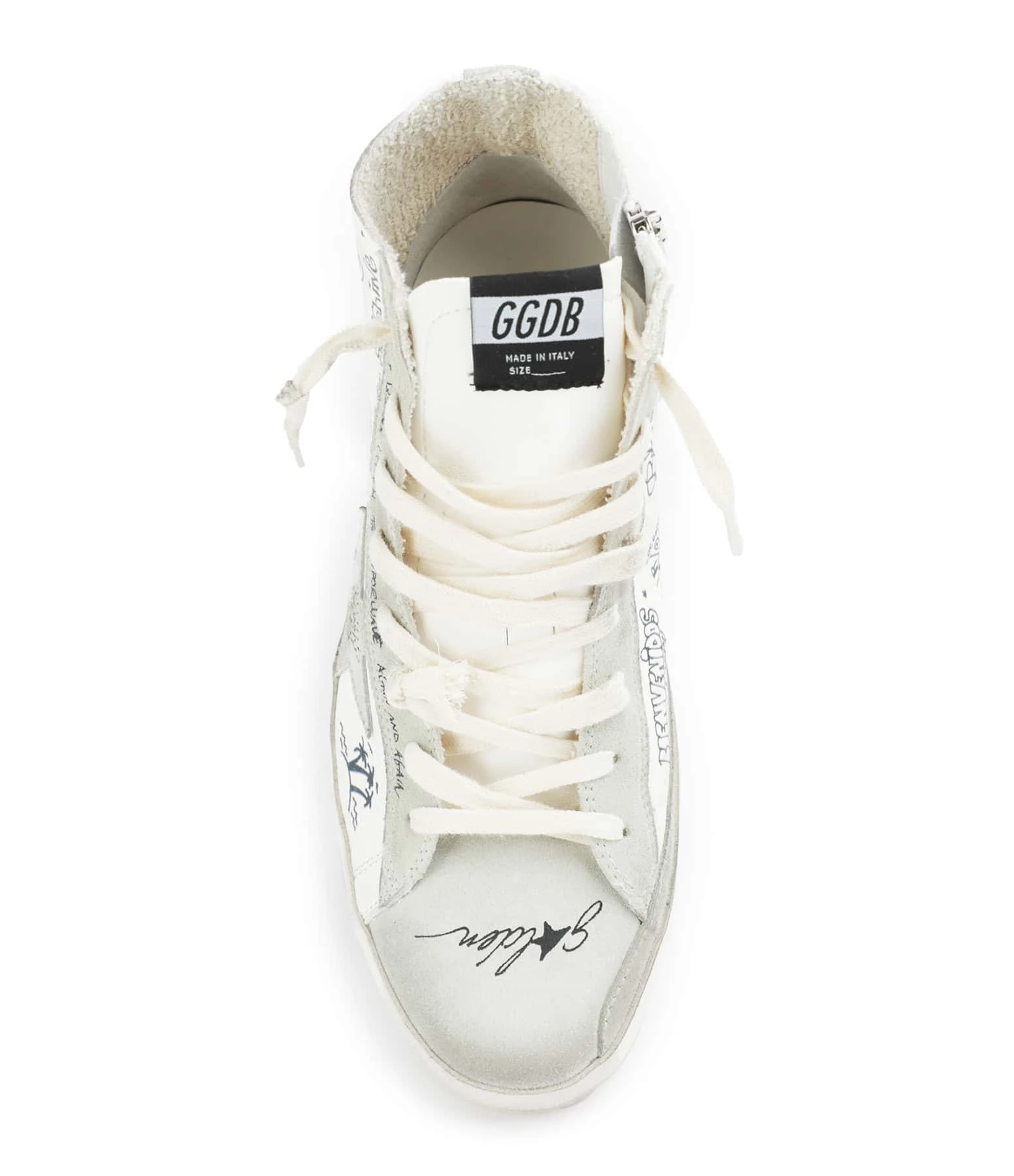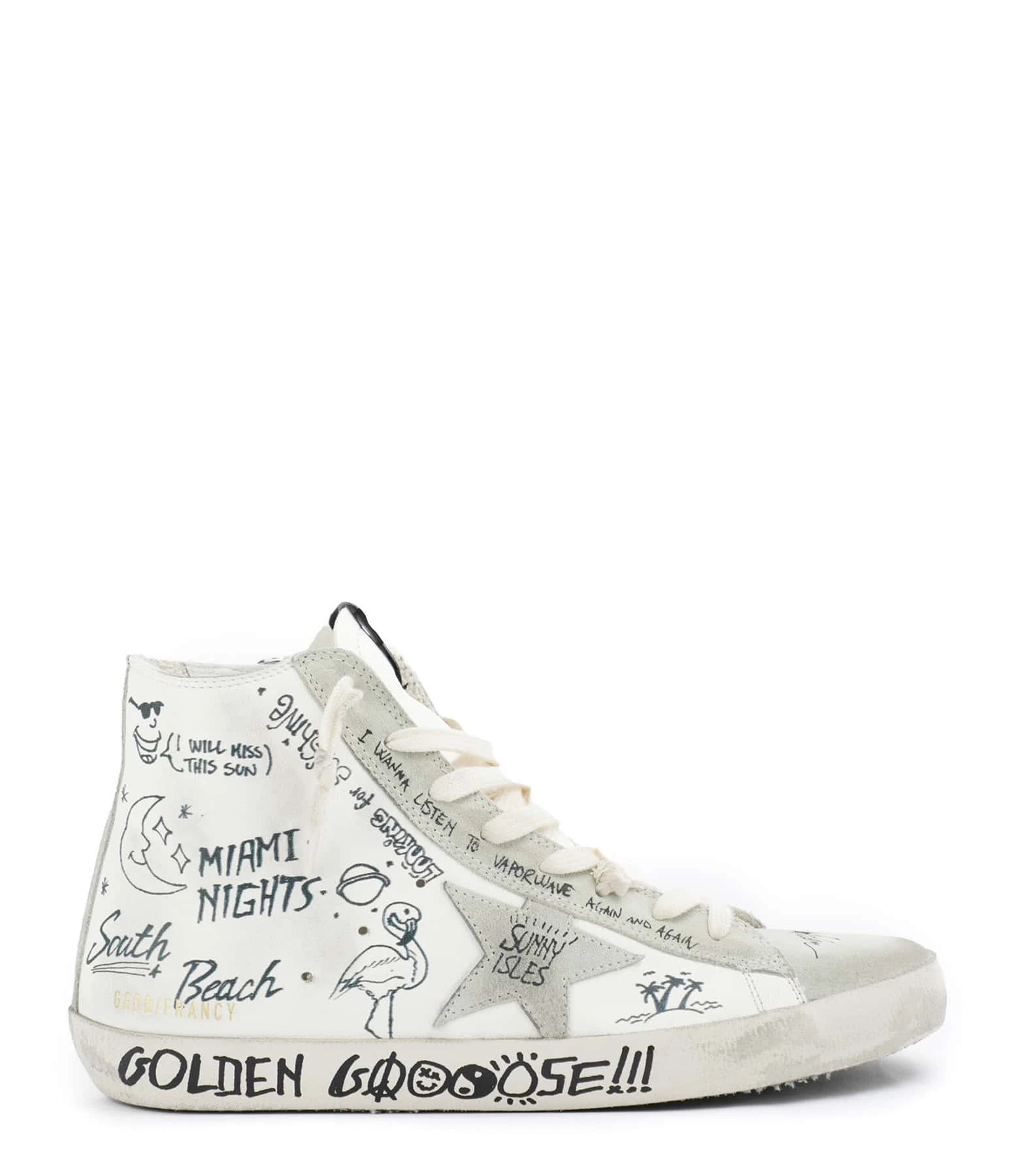 Baskets montantes pour homme en cuir lisse blanc avec sérigraphies noires. Empiècement étoile en cuir suédé gris avec sérigraphies noires. Lacets écrus. Fermeture par zip sur le côté. Inscription “GGDB/FRANCY” sur le côté extérieur. Inscription “Golden Goose” sur la semelle droite. Intérieur en cuir et maille bouclette.