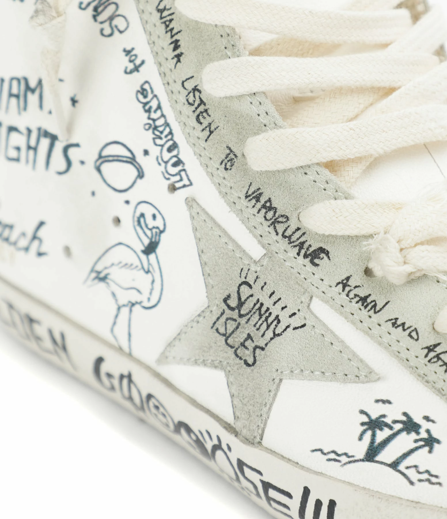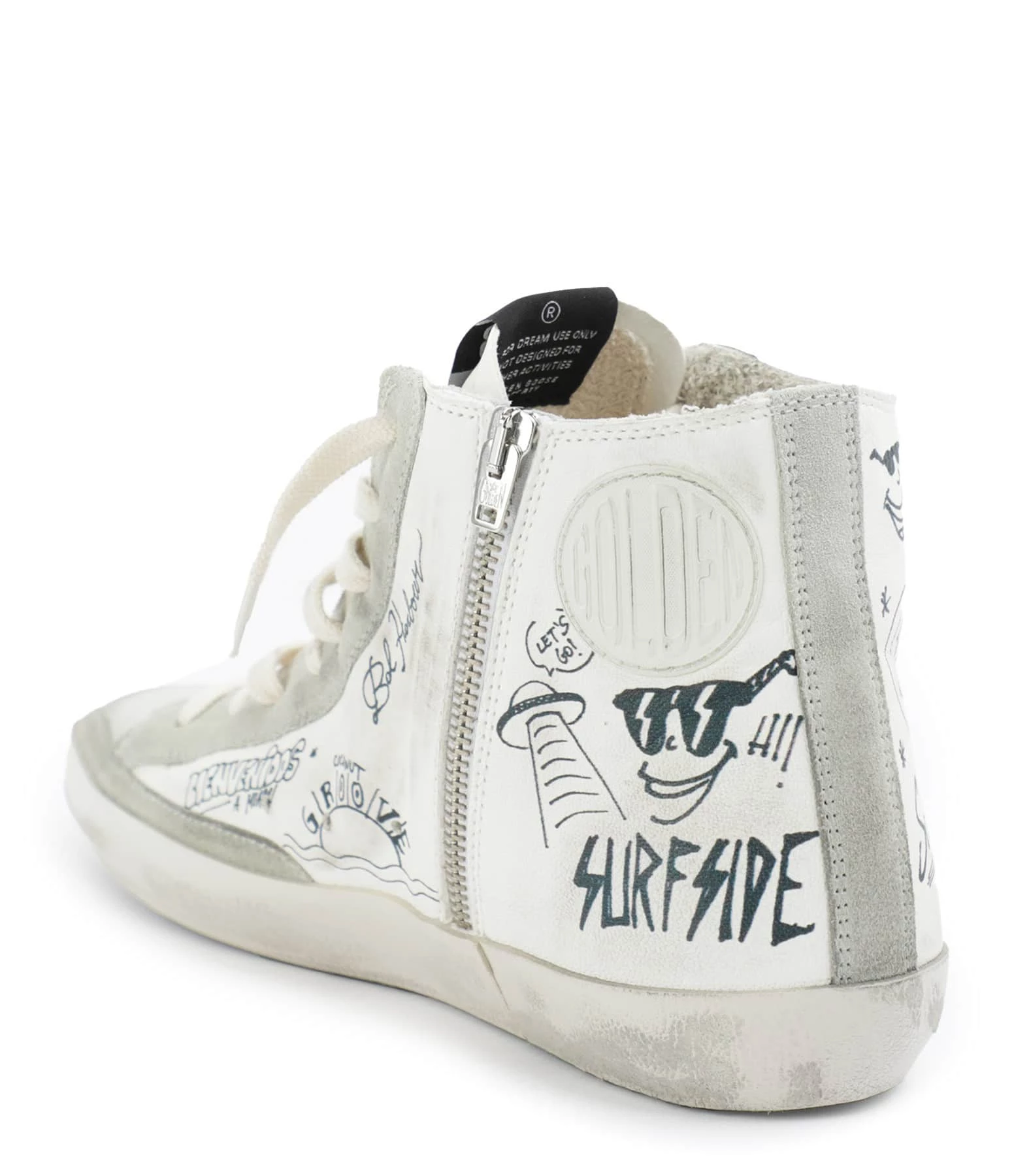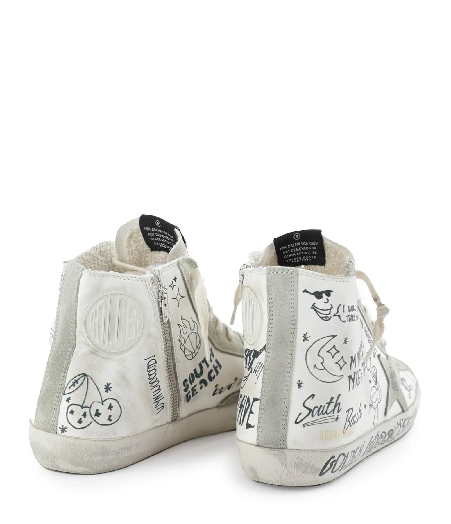Baskets montantes pour homme en cuir lisse blanc avec sérigraphies noires. Empiècement étoile en cuir suédé gris avec sérigraphies noires. Lacets écrus. Fermeture par zip sur le côté. Inscription “GGDB/FRANCY” sur le côté extérieur. Inscription “Golden Goose” sur la semelle droite. Intérieur en cuir et maille bouclette.