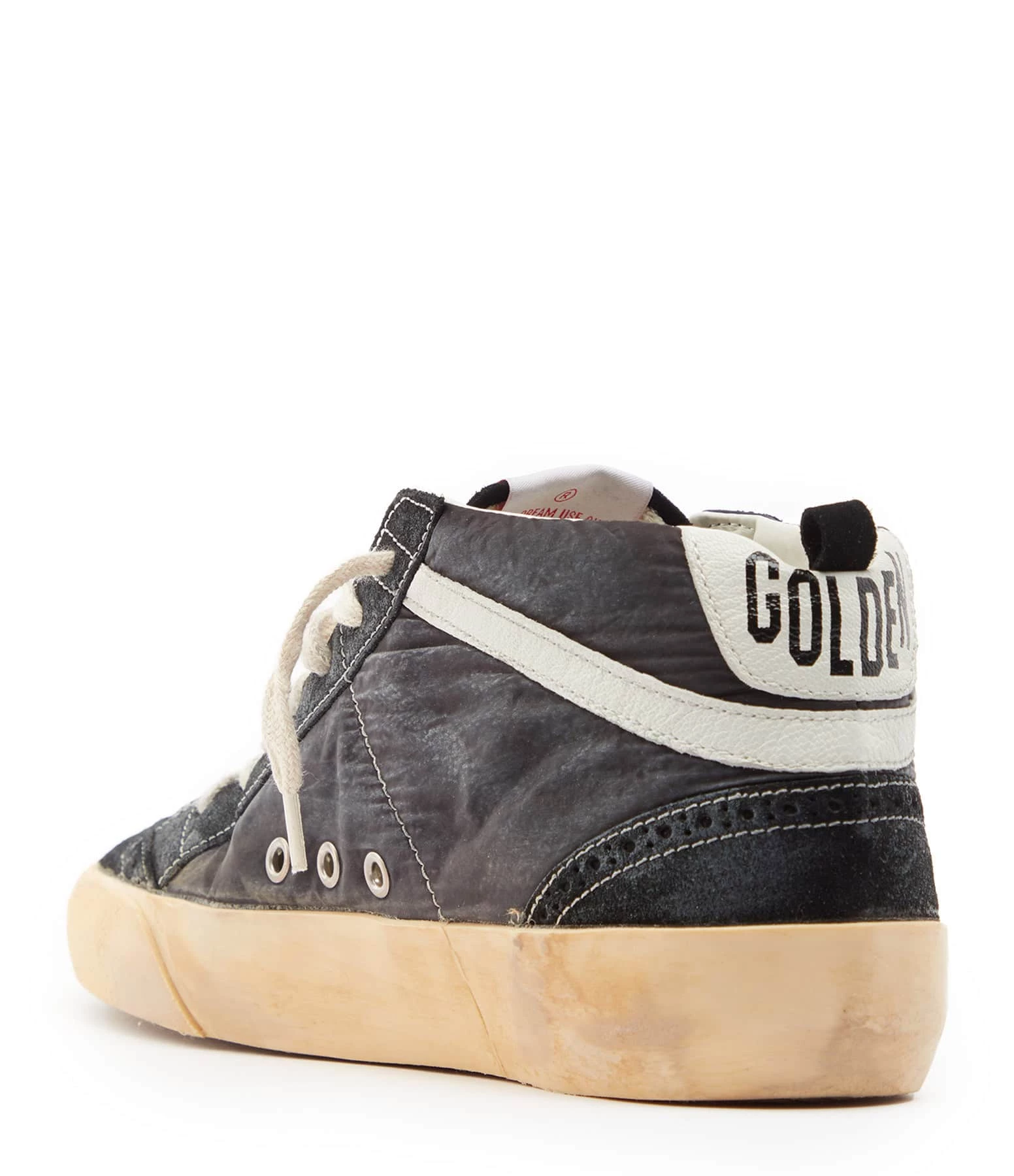 Baskets montantes en cuir noir. Empiècement étoile et renfort talon en cuir blanc. Lacets écrus. Petite inscription “GGDB MID/STAR” doré sur le pied droit. Intérieur en cuir et maille bouclette.