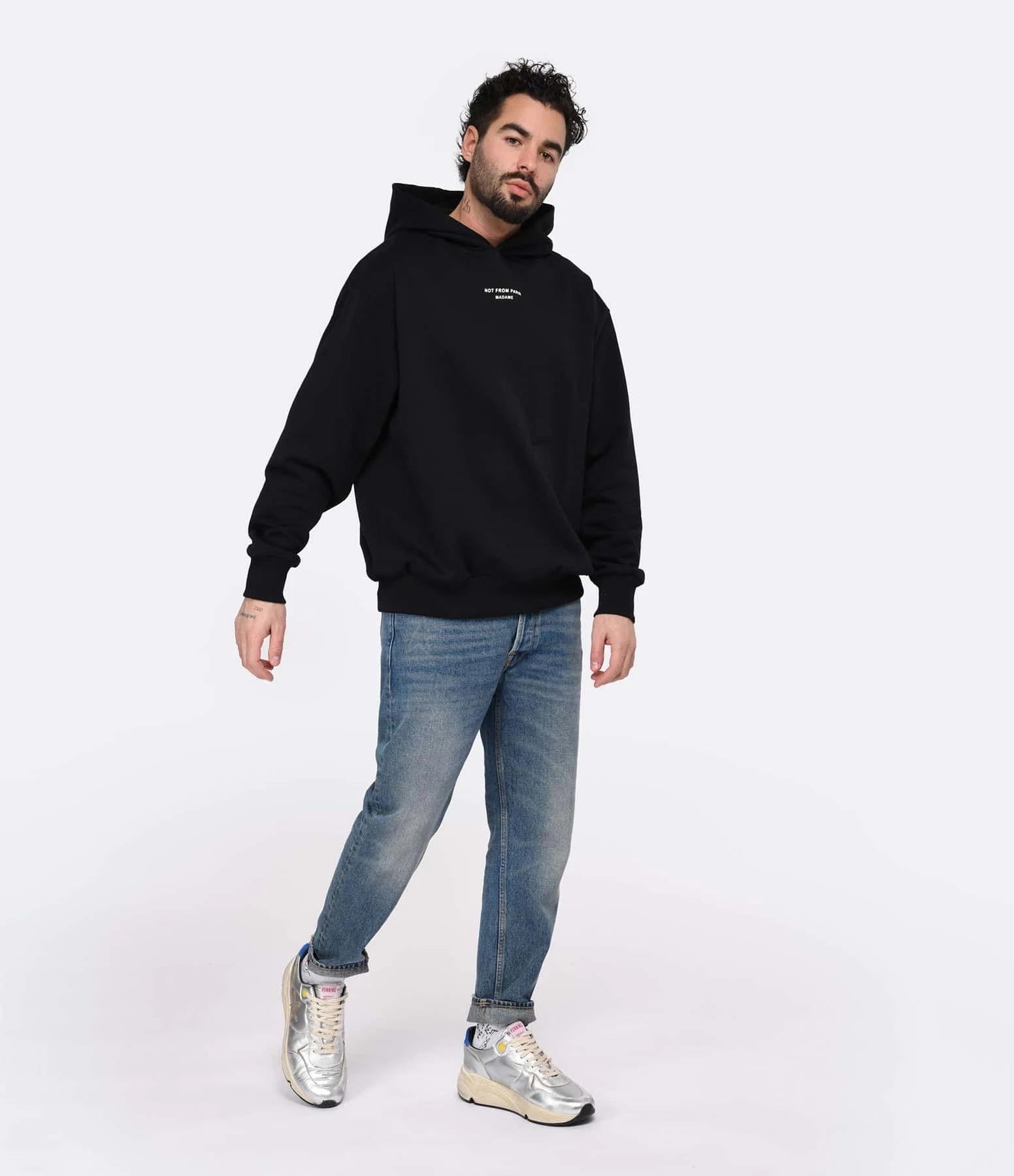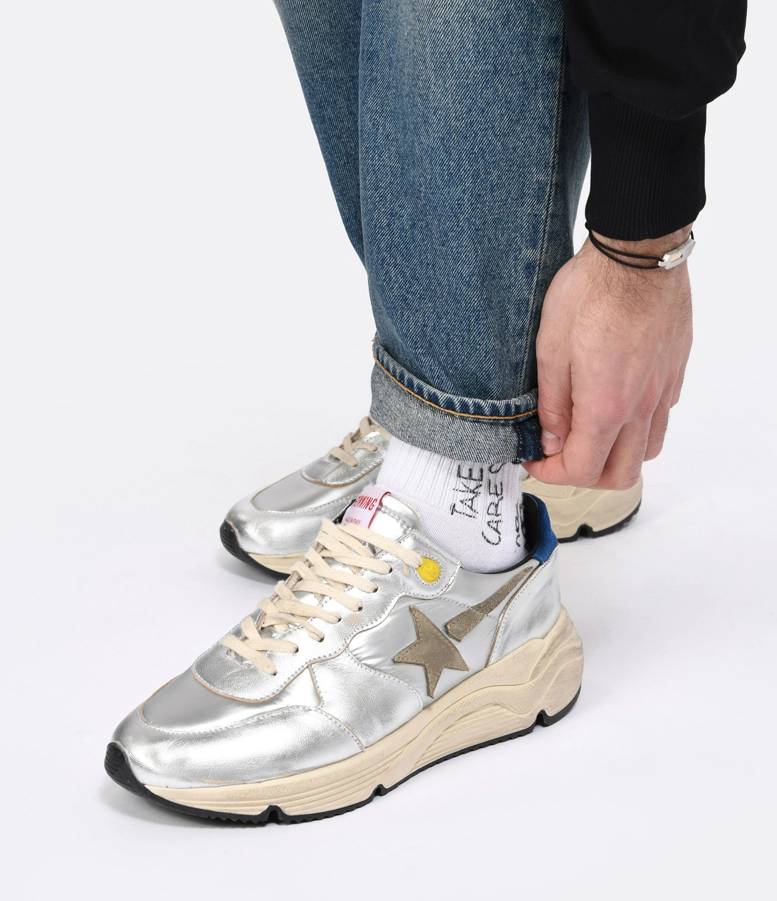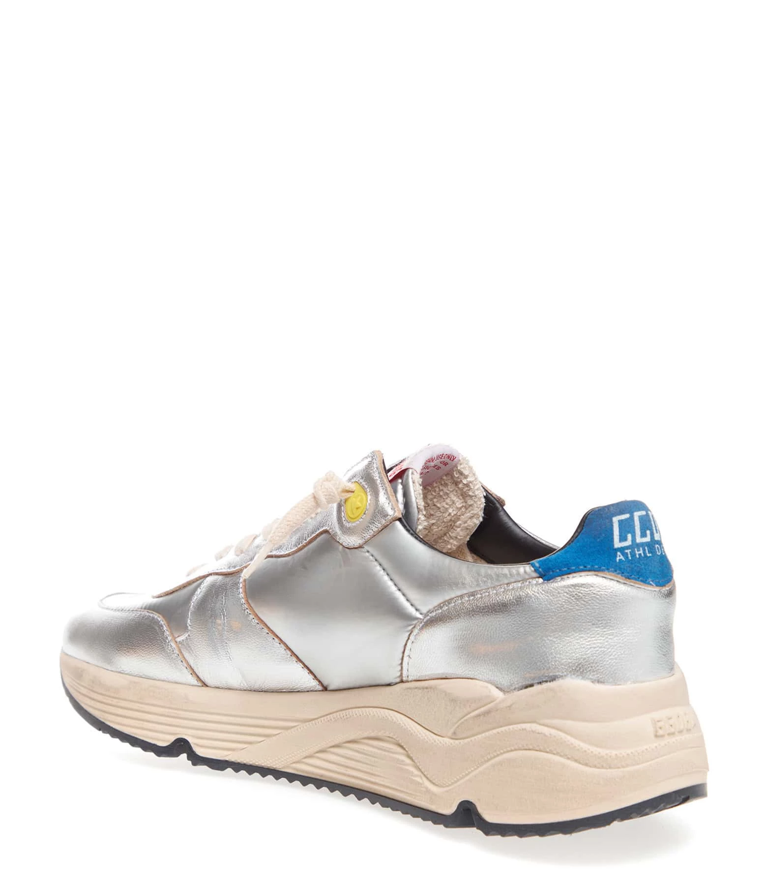 Baskets running en cuir argenté multi-matière. Empiècement étoile en cuir suédé beige et renfort talon en cuir suédé bleu. Lacets écrus. Intérieur en maille bouclette et cuir.