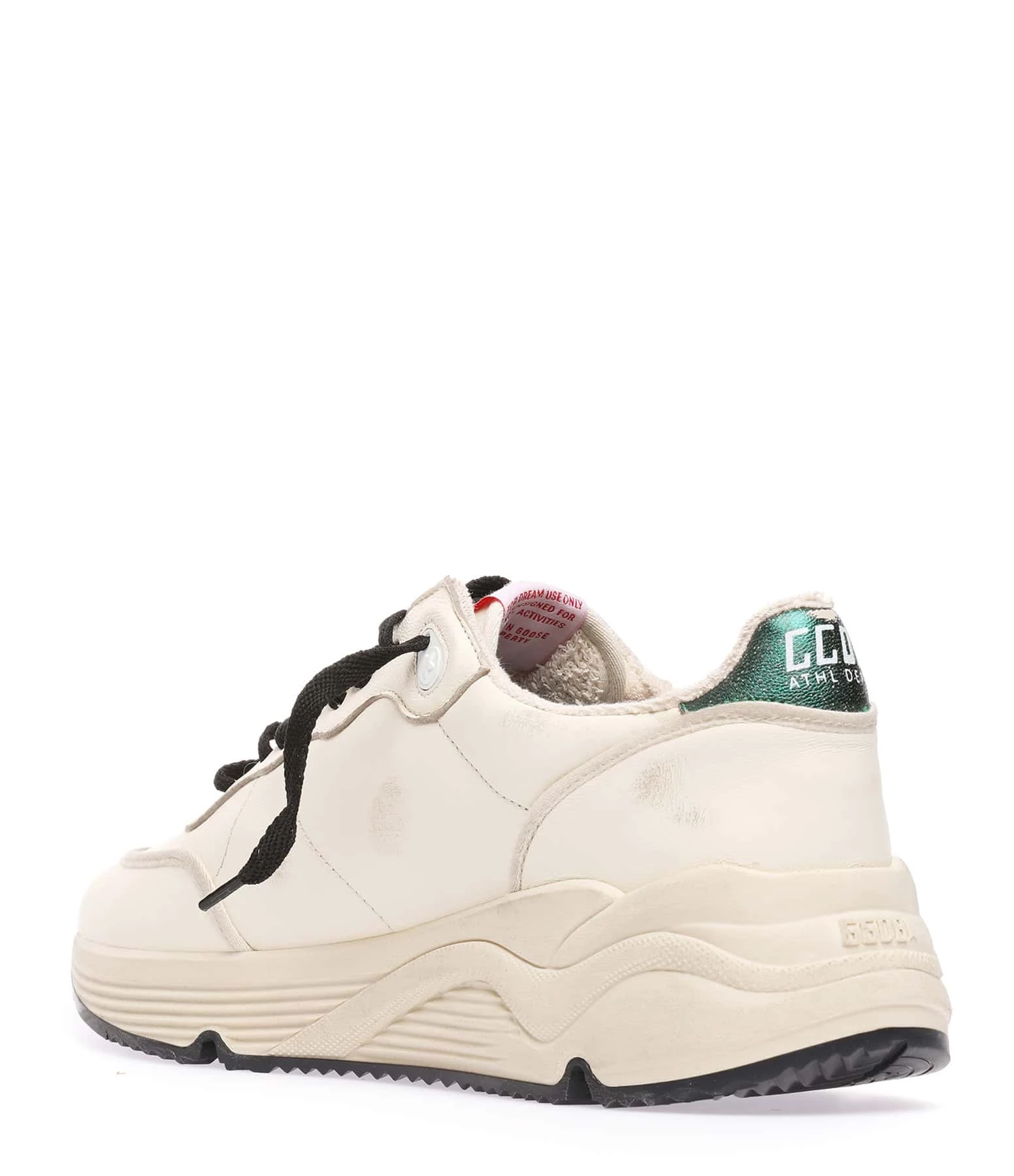 Baskets running en cuir lisse blanc. Empiècement étoile en cuir lisse noir et renfort talon en cuir métallisé vert. Lacets noirs. Intérieur en maille bouclette et cuir. Inscription “GGDB/RSOLE.” sur le côté.