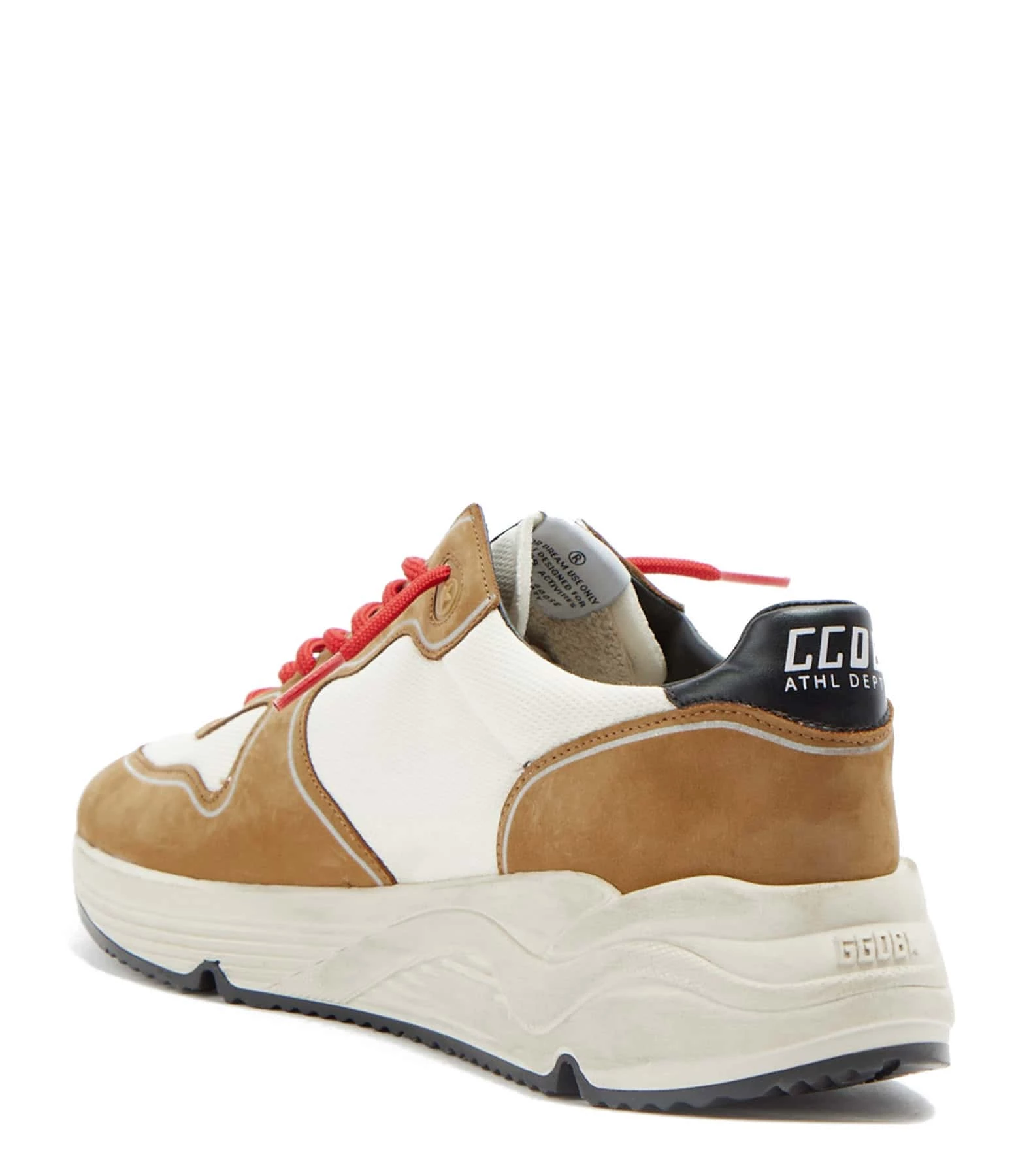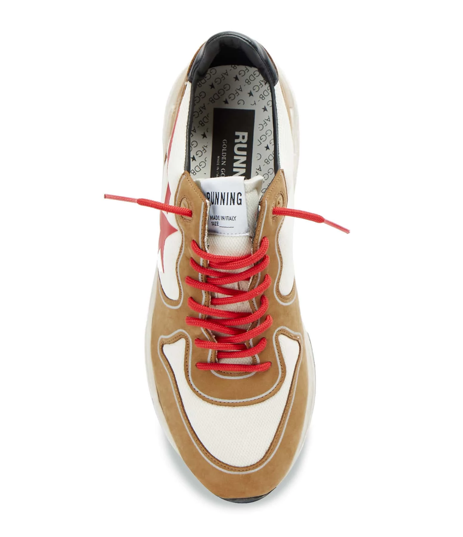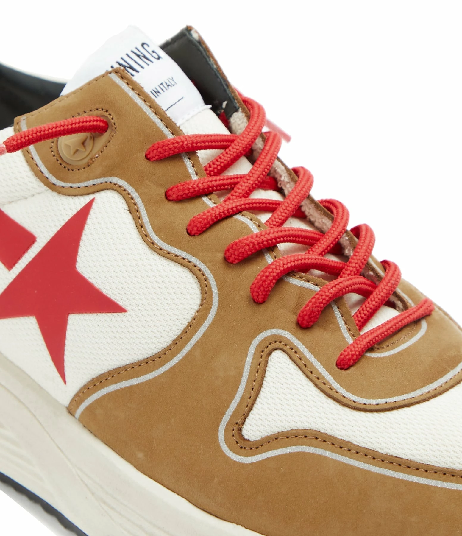 Baskets running en cuir nubuck marron et tissu blanc pour homme. Empiècement étoile en caoutchouc rouge. Renfort talon en cuir lisse noir. Lacets rouges. Intérieur en maille bouclette et cuir.