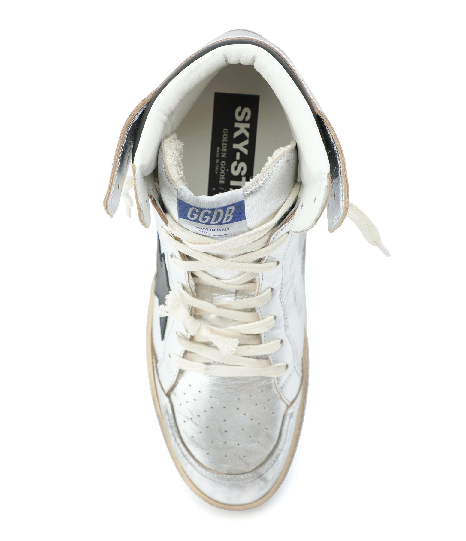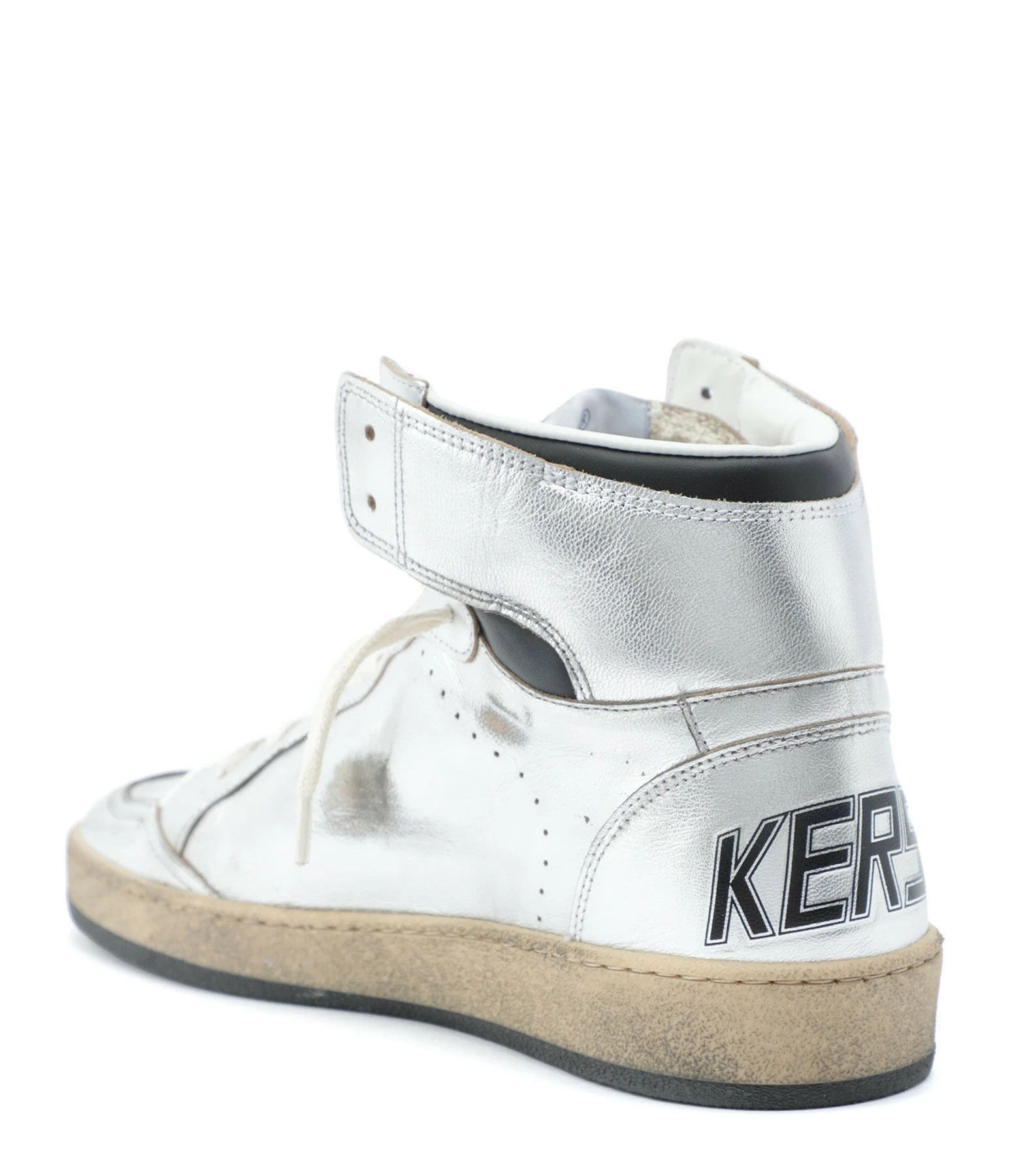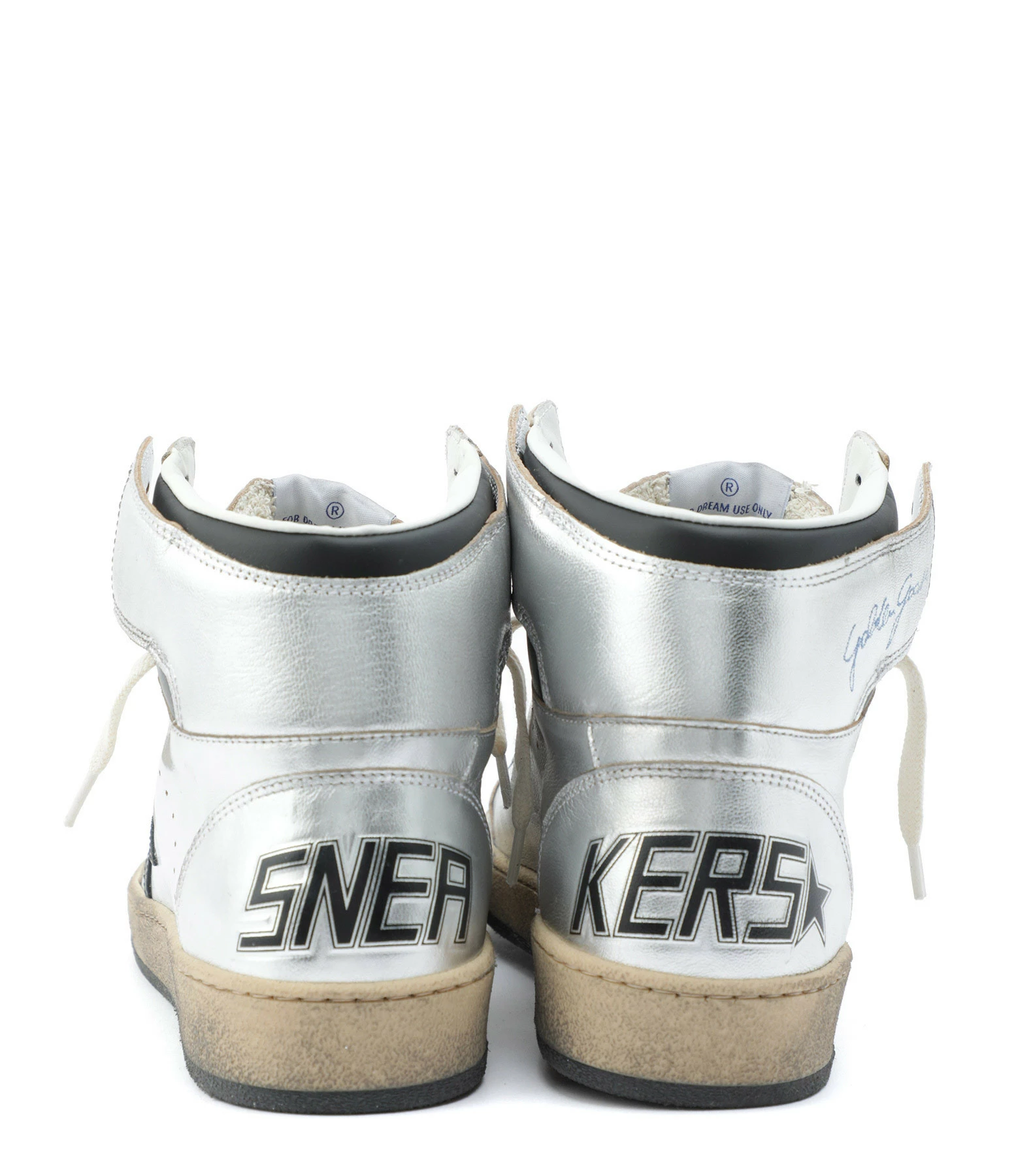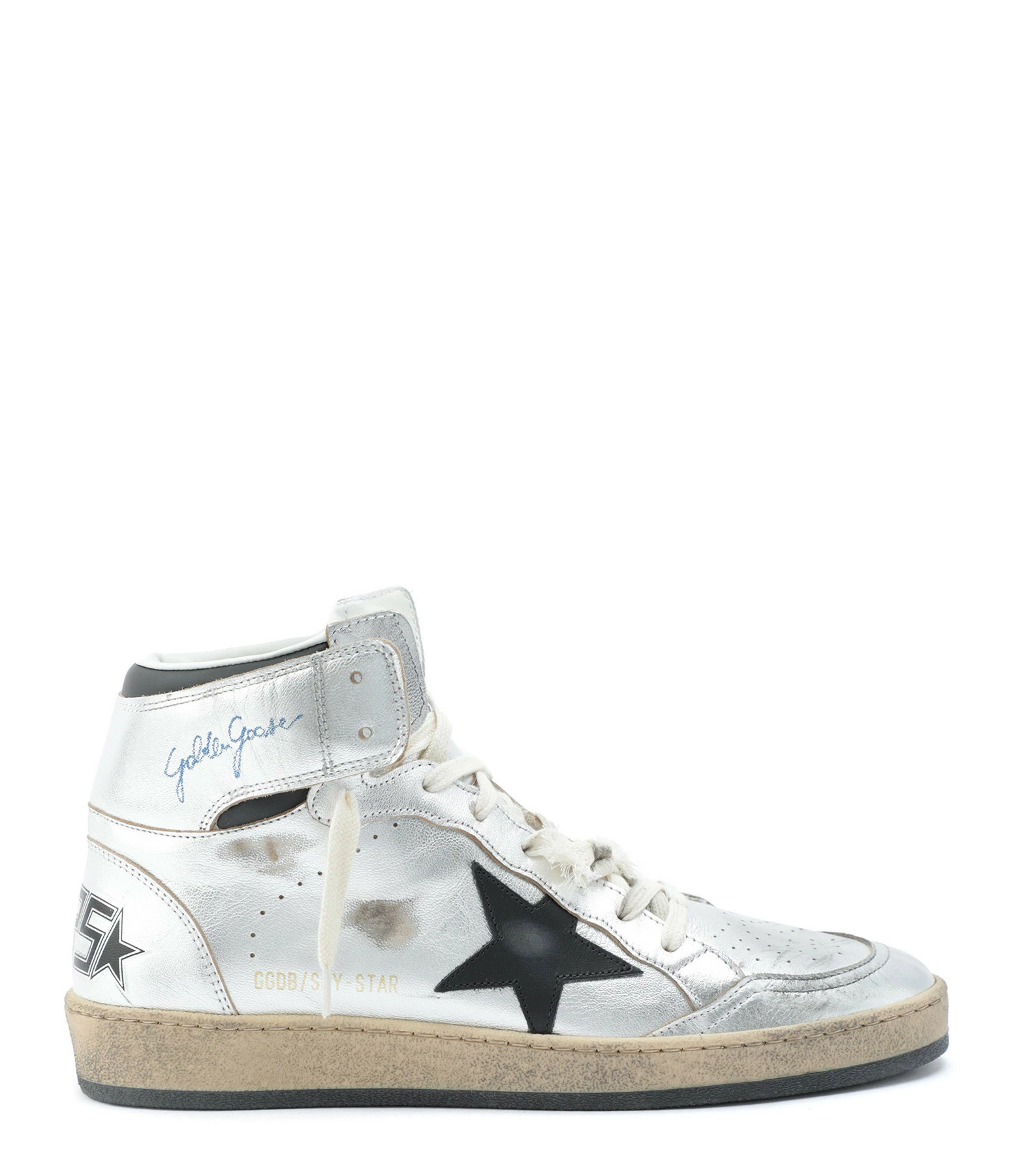 Baskets montantes pour homme en cuir lisse argenté. Empiècement étoile en cuir lisse noir. Lacets écrus. Sérigraphie “Golden Goose” sur le côté. Inscription “SNEA” sur le talon gauche et “KERS” sur le talon droit et “GGDB / SKY-STAR” sur le côté extérieur du pied droit. Intérieur en cuir et maille bouclette.