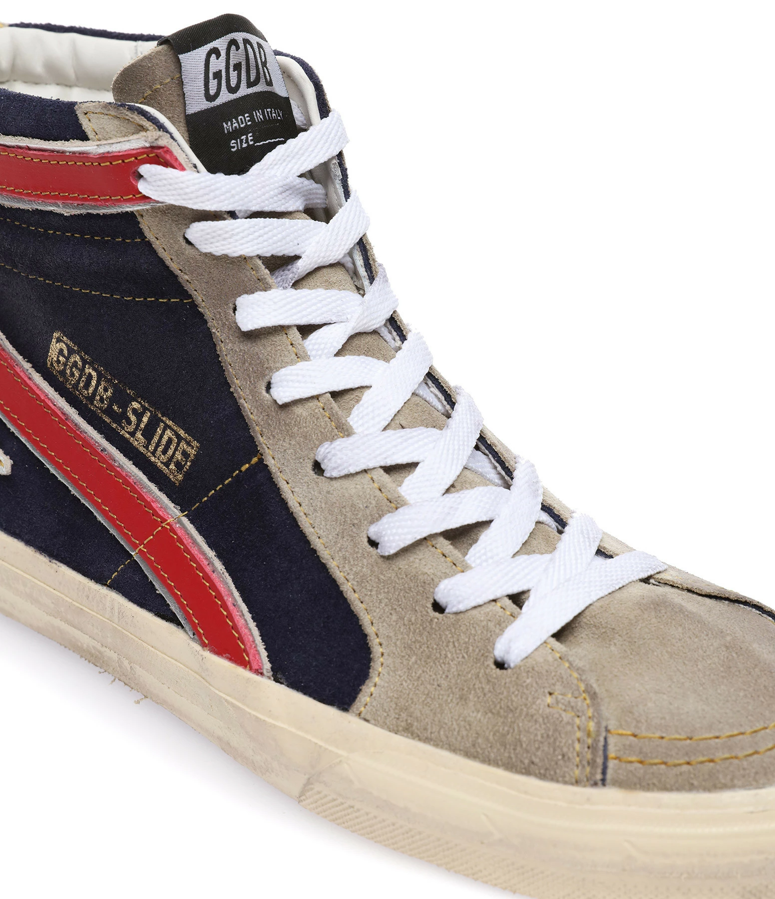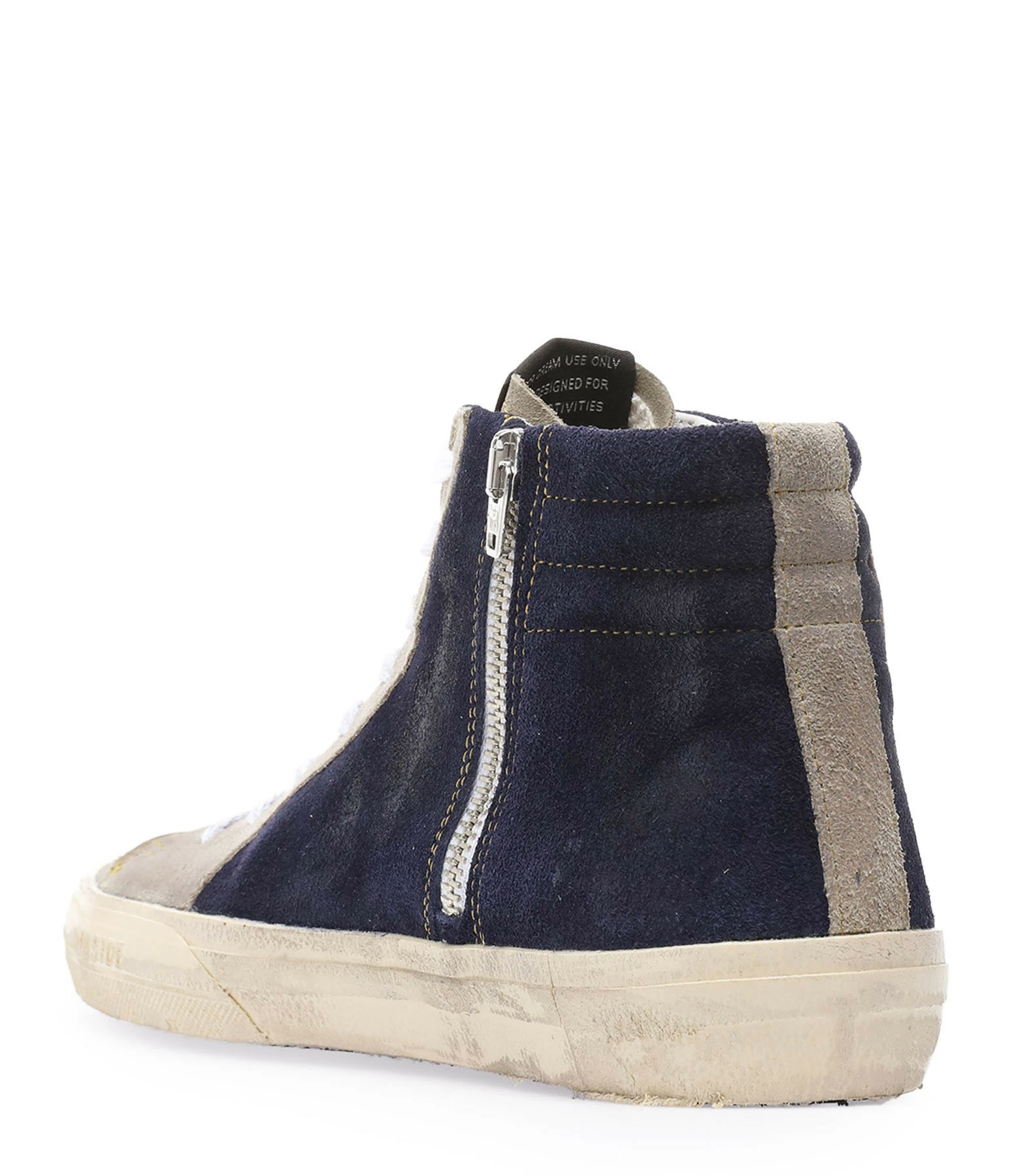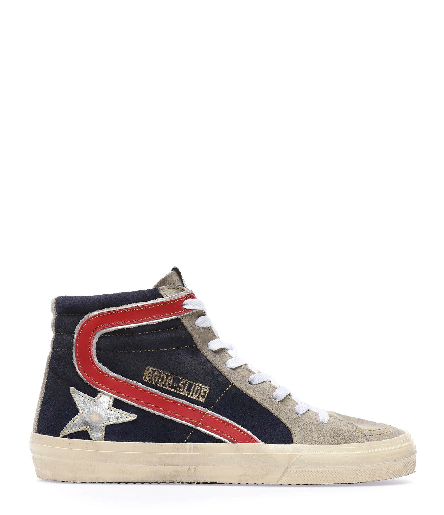 Baskets montantes pour homme en cuir bleu marine et taupe. Empiècement étoile en cuir argenté. Liséré en cuir rouge. Lacets gris. Fermeture par zip sur le côté. Inscription “GGDB-SLIDE” sur le côté extérieur. Intérieur en cuir et maille bouclette.
