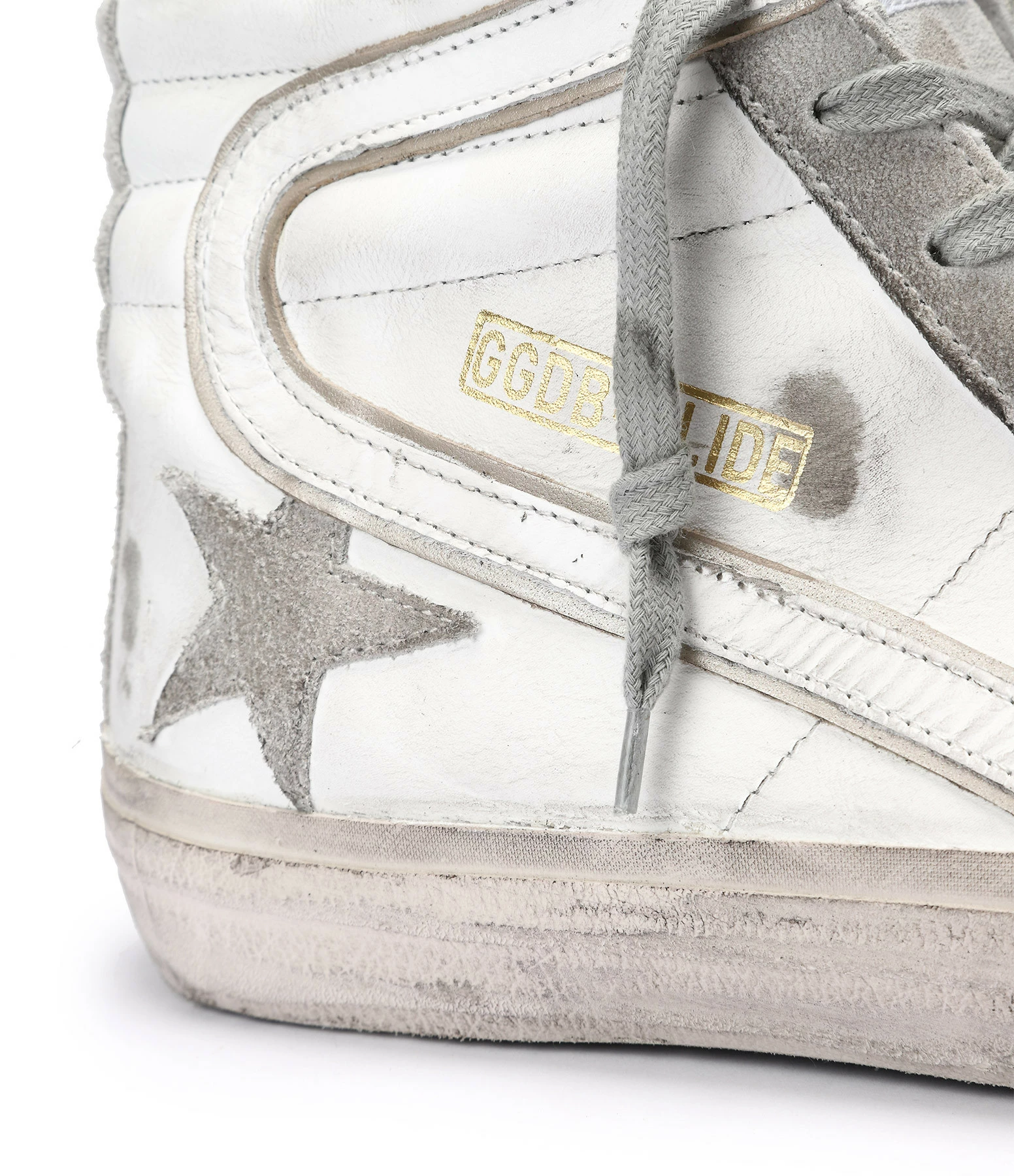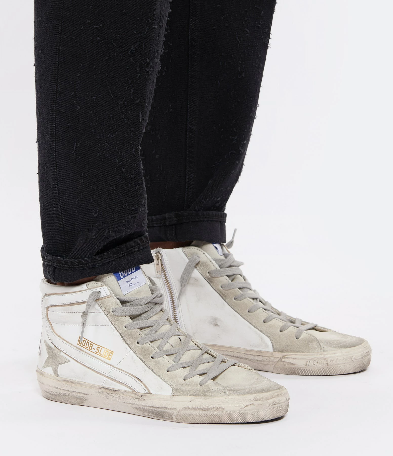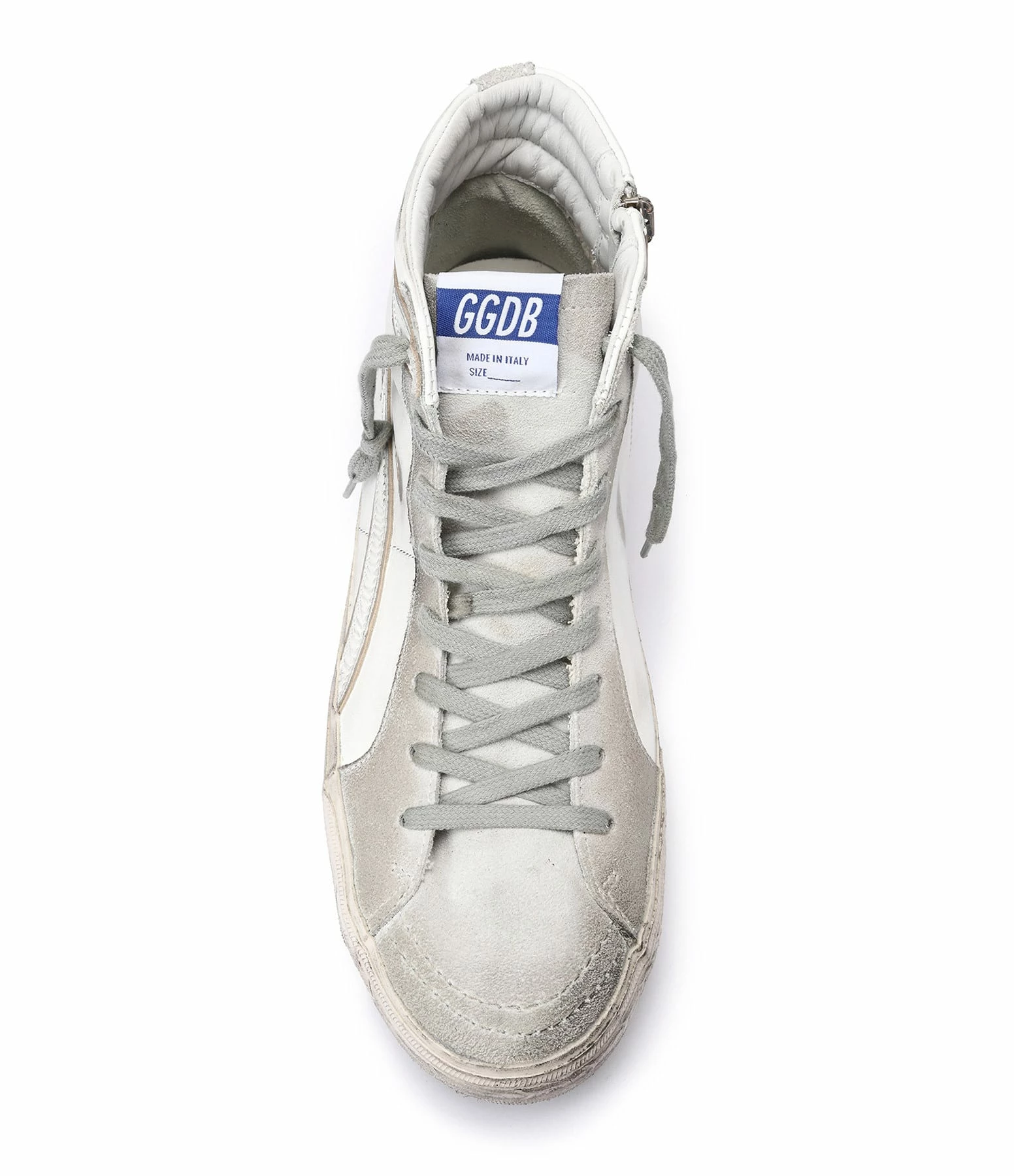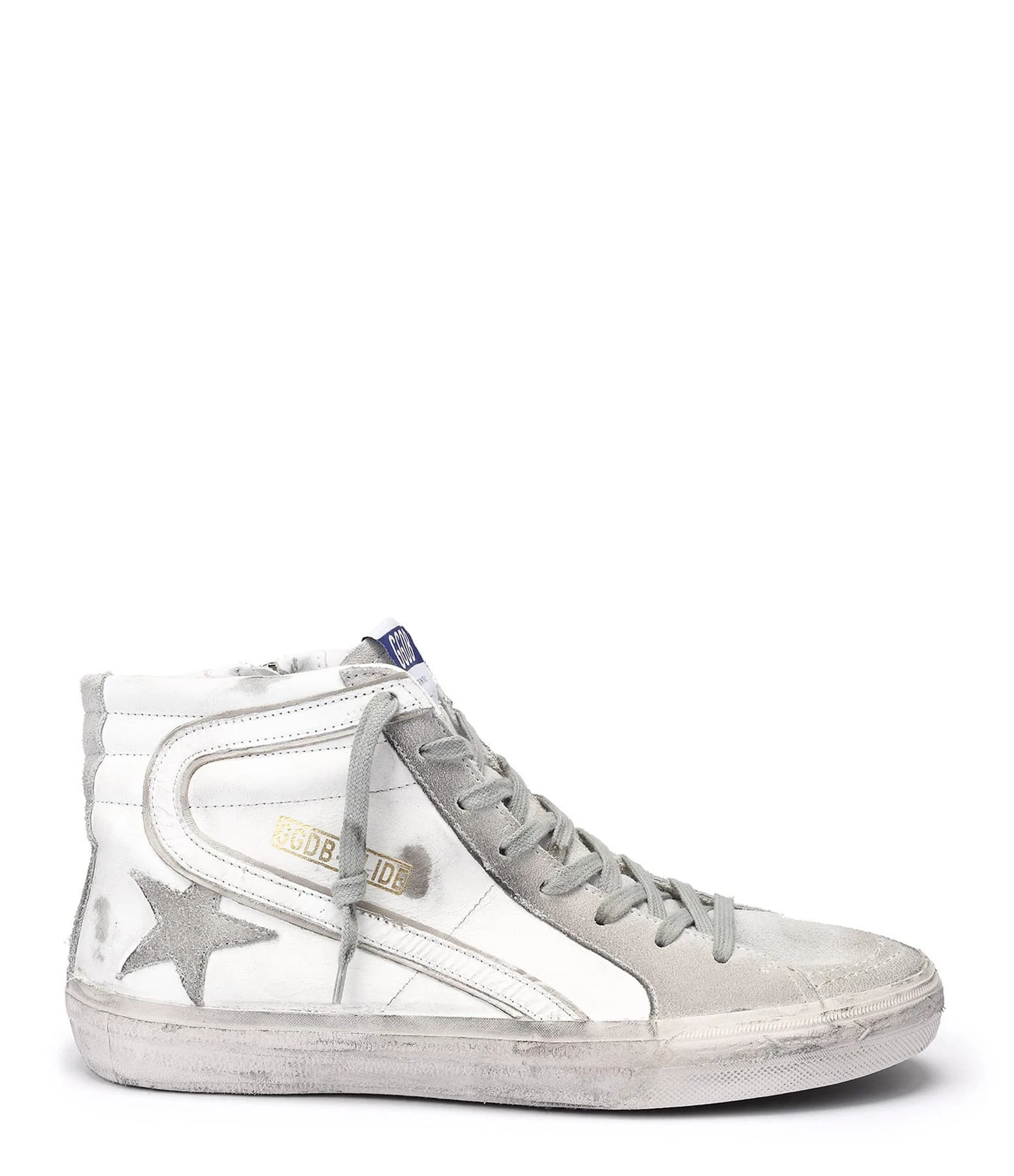 Baskets montantes pour homme en cuir lisse blanc. Empiècement étoile, talon et languette en cuir suédé gris. Lacets gris. Fermeture par zip sur le côté. Intérieur en maille bouclette et cuir.