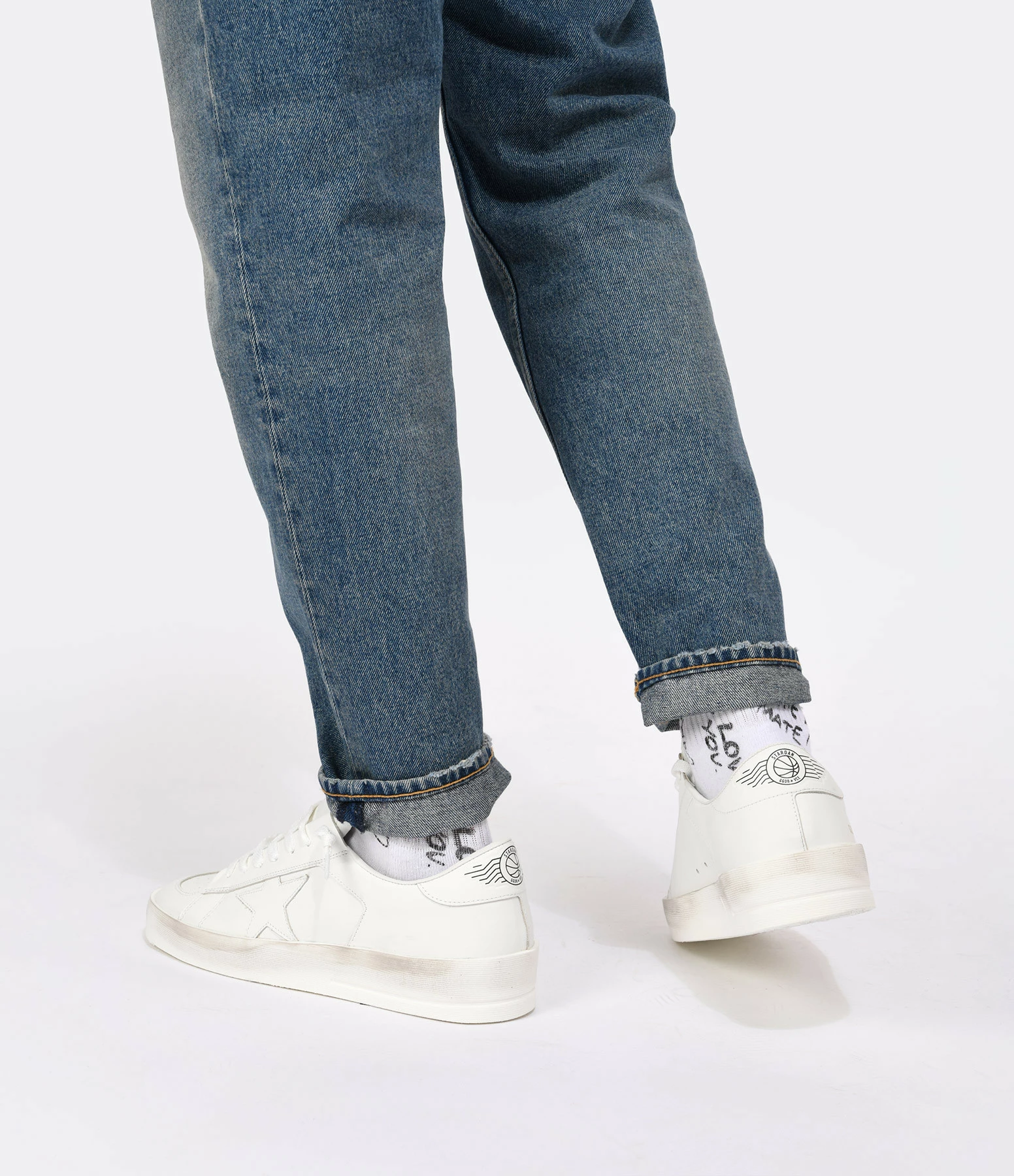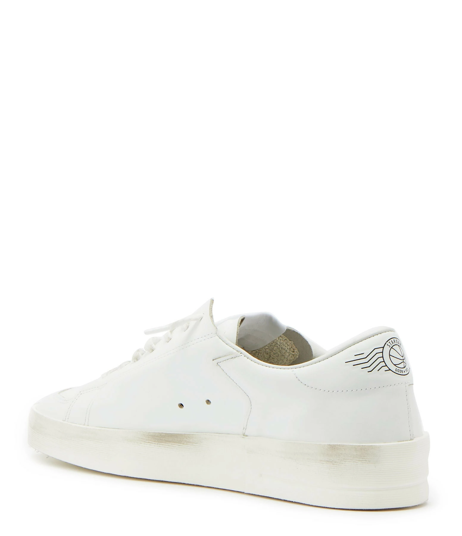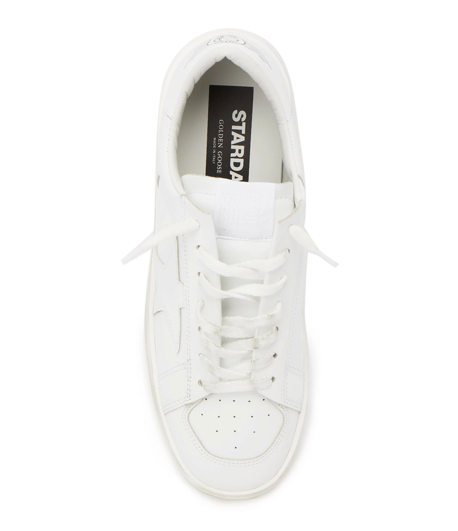 Baskets basses en cuir lisse blanc, pour homme. Empiècement étoile. Renfort talon avec logo “Stardan”. Inscription “STARDAN” sur la semelle extérieure droite et “GGDB/STARDAN” sur le côté extérieur du pied droit. Intérieur en cuir et maille bouclette.