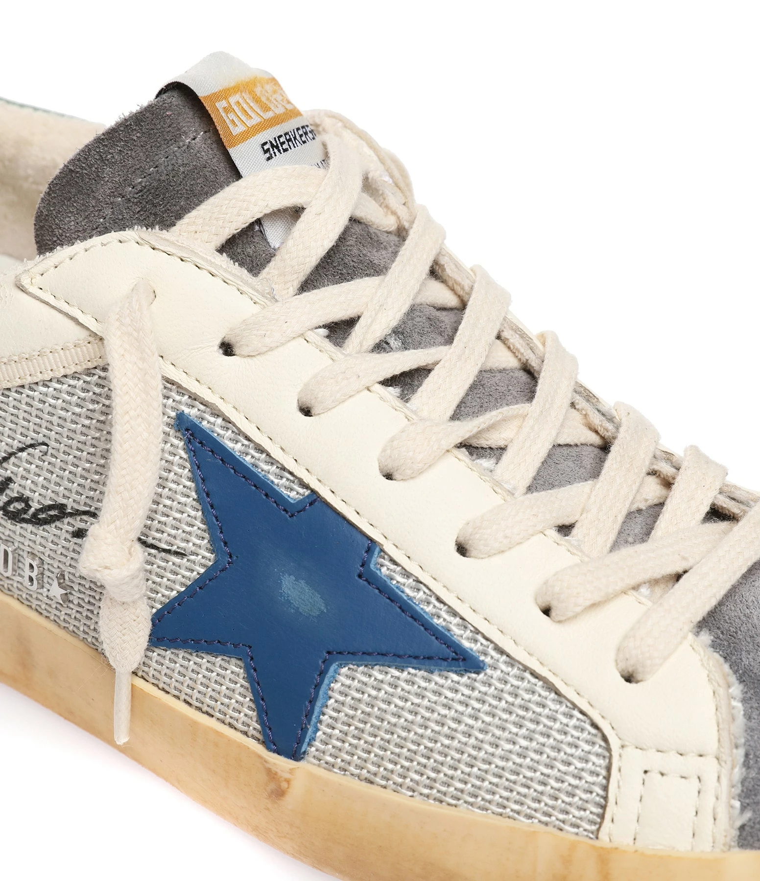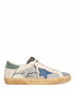 Baskets basses pour homme en cuir lisse blanc. Empiècement étoile en cuir lisse bleu. Renfort talon en cuir suédé kaki. Lacets blancs. Intérieur en maille bouclette et cuir. Inscription “GGDB/SSTAR” sur le côté extérieur.