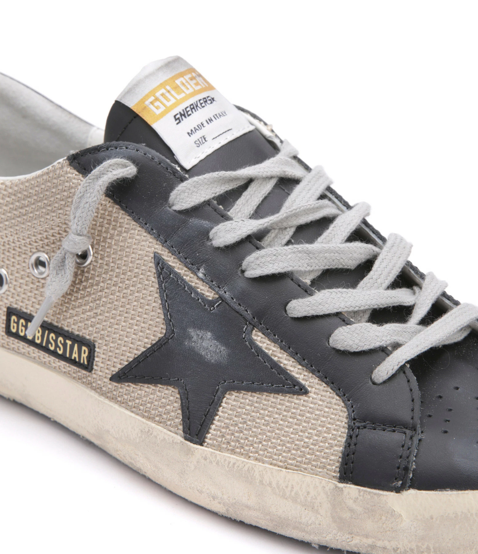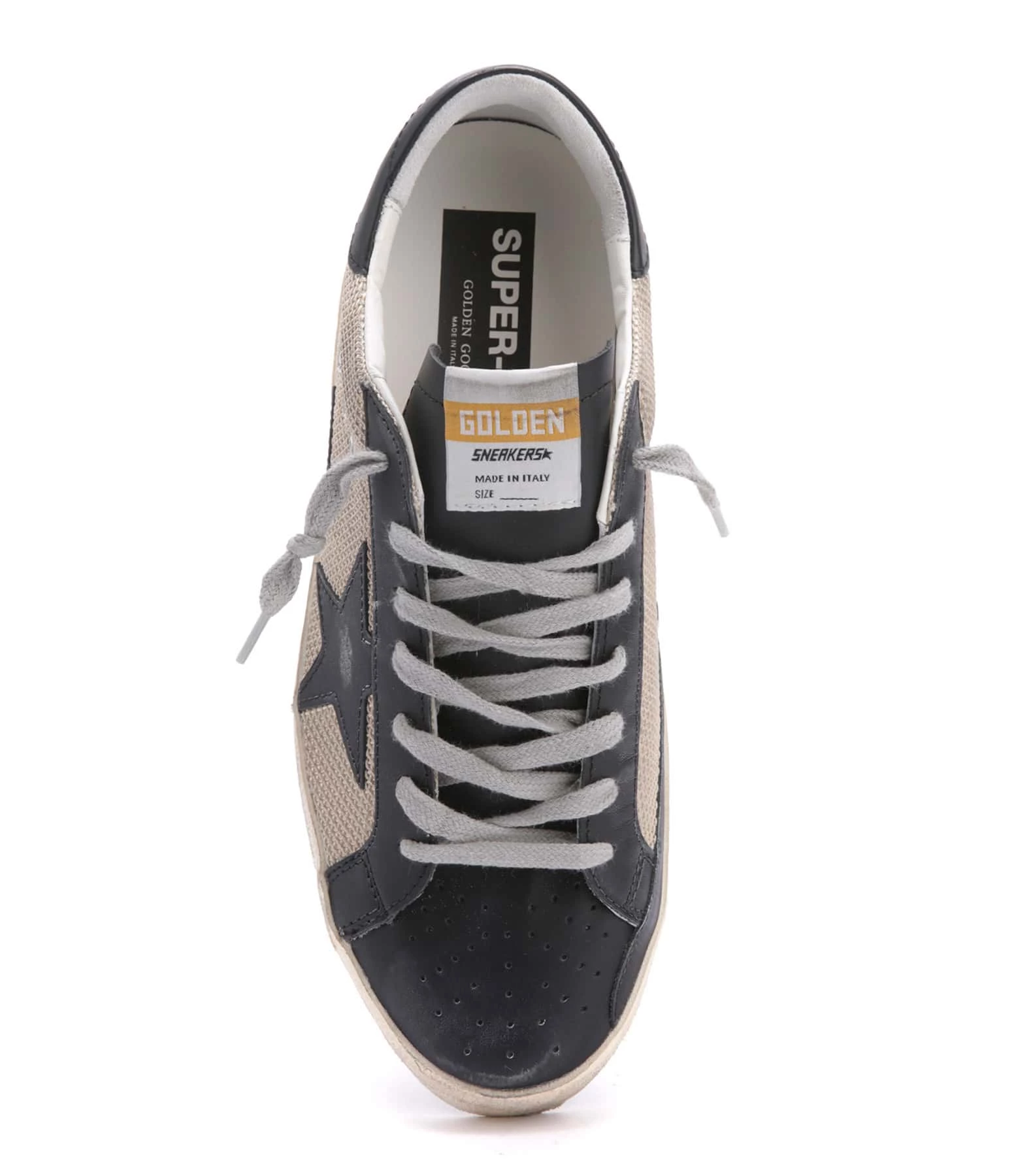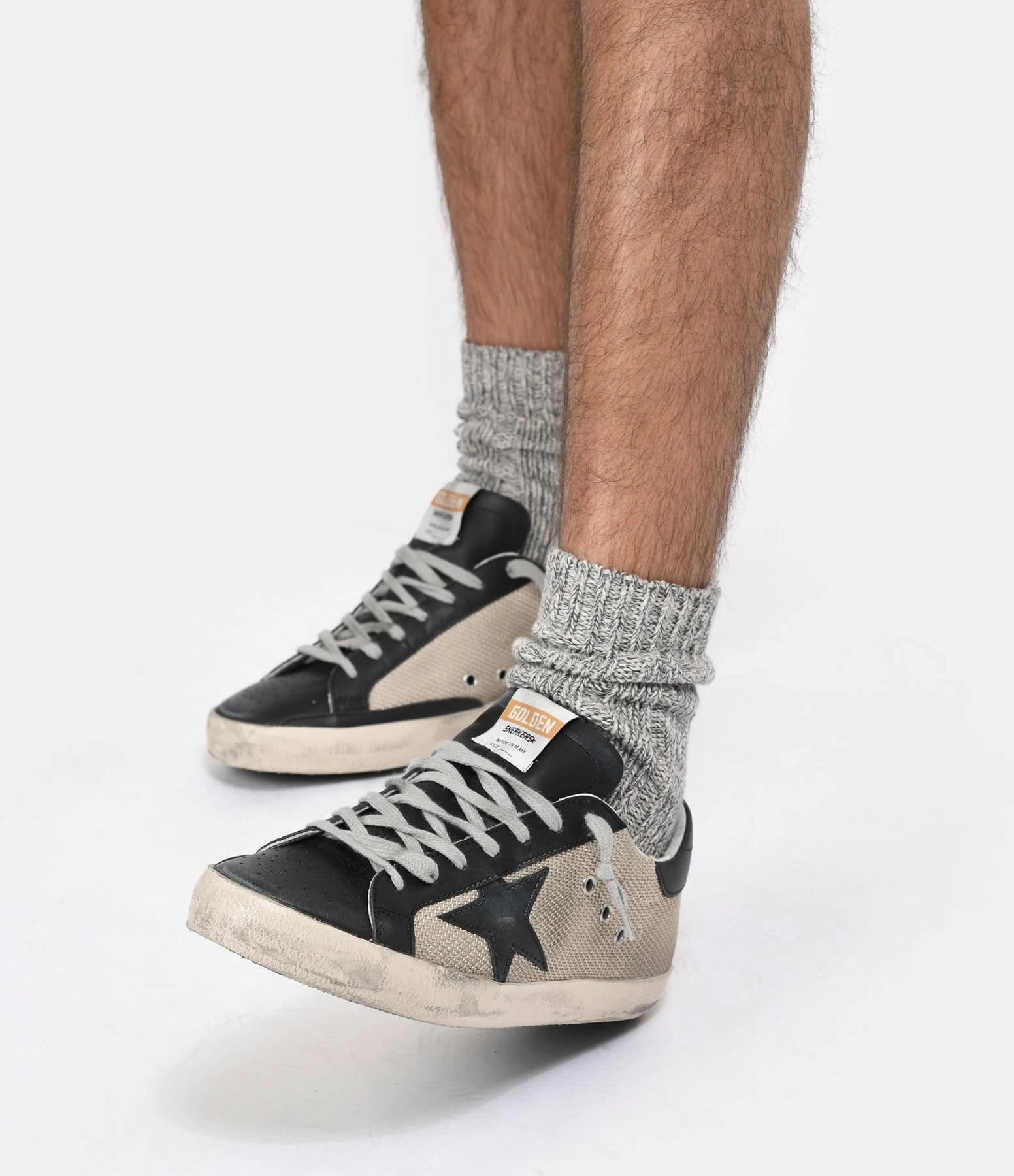 Baskets basses pour homme en maille filet. Languette en cuir lisse noir. Empiècement étoile et renfort talon en cuir lisse noir. Lacets gris. Intérieur en maille bouclette et cuir. Inscription “GGDB/SSTAR” sur le côté extérieur.