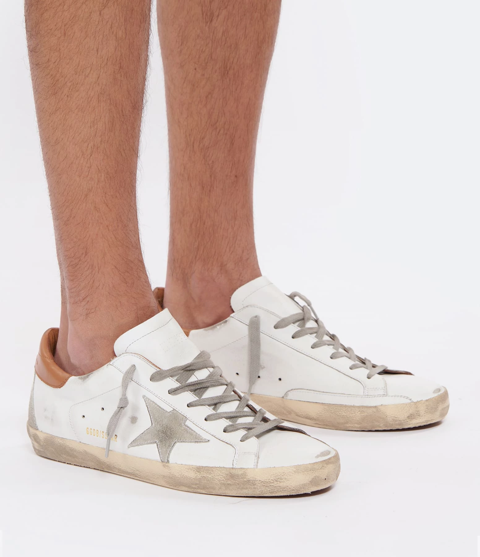 Baskets basses pour homme en cuir lisse blanc. Empiècement étoile en cuir suédé gris. Renfort talon en cuir lisse marron et suédé gris. Lacets gris. Intérieur en maille bouclette et cuir. Inscription “GGDB/SSTAR” sur le côté extérieur.
