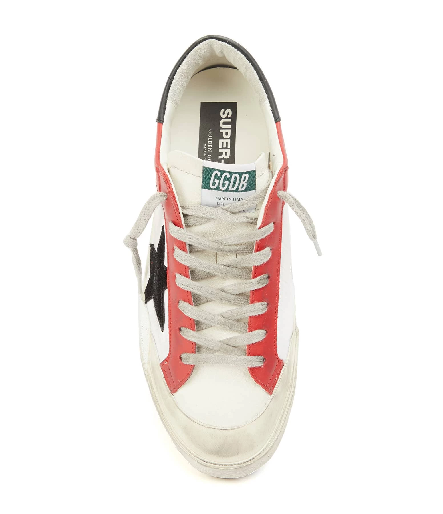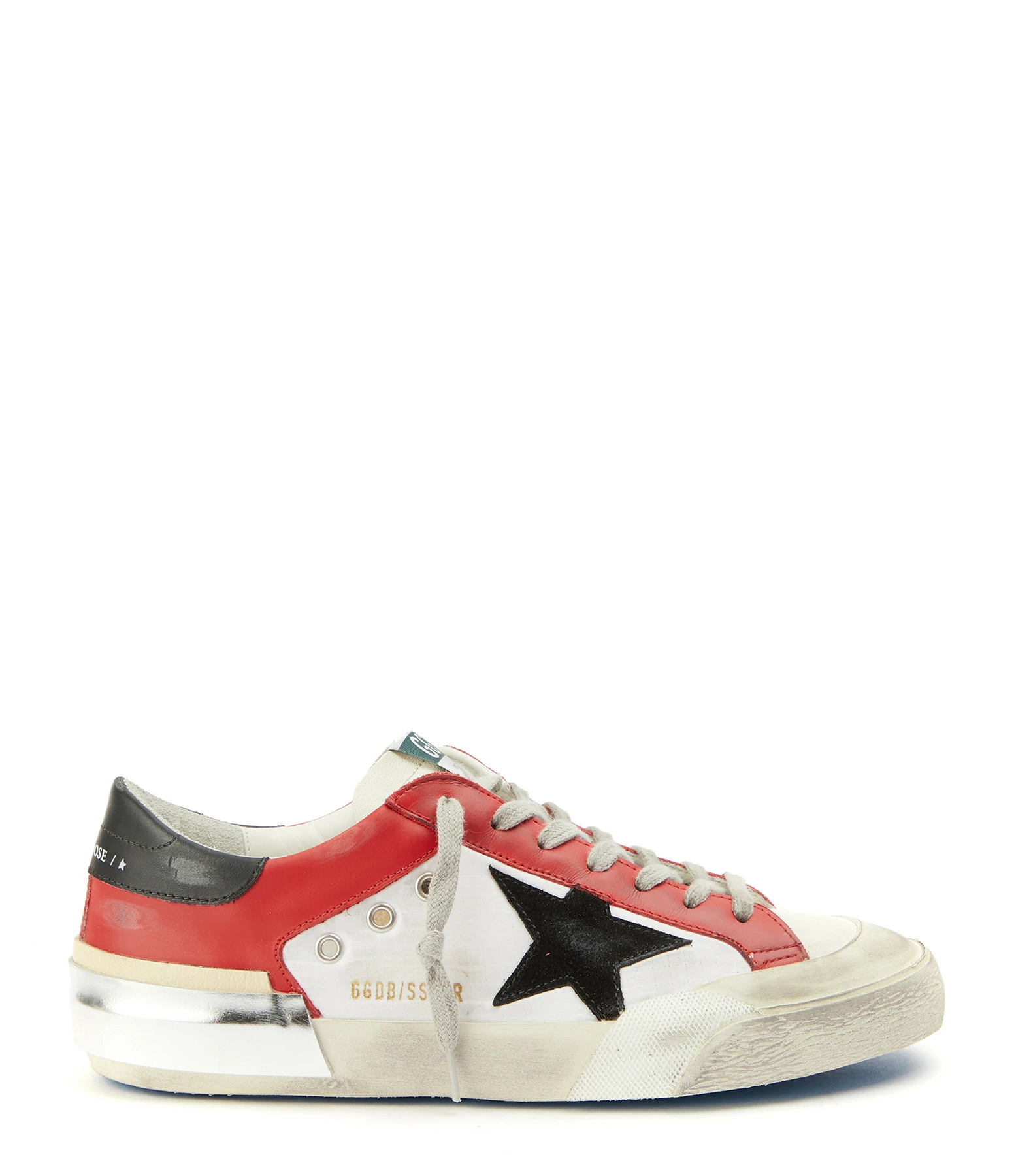 Baskets basses pour homme en toile imperméabilisée blanche. Lacets gris. Empiècement étoile en cuir suédé noir et renfort talon noir. Semelle bleue. Inscription “GGDB/SSTAR” sur le côté extérieur. Intérieur en maille bouclette et cuir.