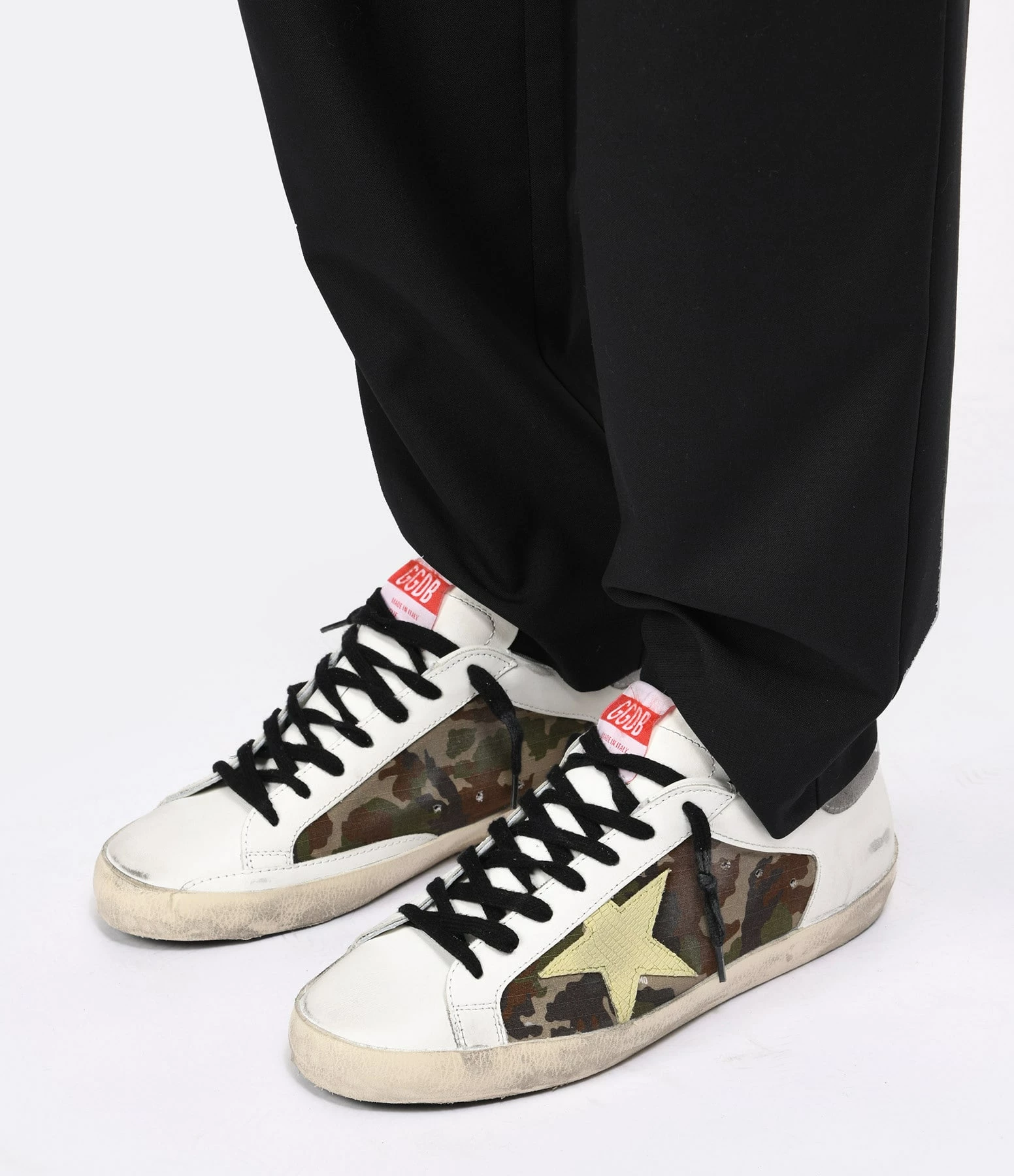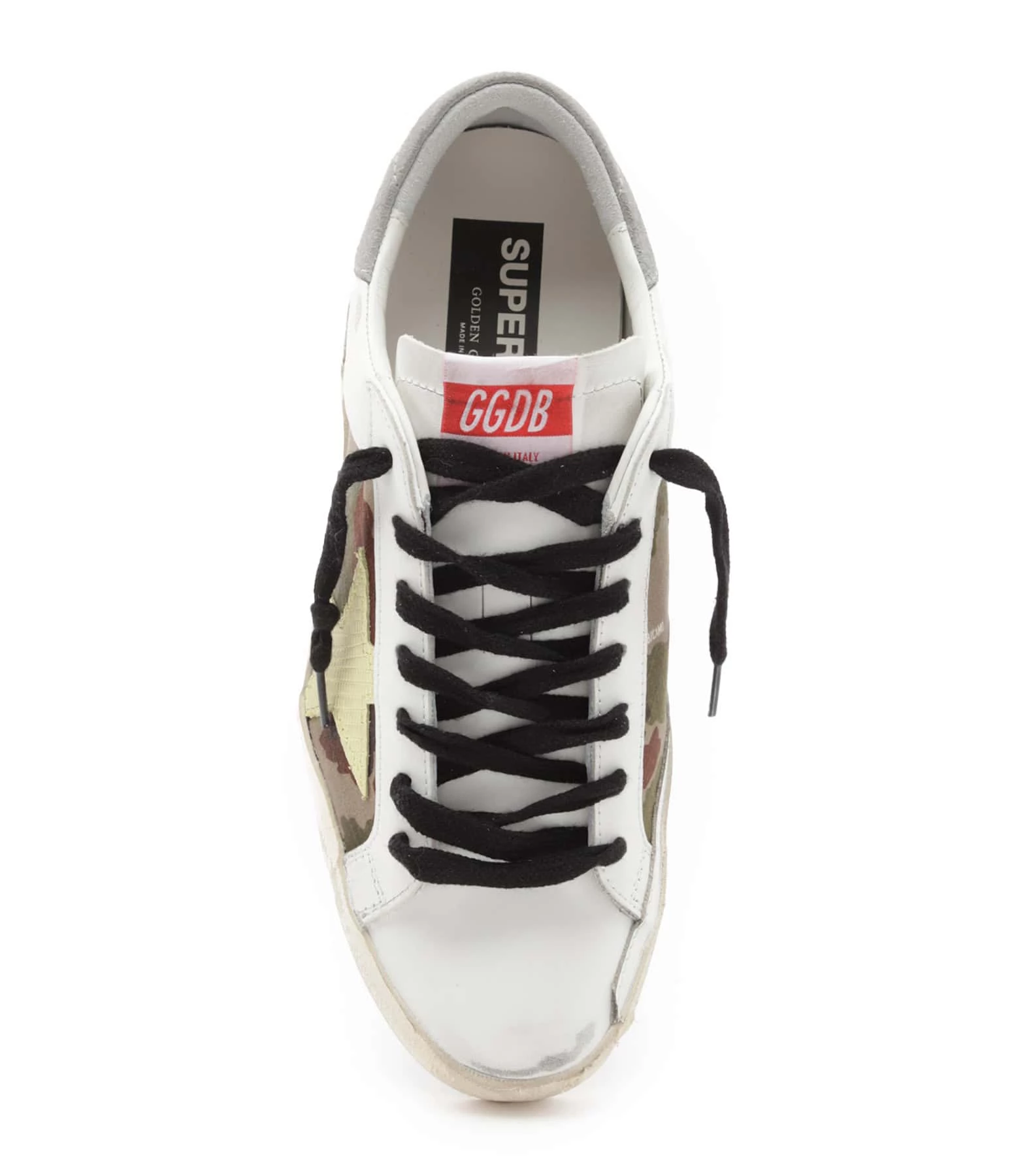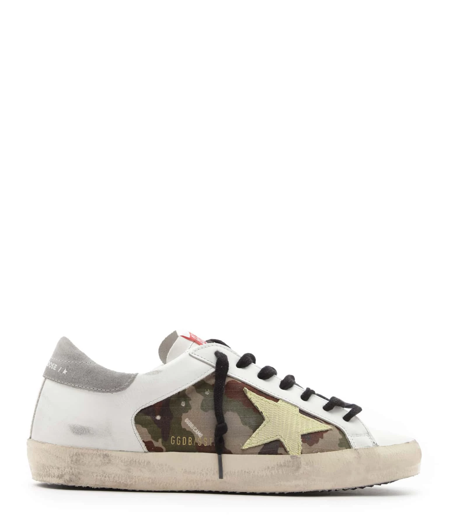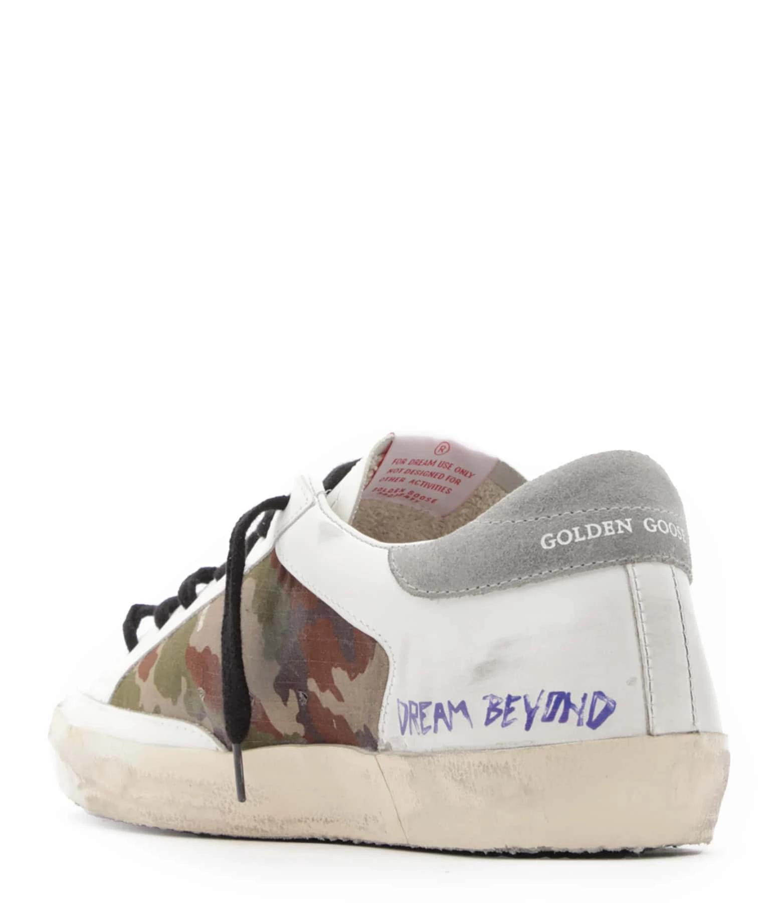 Baskets basses en cuir lisse blanc et imprimé camouflage. Empiècement étoile en cuir jaune. Renfort talon en cuir suédé gris. Lacets noir. Intérieur en maille bouclette et cuir. Inscription “GGDB/SSTAR” sur le côté extérieur. Inscription “DREAM BEYOND” sur le côté intérieur.